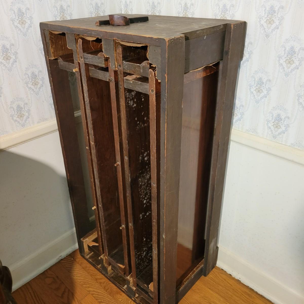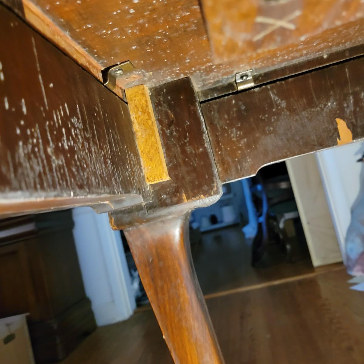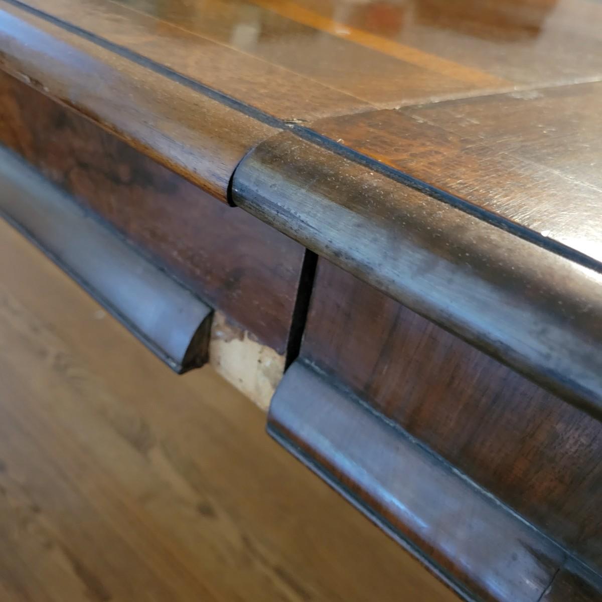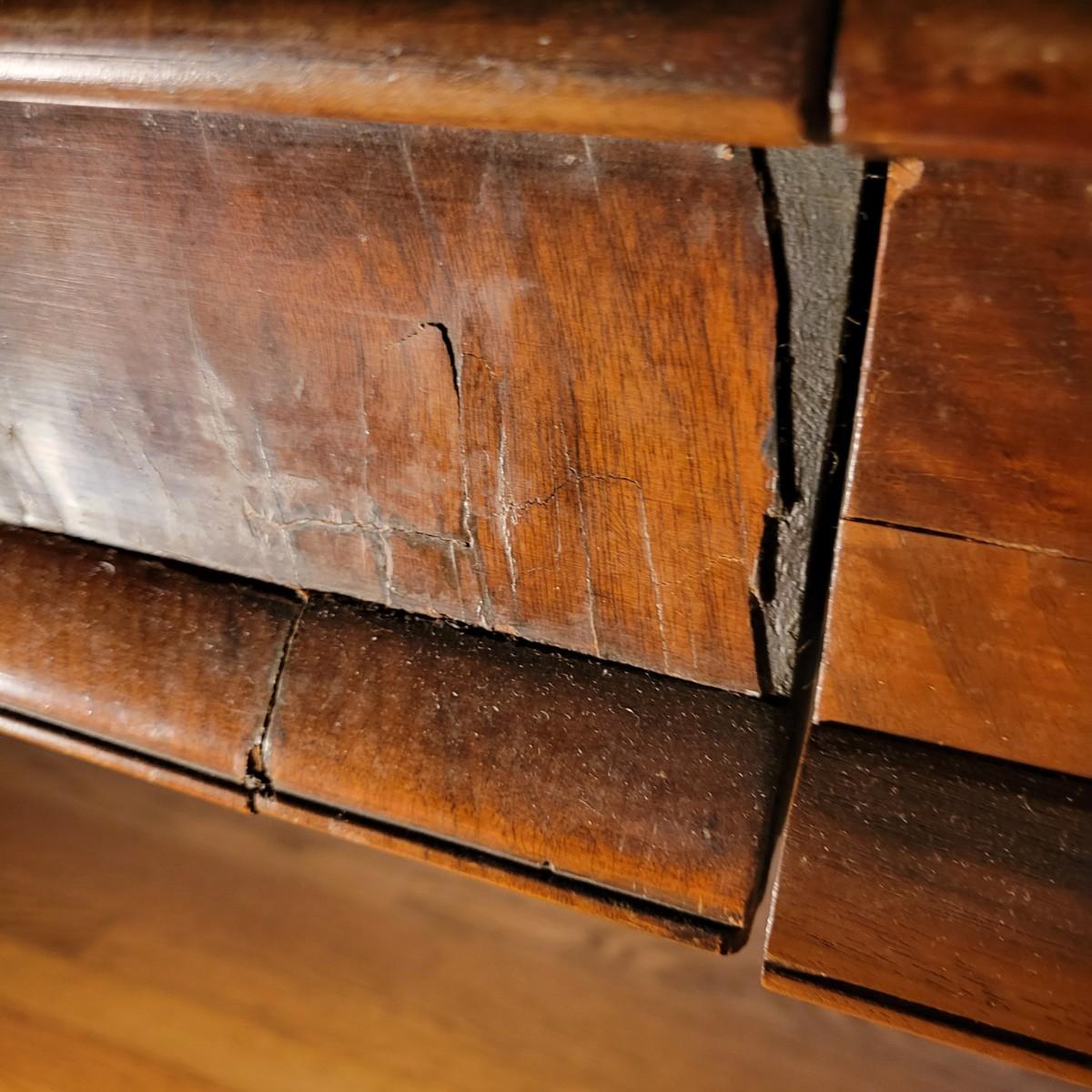 An antique, solid wood dining room table with an inlaid table top and veneered sides. Hand carved legs with beautiful detail and five 14.75" leaves to make an exceptionally long table. Five leaves also have a storage rack for convenience and protecting the leaves. This table is in good condition with some notable scratches, pits and bubbling veneer, but is still functional and beautiful. See attached pictures for more detail. Without leaves, table measures approximately 70" x 42" x 30". All five leaves would increase its length to approximately 144". Also included is a multi-piece custom table cover for protection. Crate for leafs measures approximately 23.5" x 17" x 46" Local pickup only. **The winning bidder will need to bring help to move this table from the ground floor of the house, as the item is substantial. Please make sure you bring a truck/trailer large enough to fit the long table.**