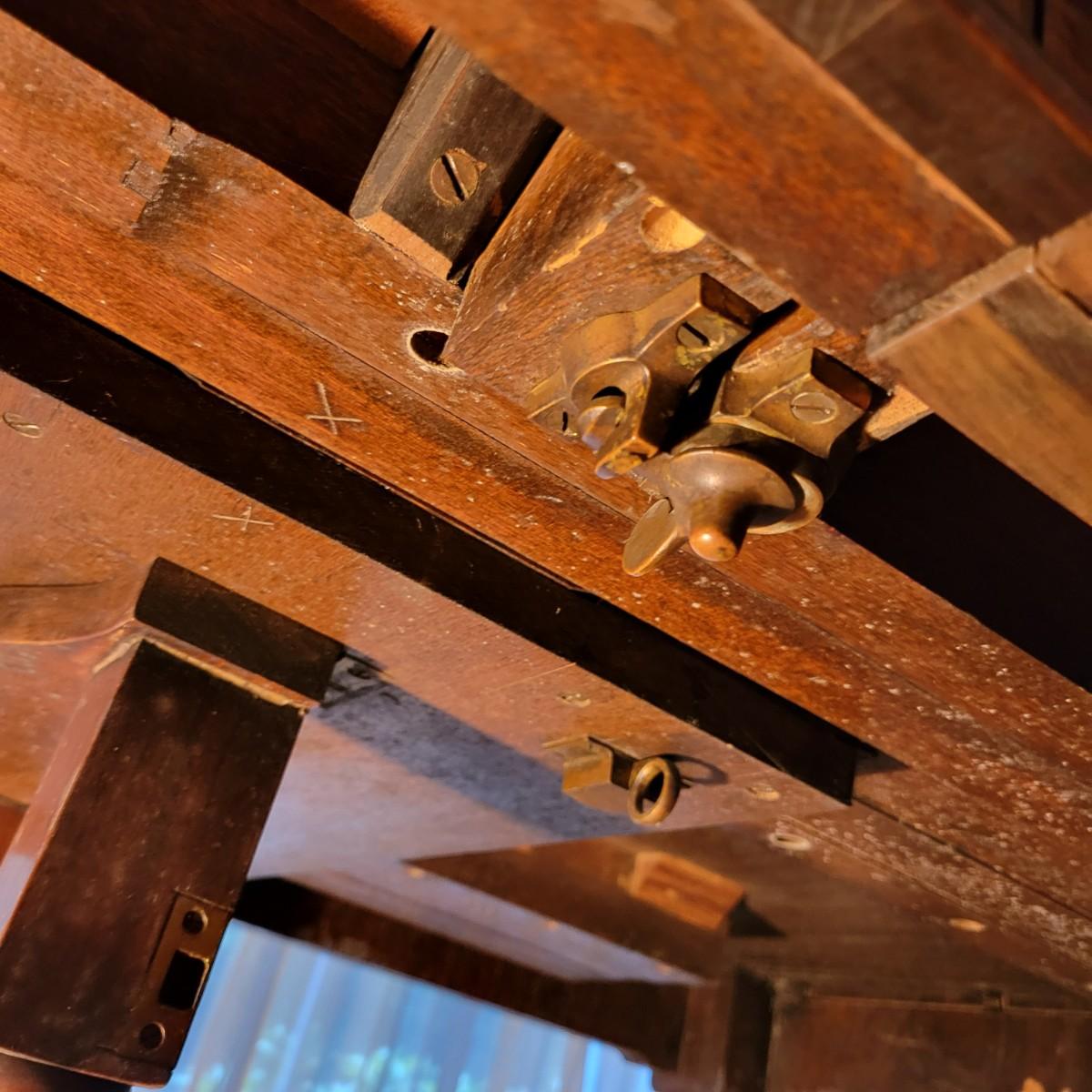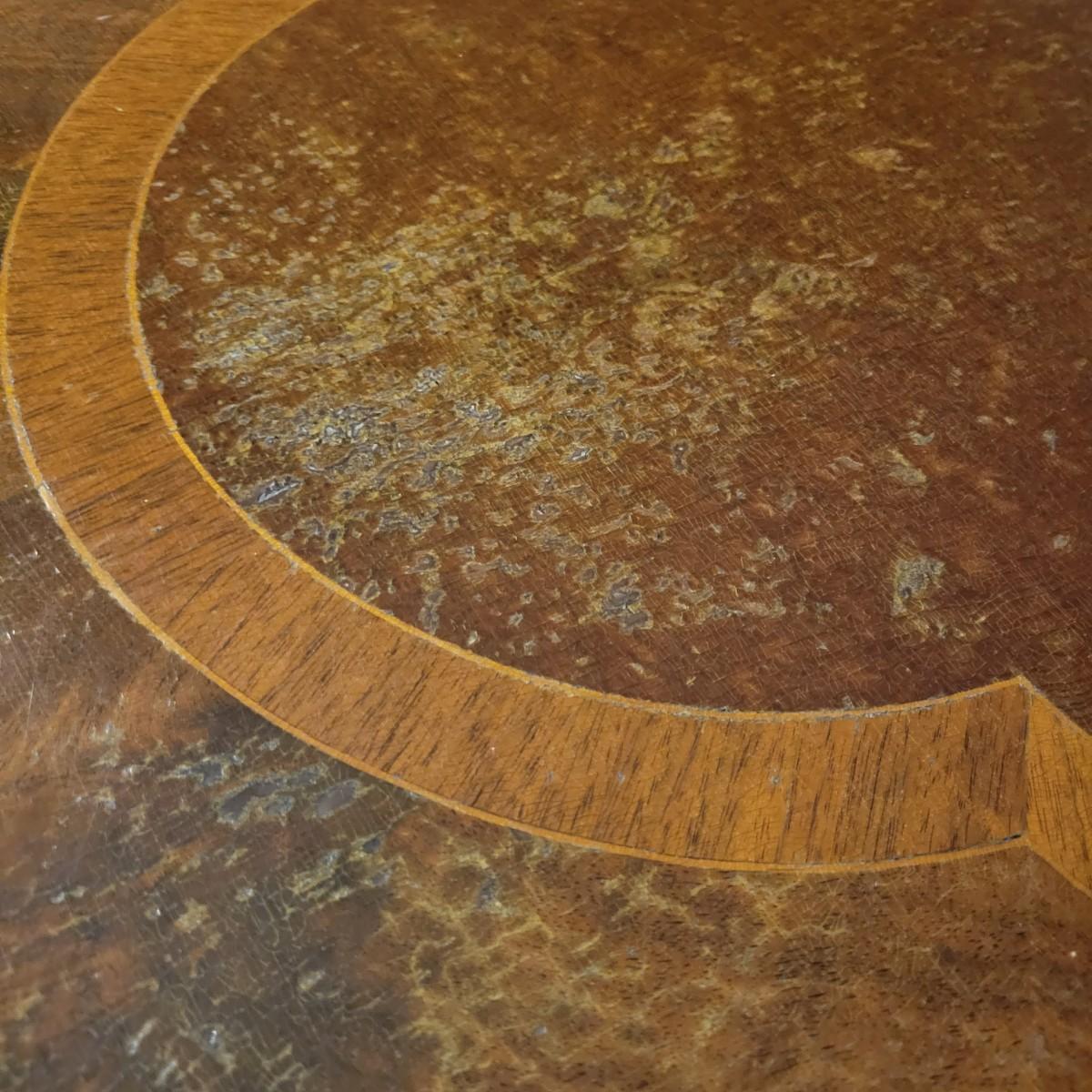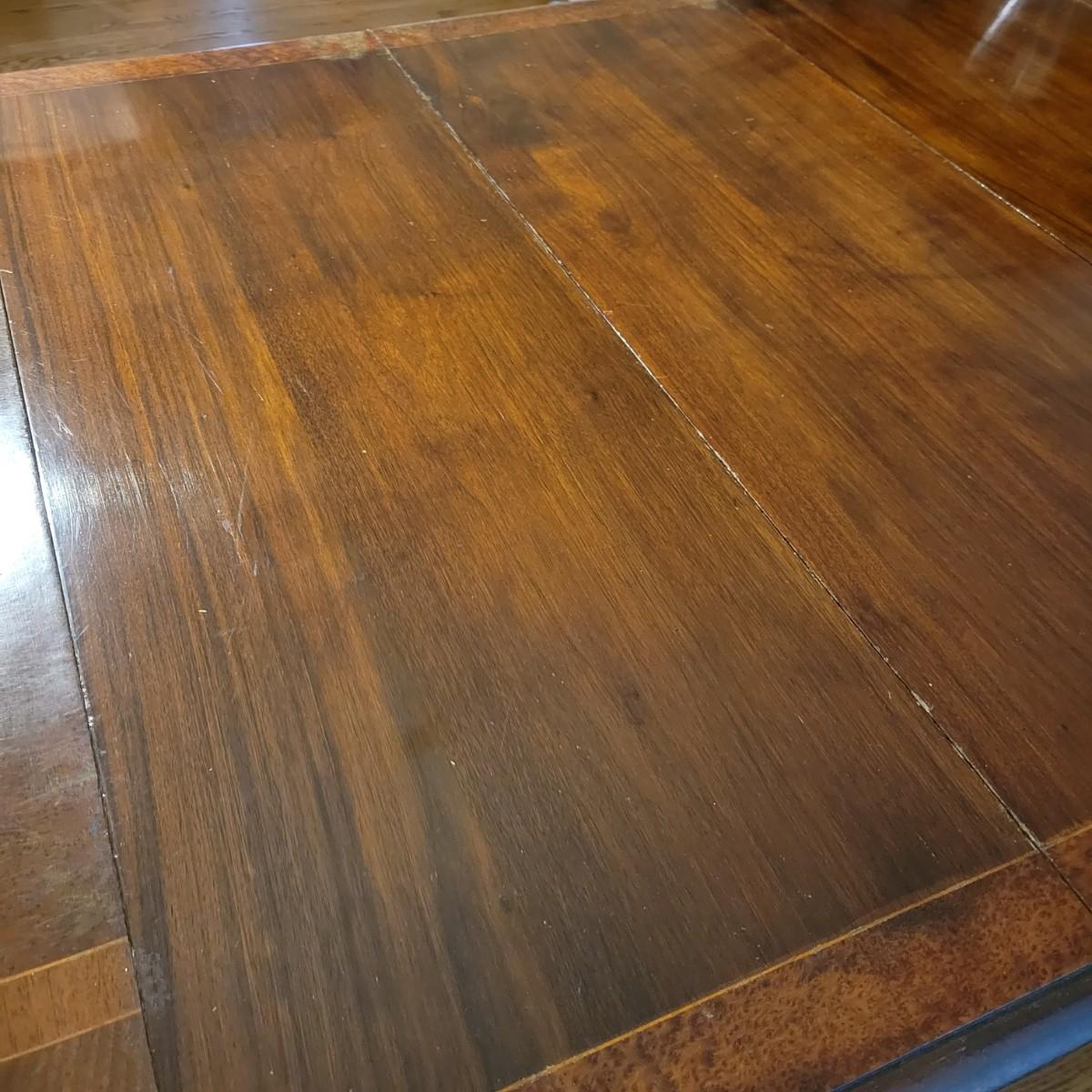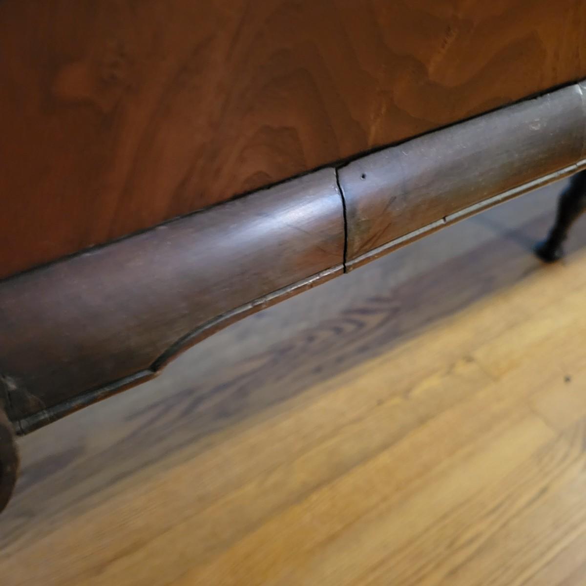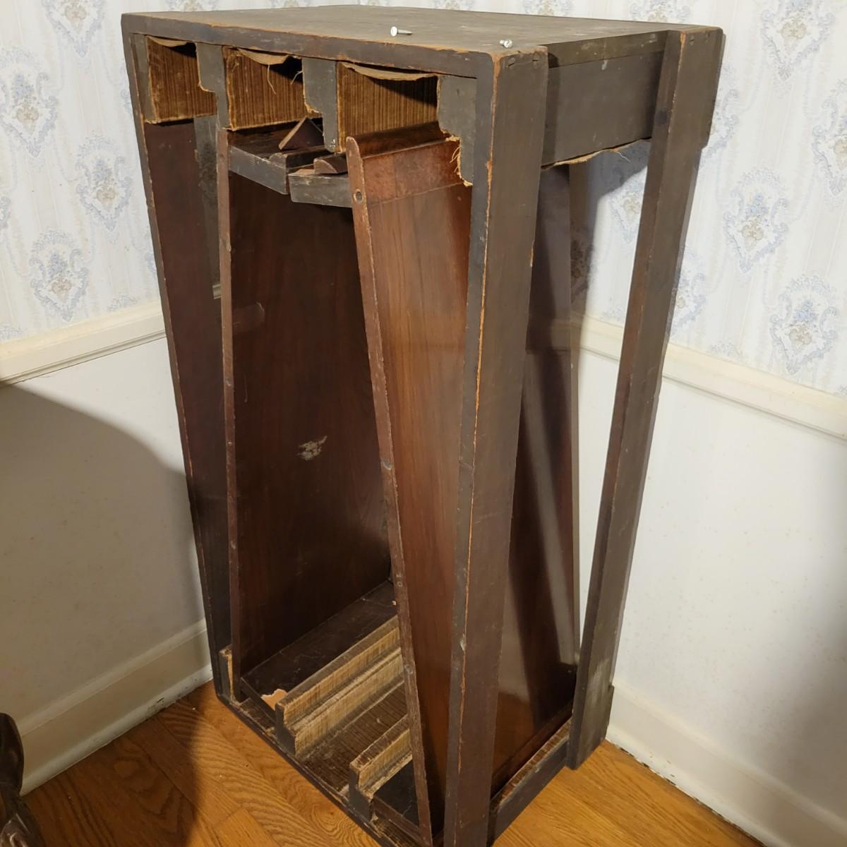 An antique, solid wood dining room table with an inlaid table top and veneered sides. Hand carved legs with beautiful detail and five 14.75" leaves to make an exceptionally long table. Five leaves also have a storage rack for convenience and protecting the leaves. This table is in good condition with some notable scratches, pits and bubbling veneer, but is still functional and beautiful. See attached pictures for more detail. Without leaves, table measures approximately 70" x 42" x 30". All five leaves would increase its length to approximately 144". Also included is a multi-piece custom table cover for protection. Crate for leafs measures approximately 23.5" x 17" x 46" Local pickup only. **The winning bidder will need to bring help to move this table from the ground floor of the house, as the item is substantial. Please make sure you bring a truck/trailer large enough to fit the long table.**