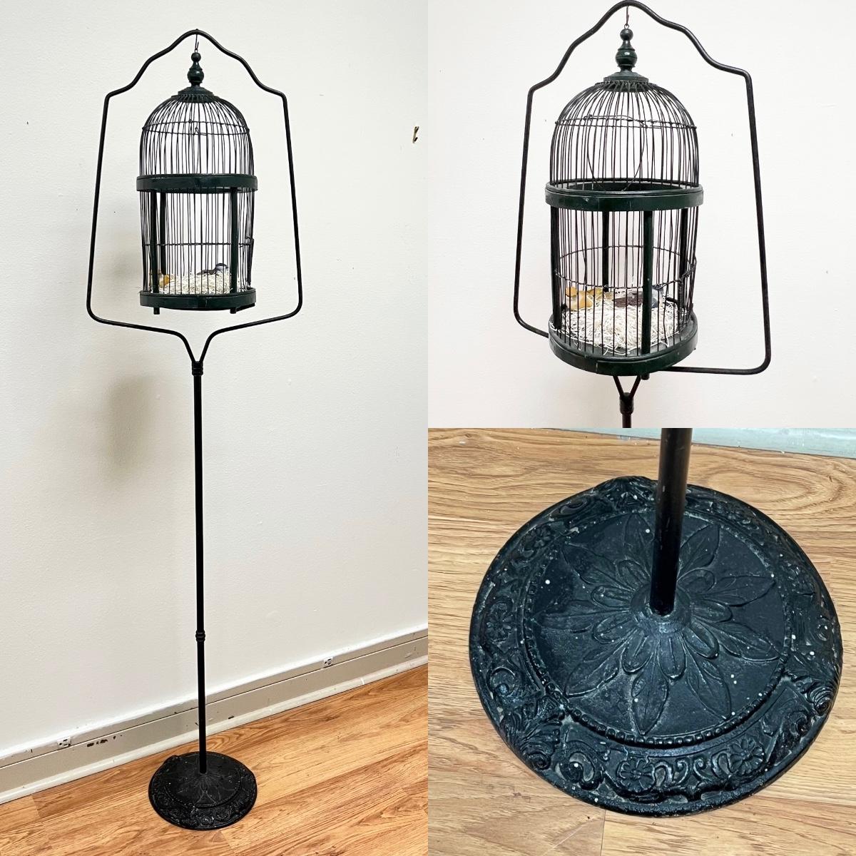 Bird cage is metal & wood ~ Stand = 65” H x 17” W x 10 D ~ Bird cage = 18” H x 19” Round