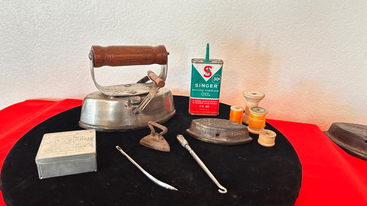 ANTIQUE IRON, GUNNY SACK NEEDLES, TOY IRON, OIL CAN AND MORE