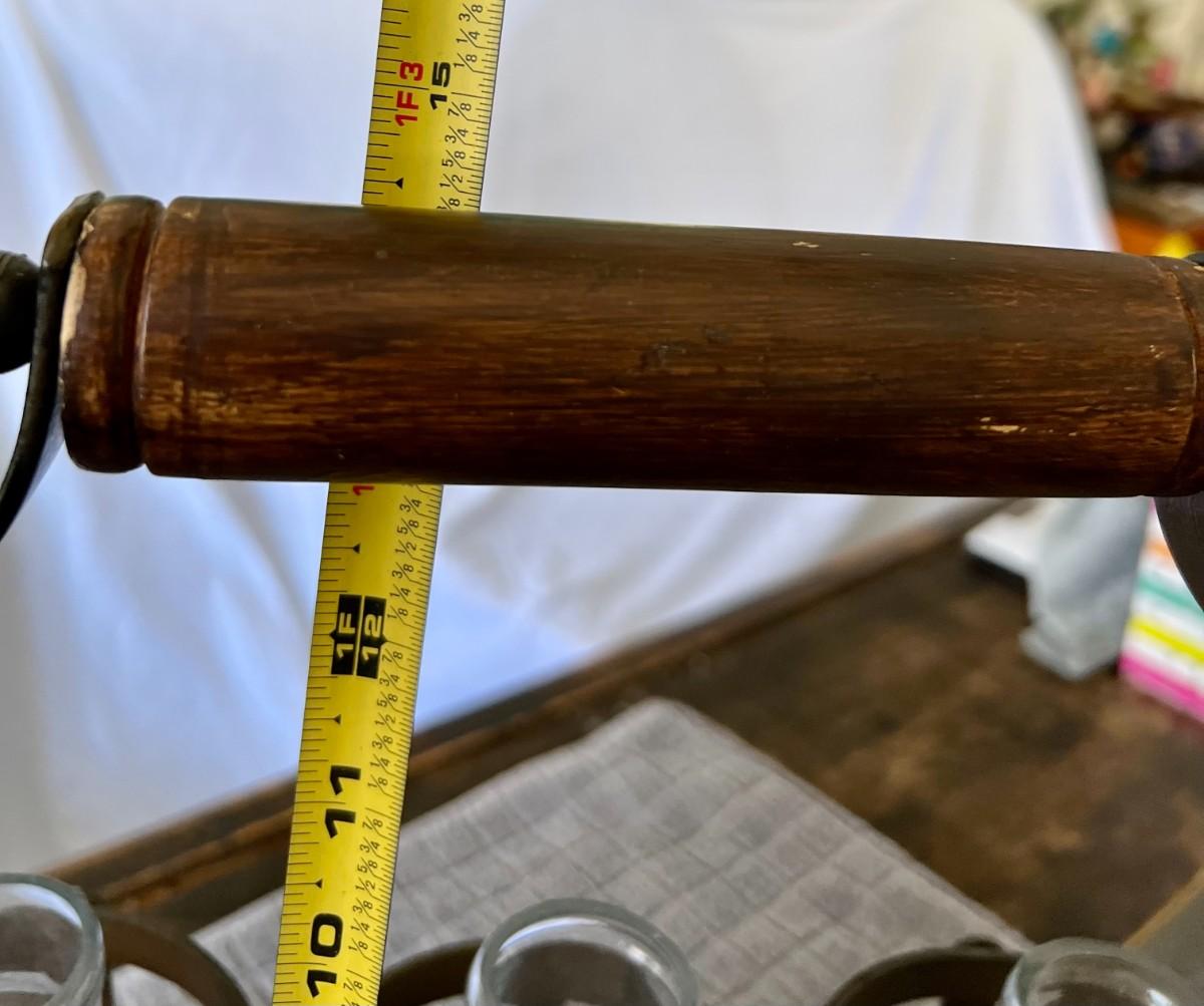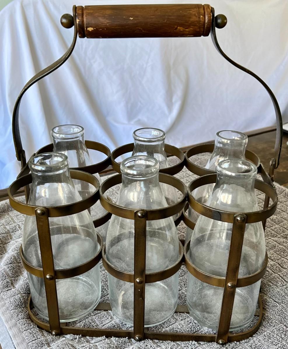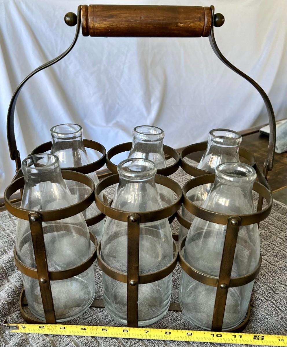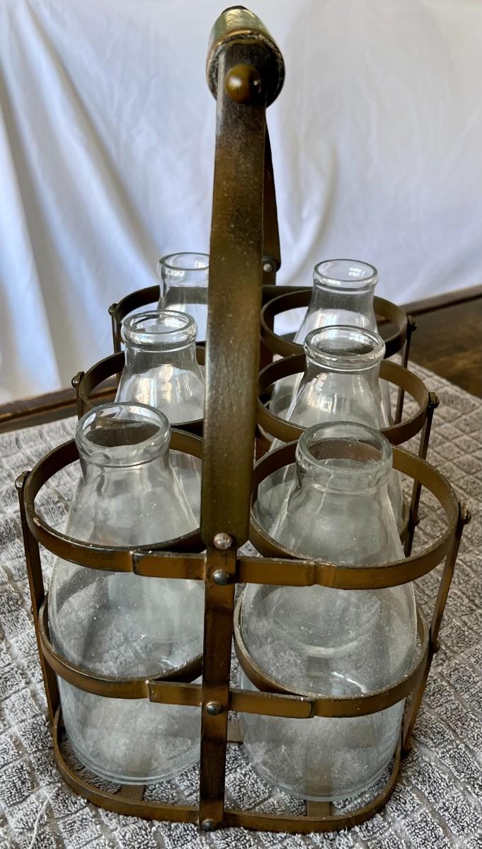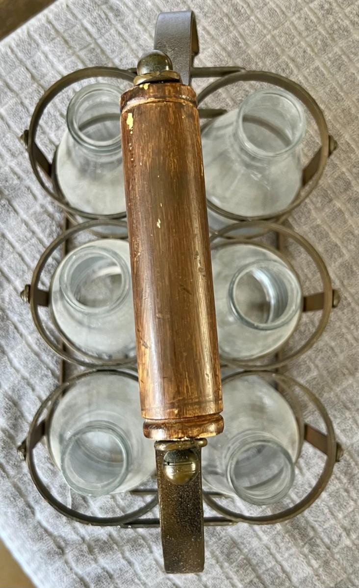 Antique Iron Milk Bottle Carrier with Wooden Handle and Glass Bottles
