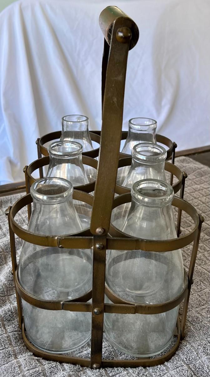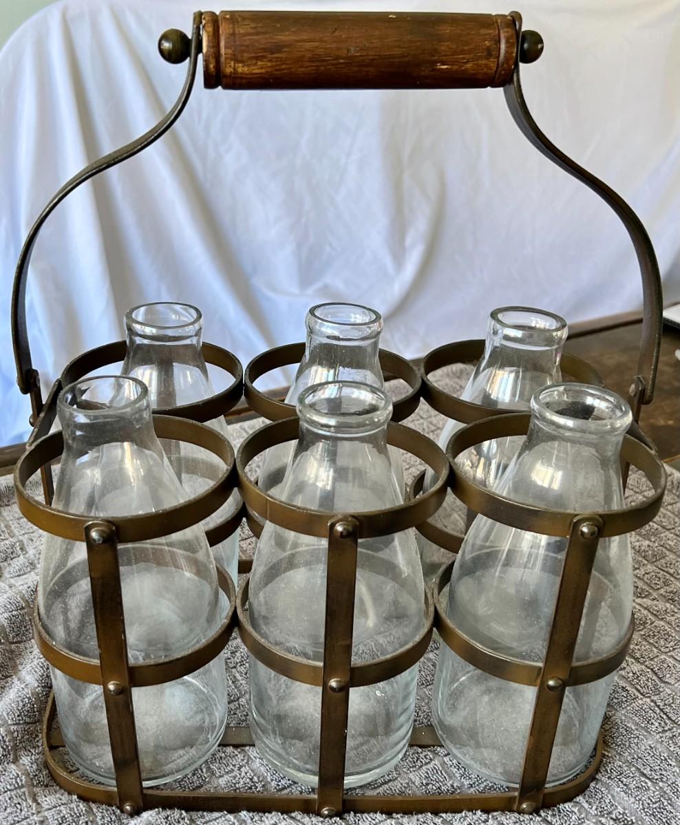 Antique Iron Milk Bottle Carrier with Wooden Handle and Glass Bottles.
