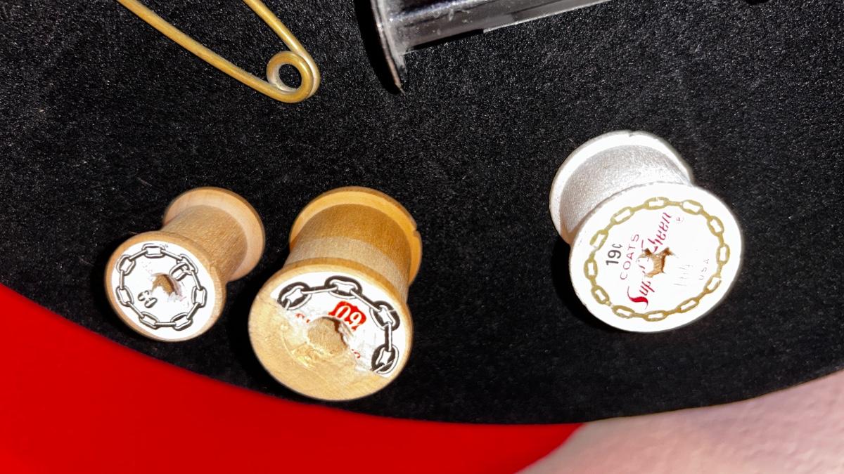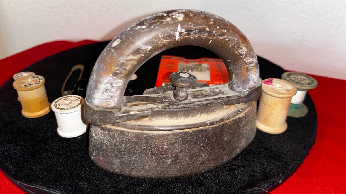 ANTIQUE IRON, THIMBLES, NEEDLE THREADER AND OTHER LIKE ITEMS