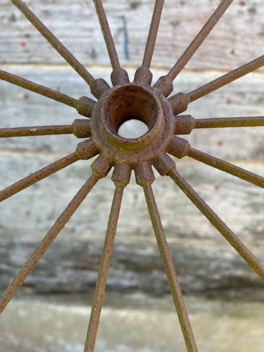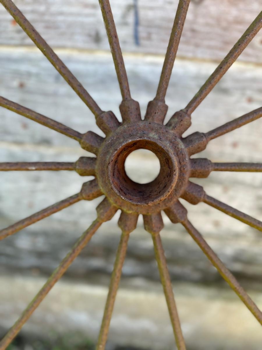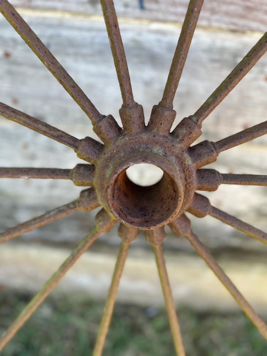 Authentic antique iron wagon wheel with original spokes and hub. Heavy steel construction with a naturally aged patina from decades of use. Great rustic décor piece for barns, gardens, fences, porch displays, or farmhouse walls. No modern reproduction—this is an old farm wheel with real character.