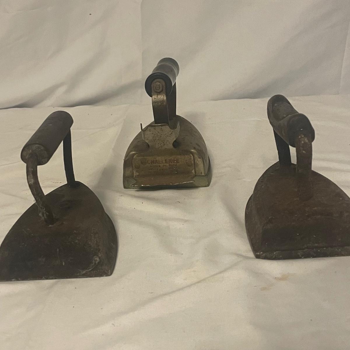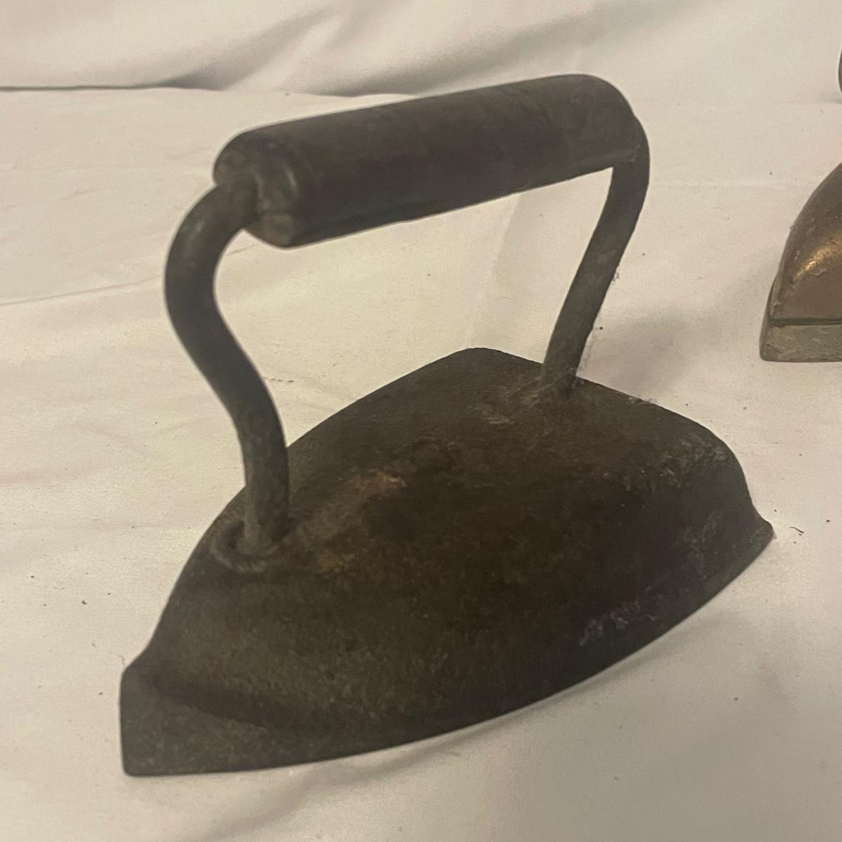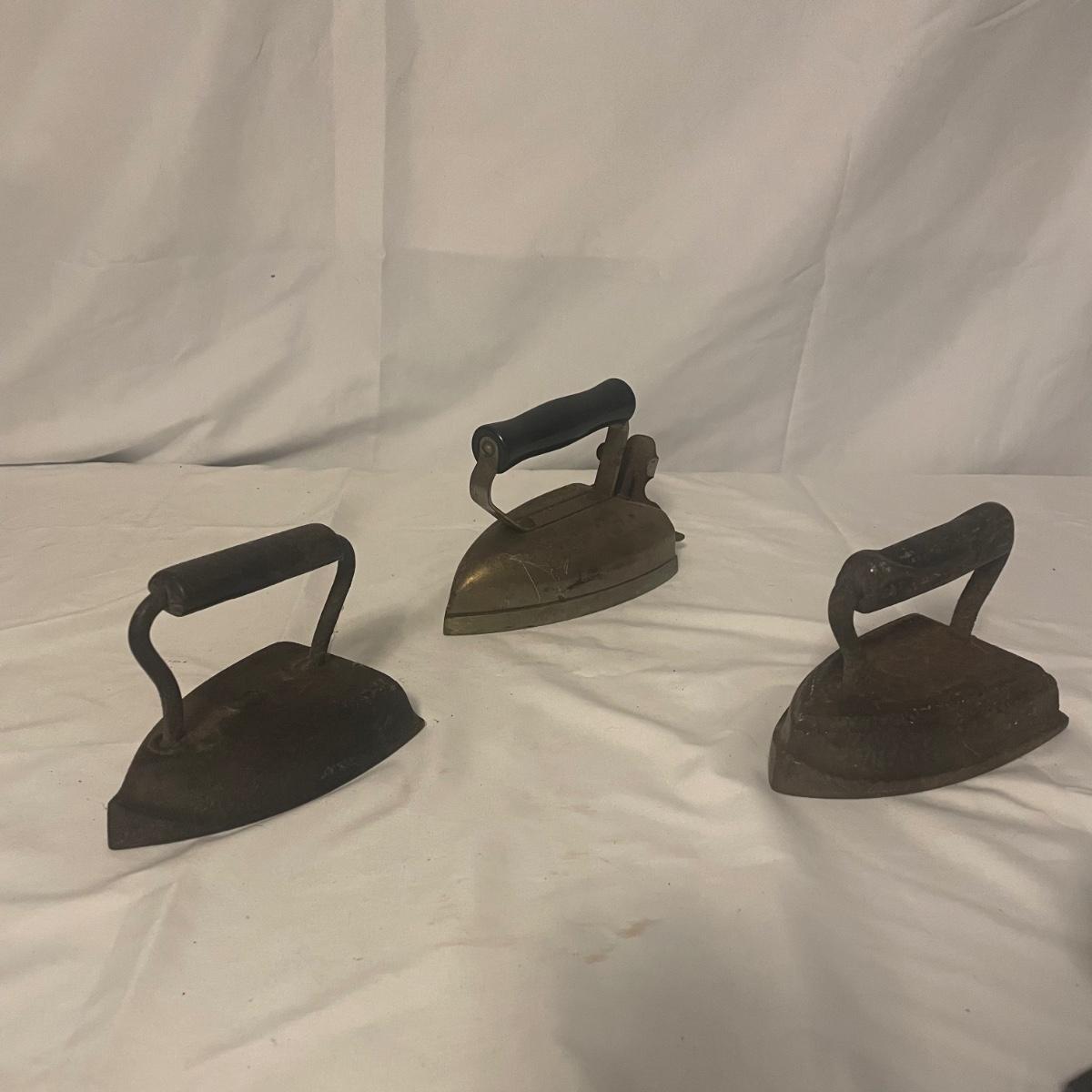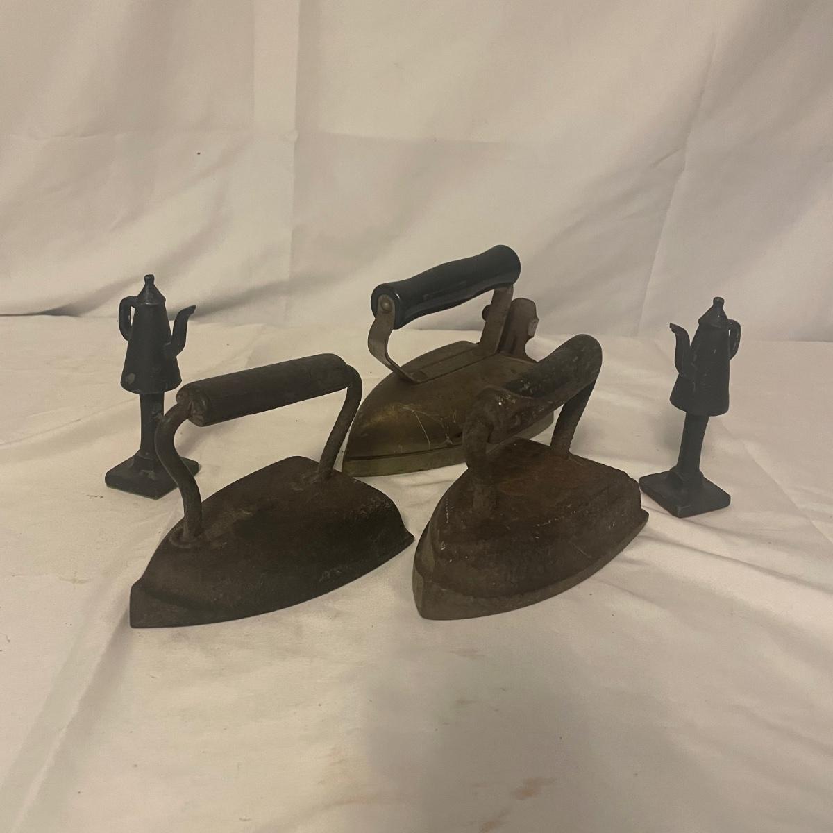 Of the 3 irons, 2 are cast iron and the 3rd is a metal electric iron (no cord and therefore untested and is for decorative use only). Also included are a pair of cast iron coffee pot figurines. All items are in good condition.