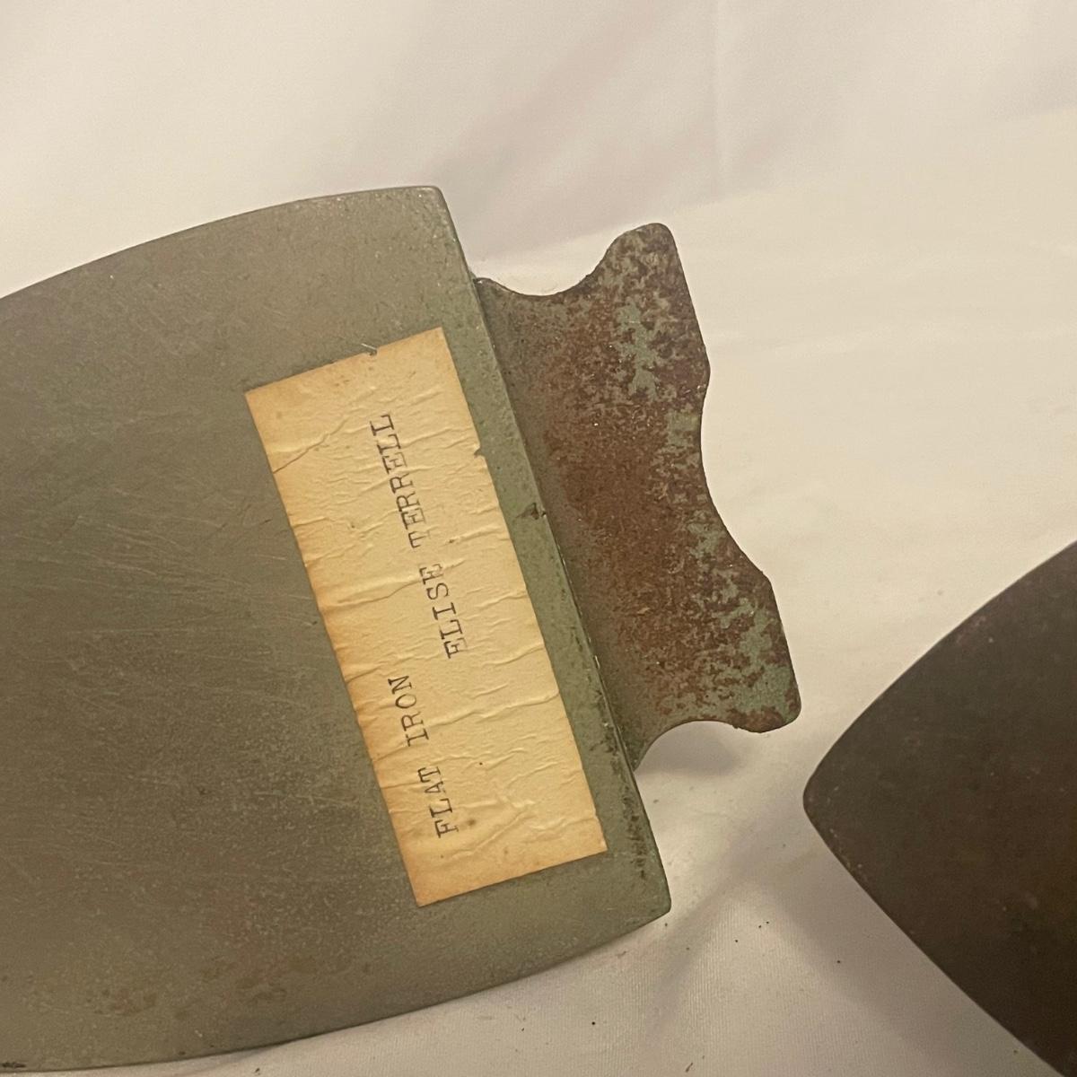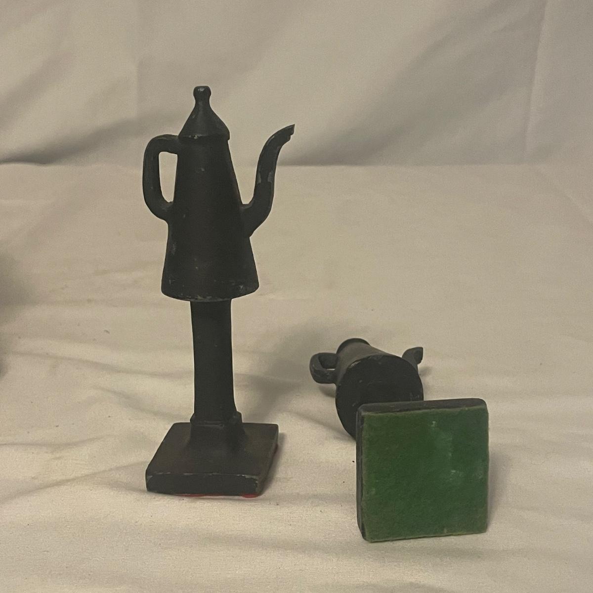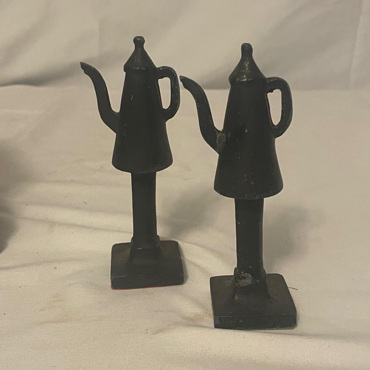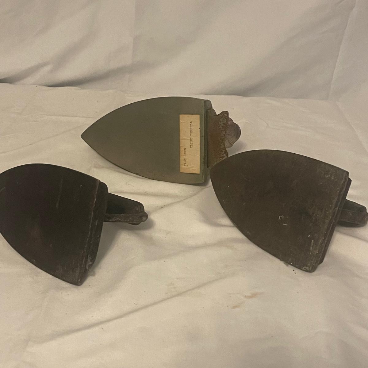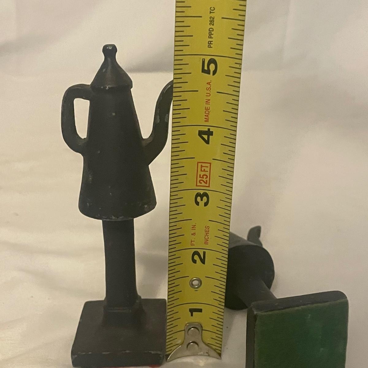 Of the 3 irons, 2 are cast iron and the 3rd is a metal electric iron (no cord and therefore untested and is for decorative use only). Also included are a pair of cast iron coffee pot figurines. All items are in good condition.