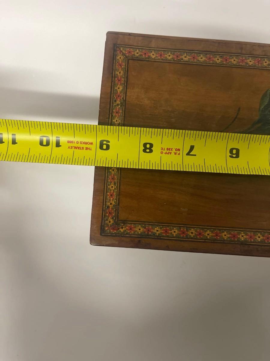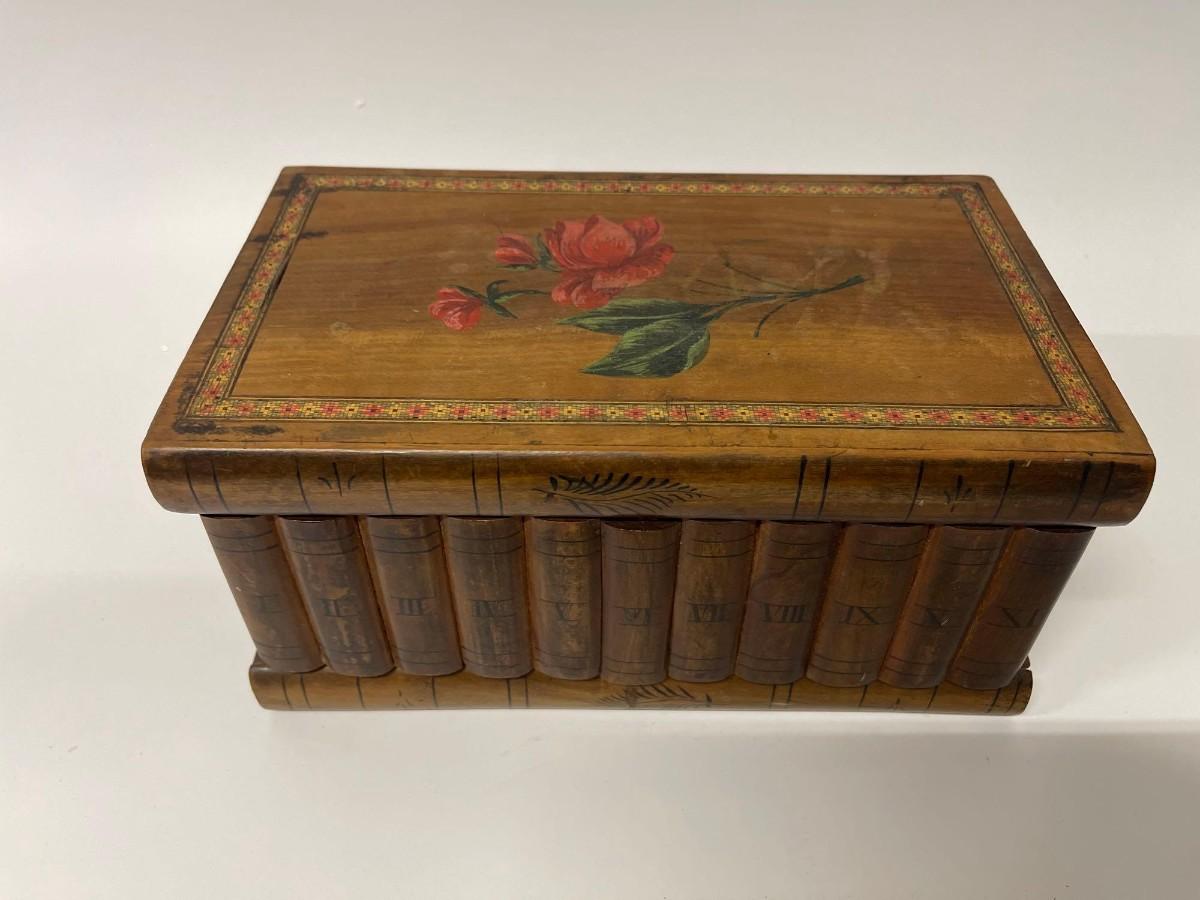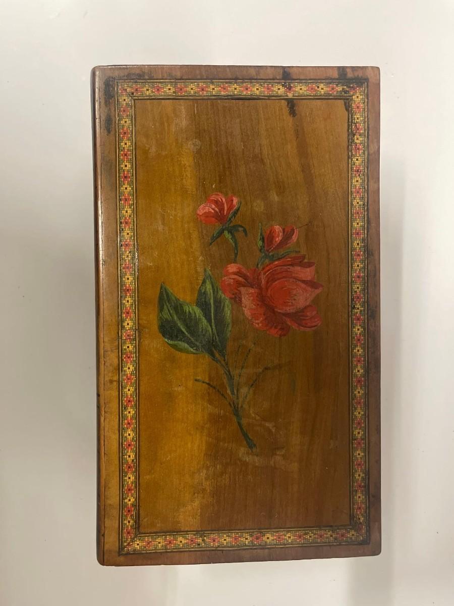 <p>Antique Italian Sorrento Ware olive wood carved wood box, hand painted. Circa early 20th century. </p>