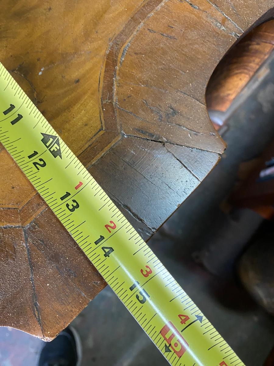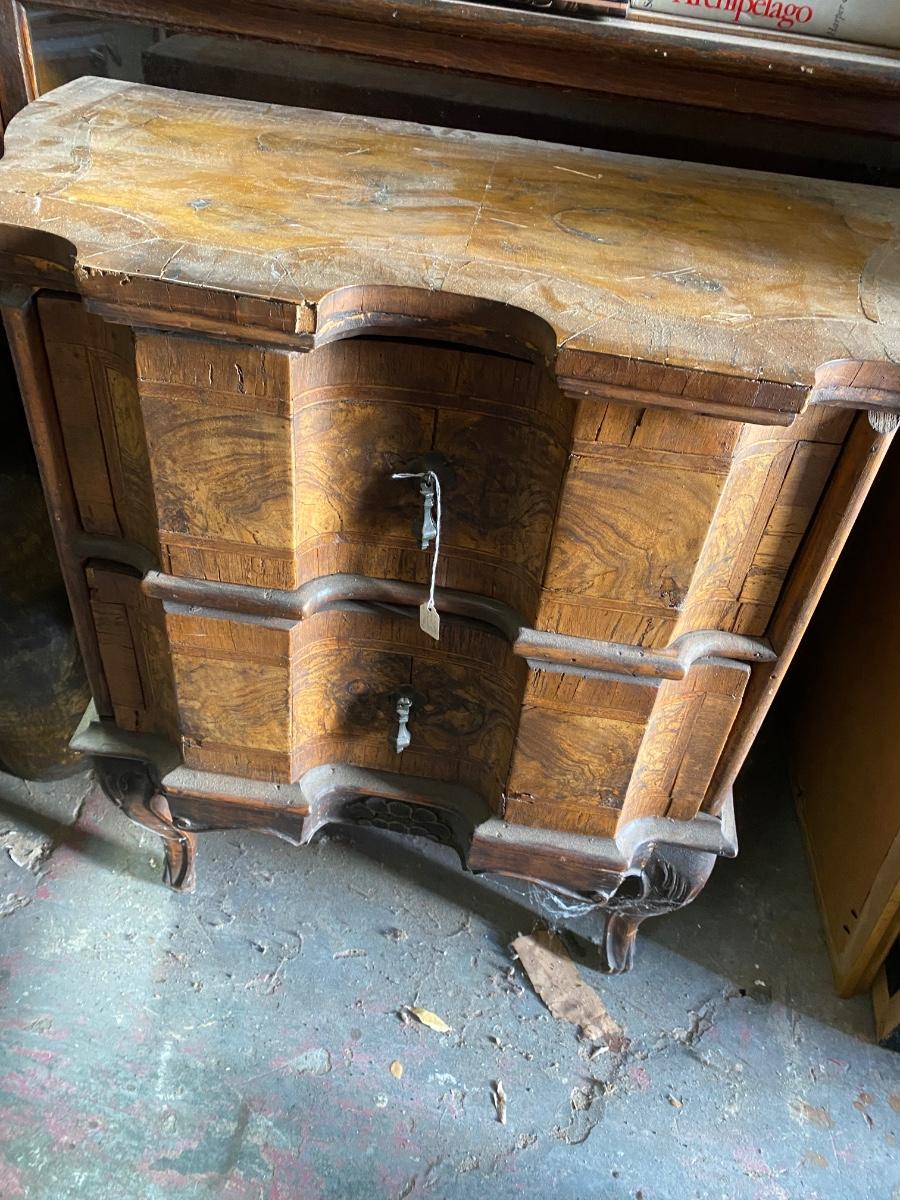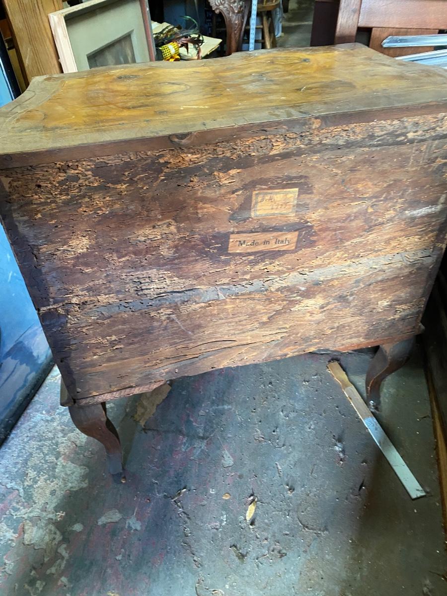 Antique Italian Walnut Comodini, bedside table with ntoched front 2 drawers ith metal pulls. Some issues with veneer. Made in Italy. 27Hx27Wx14D