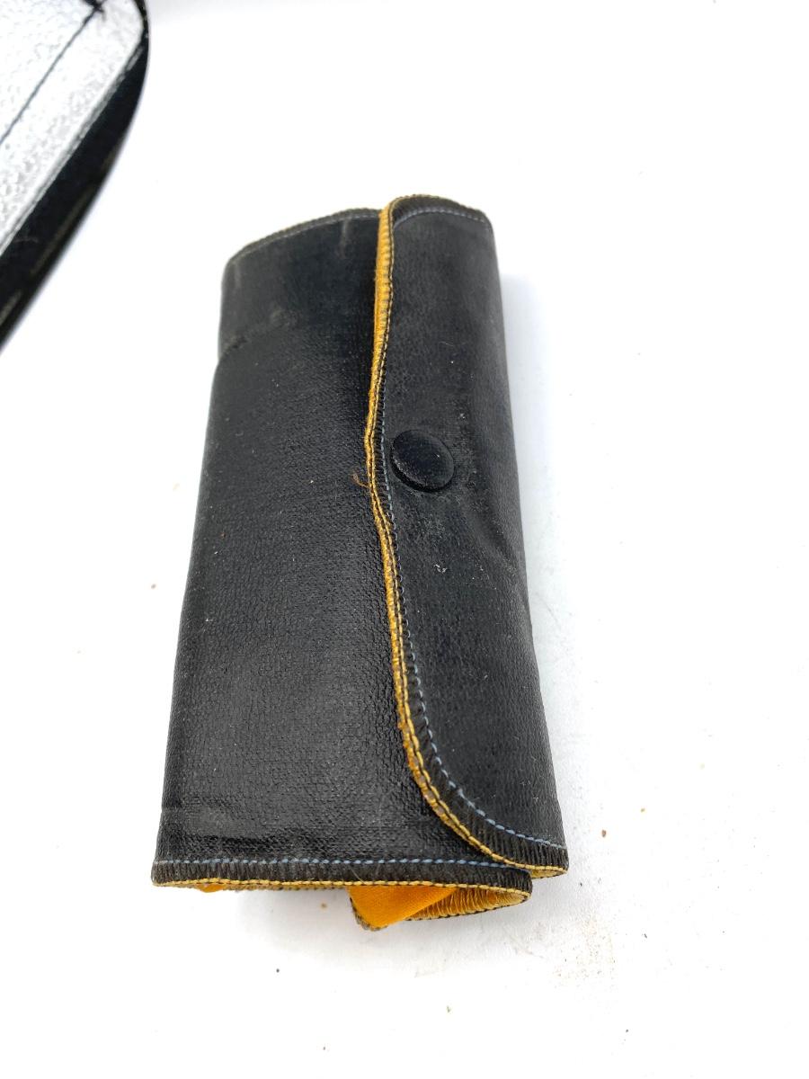 As pictured - wonderful very old manicure set with antique ivory implements 2-4 “ long, wrapped in old silk lined leather roll bag.