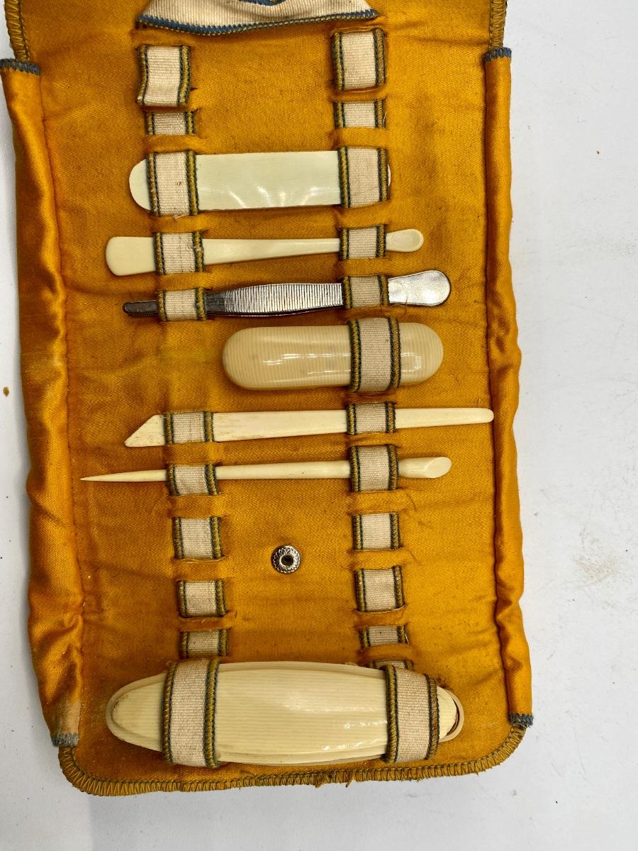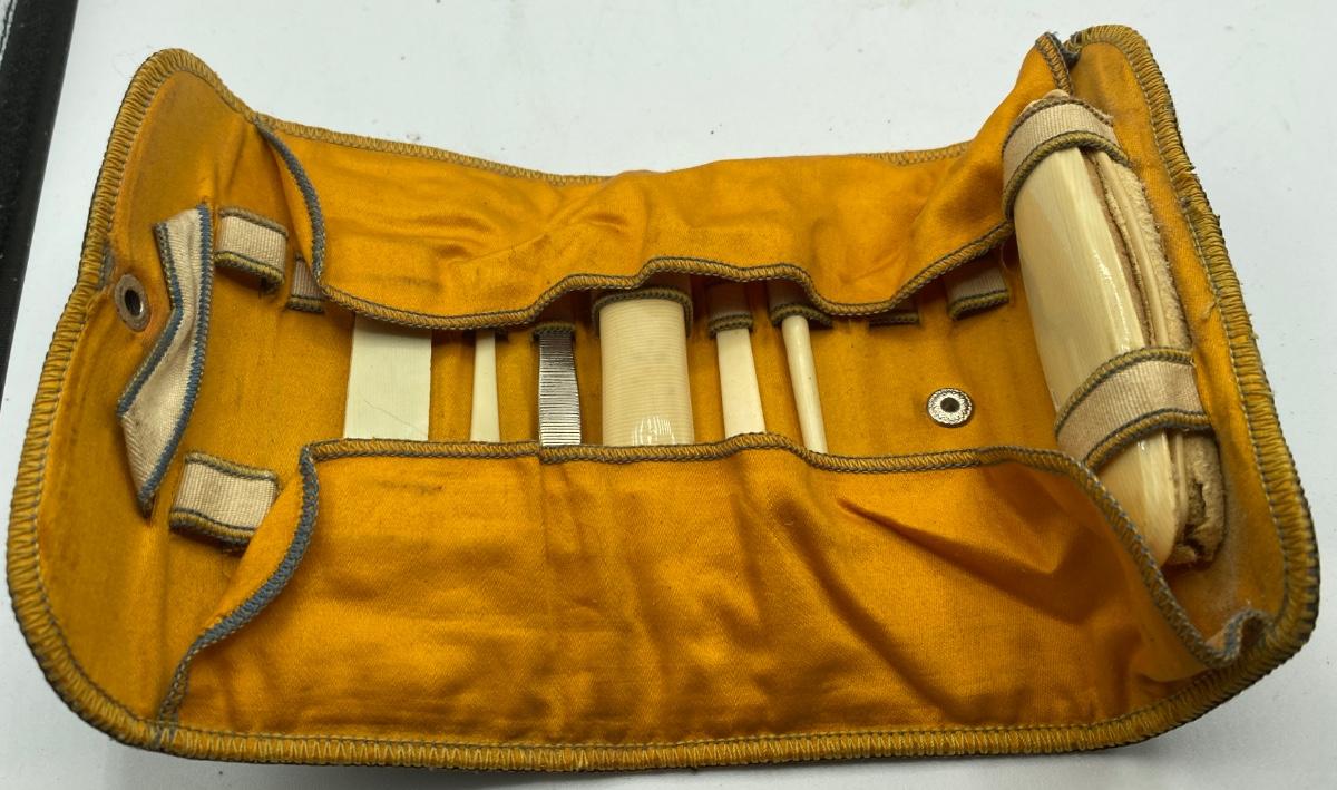 As pictured - wonderful very old manicure set with antique ivory implements 2-4 “ long, wrapped in old silk lined leather roll bag.