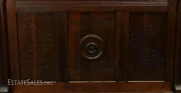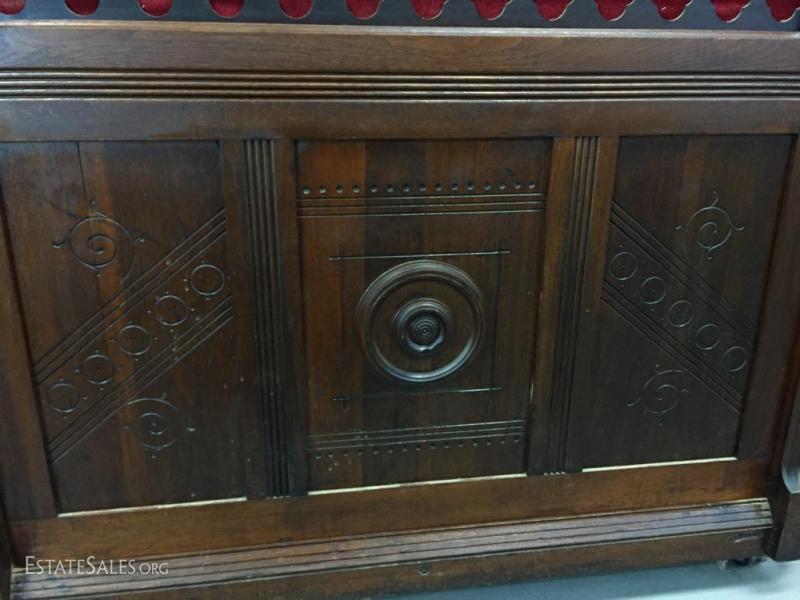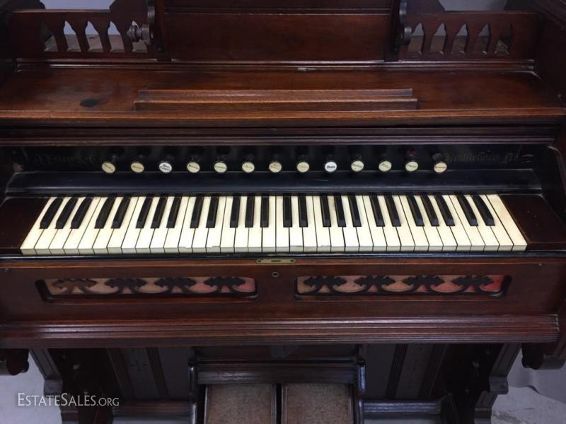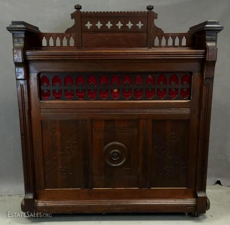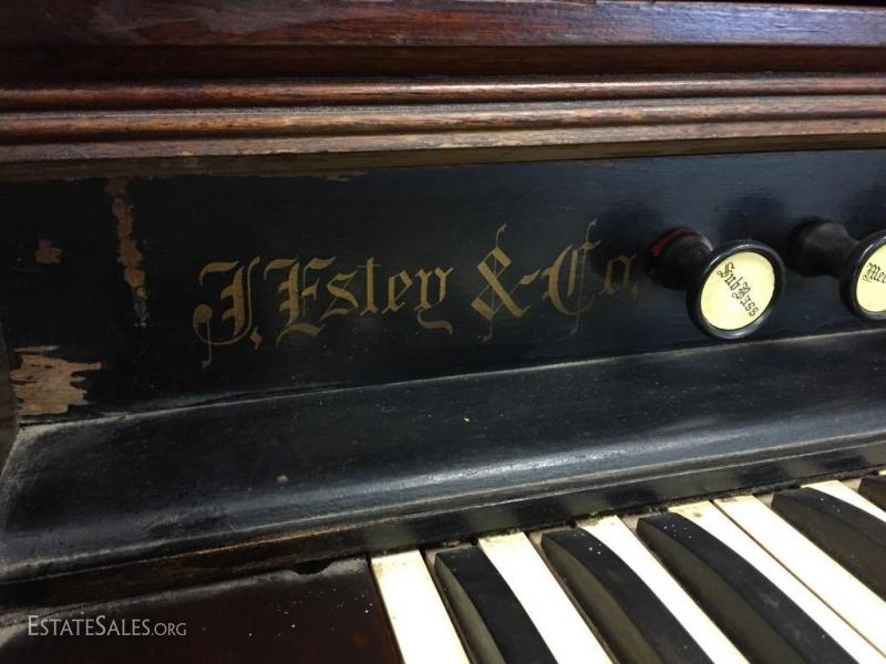 Antique "J. Estey & Co." Grand pump organ encased in ornately carved walnut, made in Brattleboro, VT, original keys & on metal rolling casters, 54" x 47"
