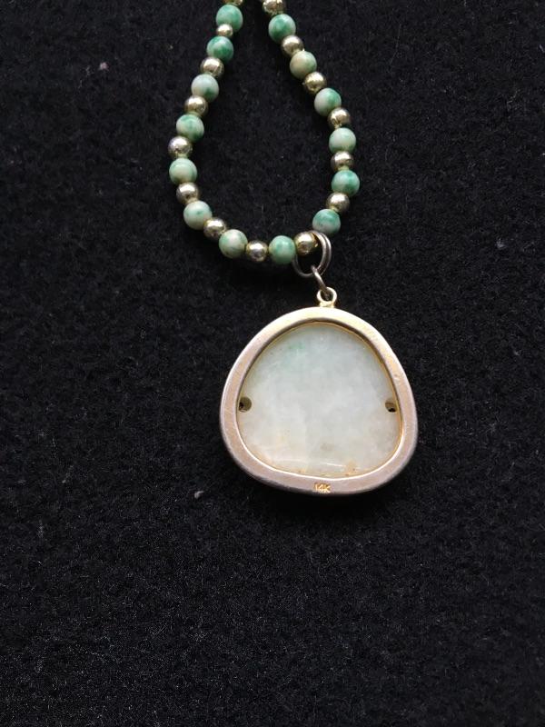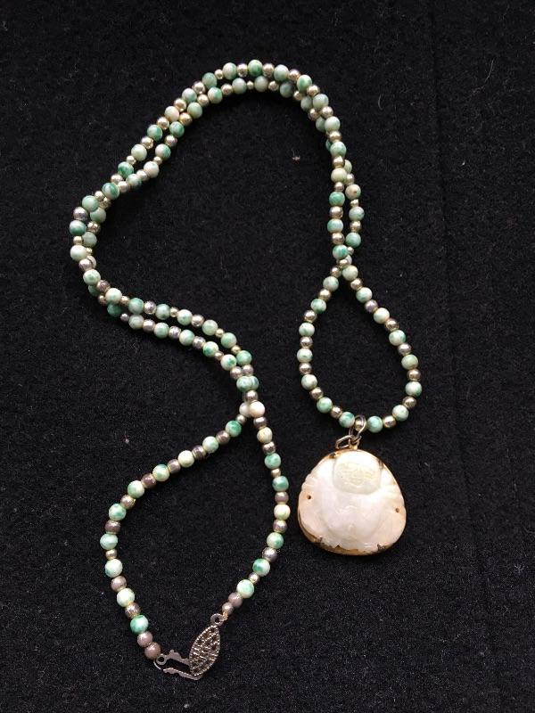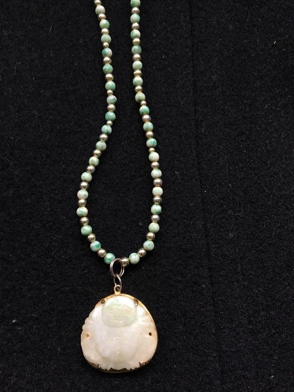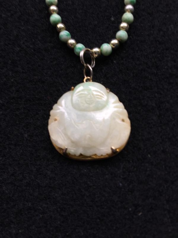 White Jade Buddha set in 14k pendant. Necklace is small silver and green beads, and looks to be much newer. Pendant measures 1 1/4” tall.