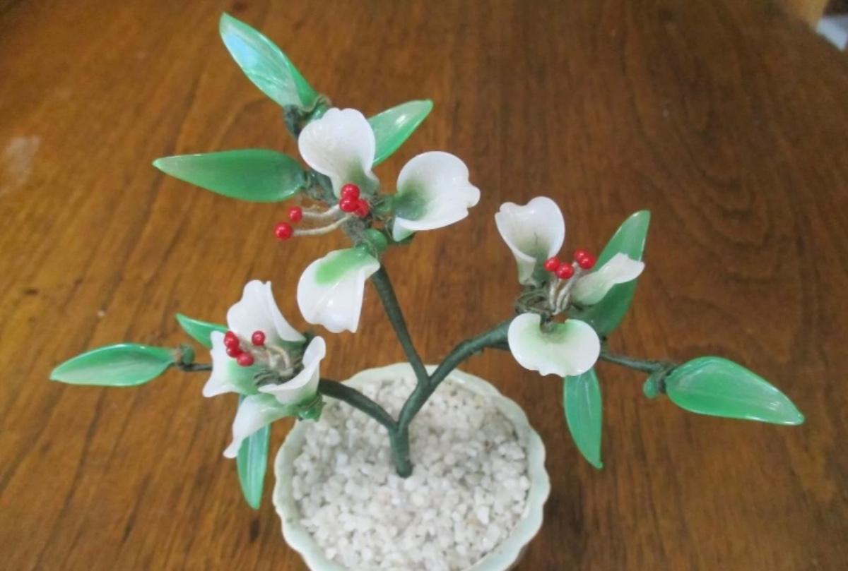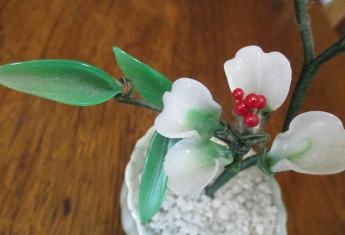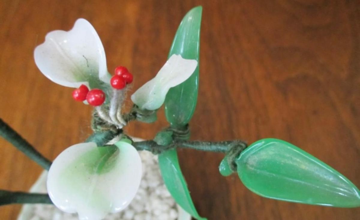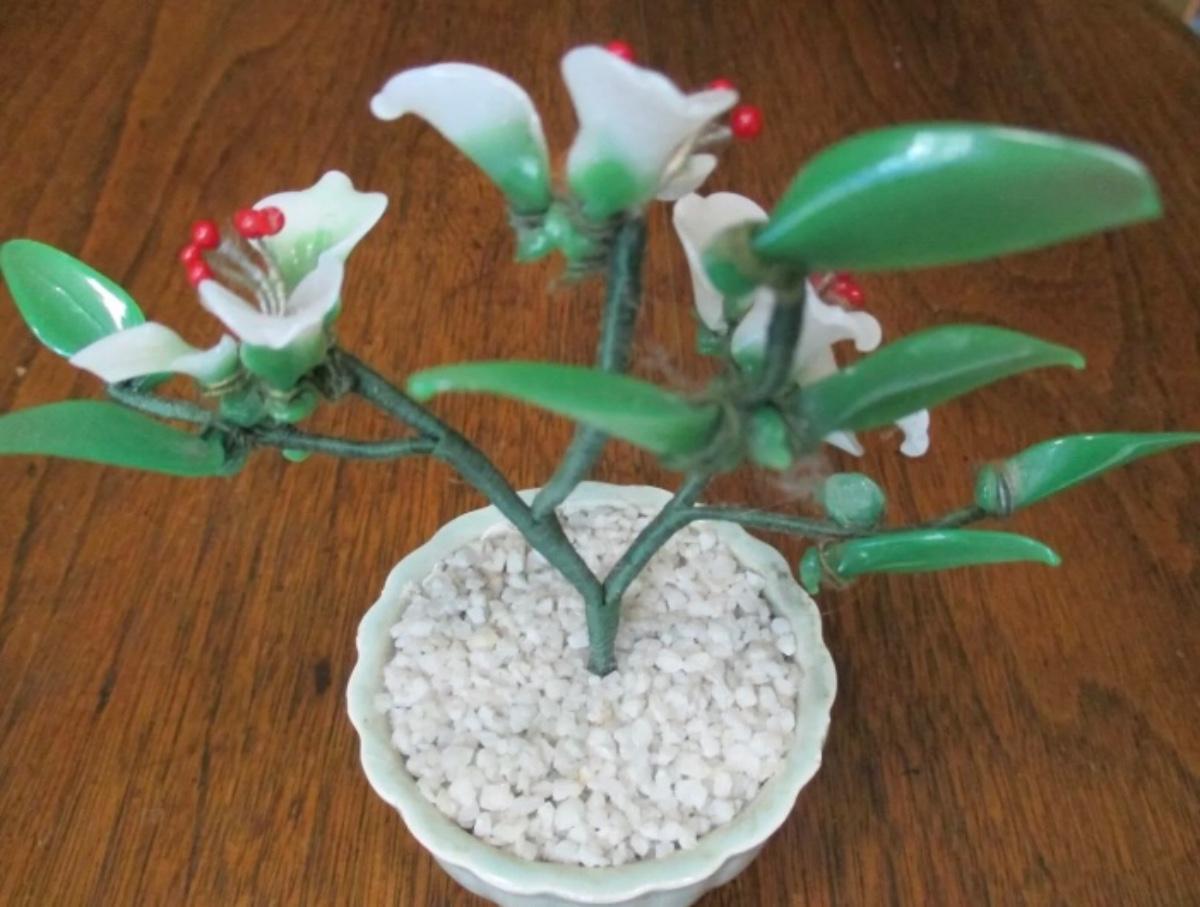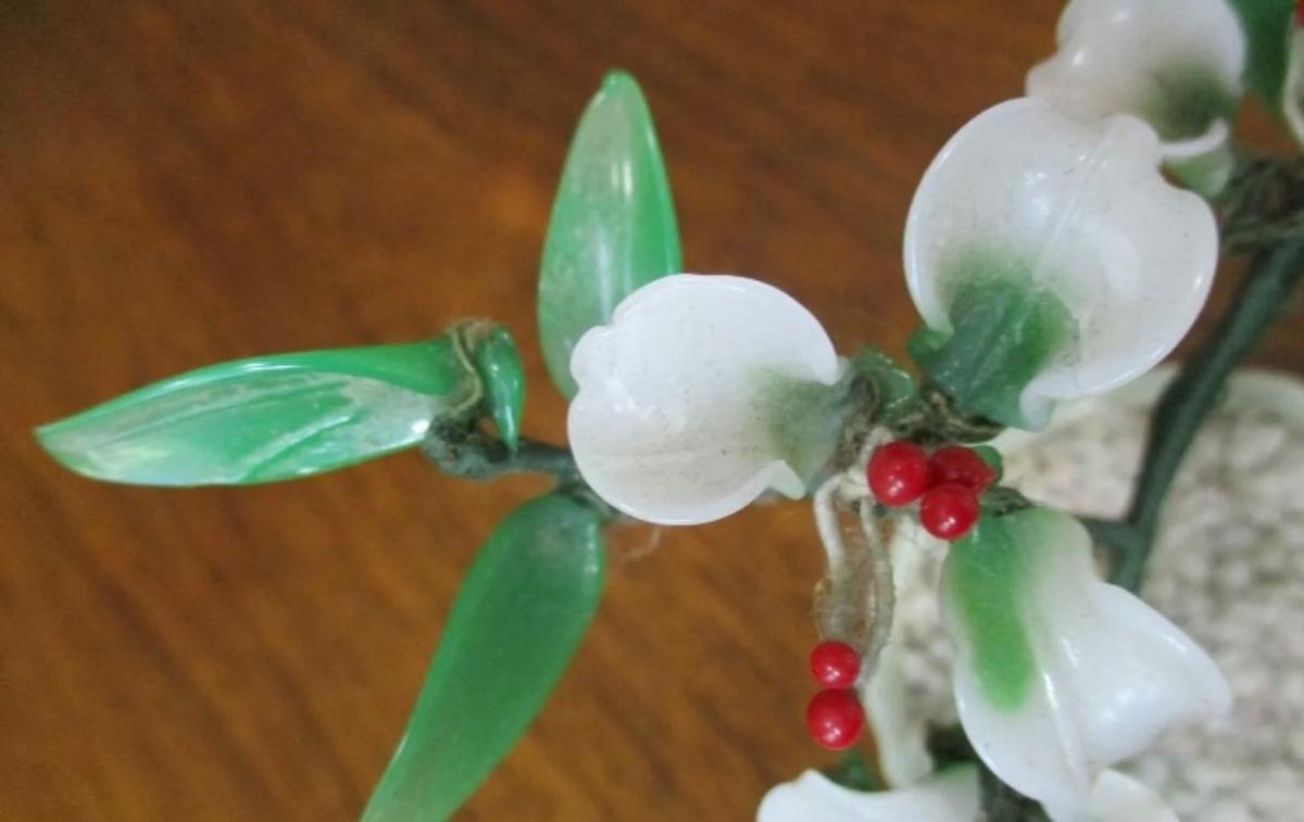 Antique Asian Jade–agate floral Bonsai tree in celadon pot - Marked