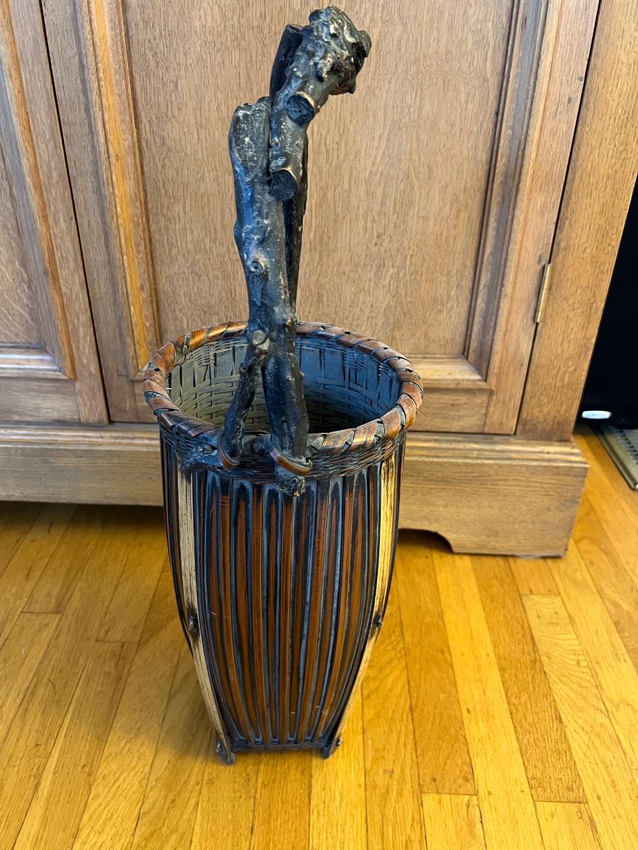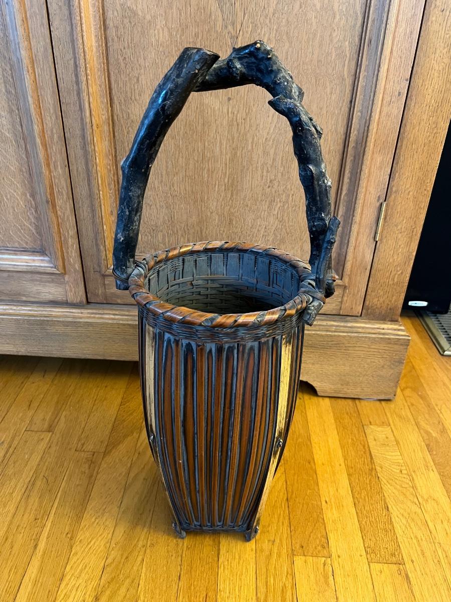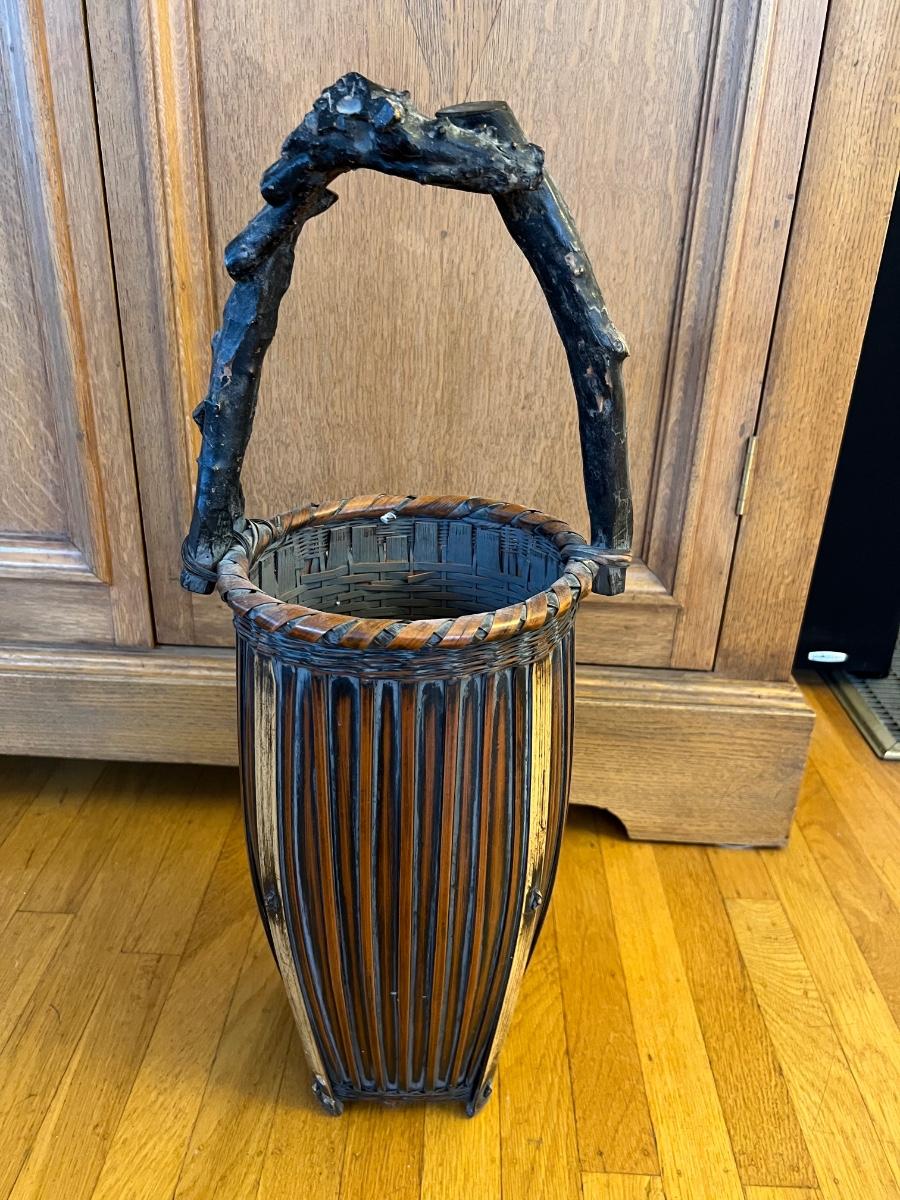 Antique Japanese Ikebana bamboo basket, circa 1800. Tall basket with dark wood handle, square base, round top
