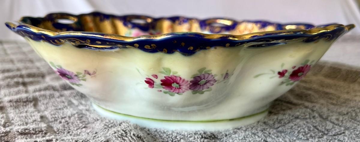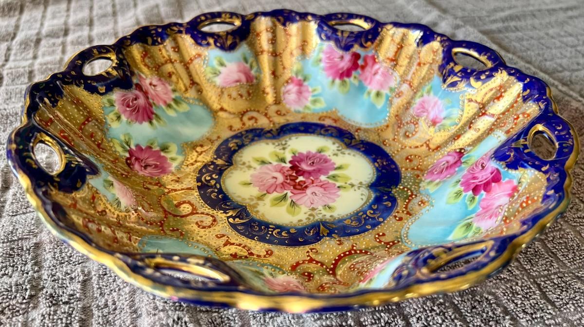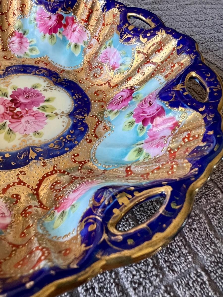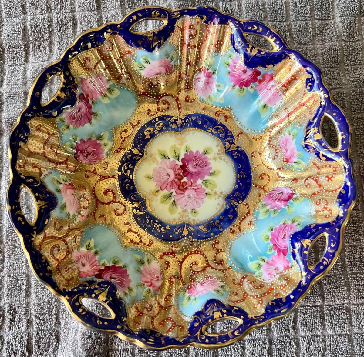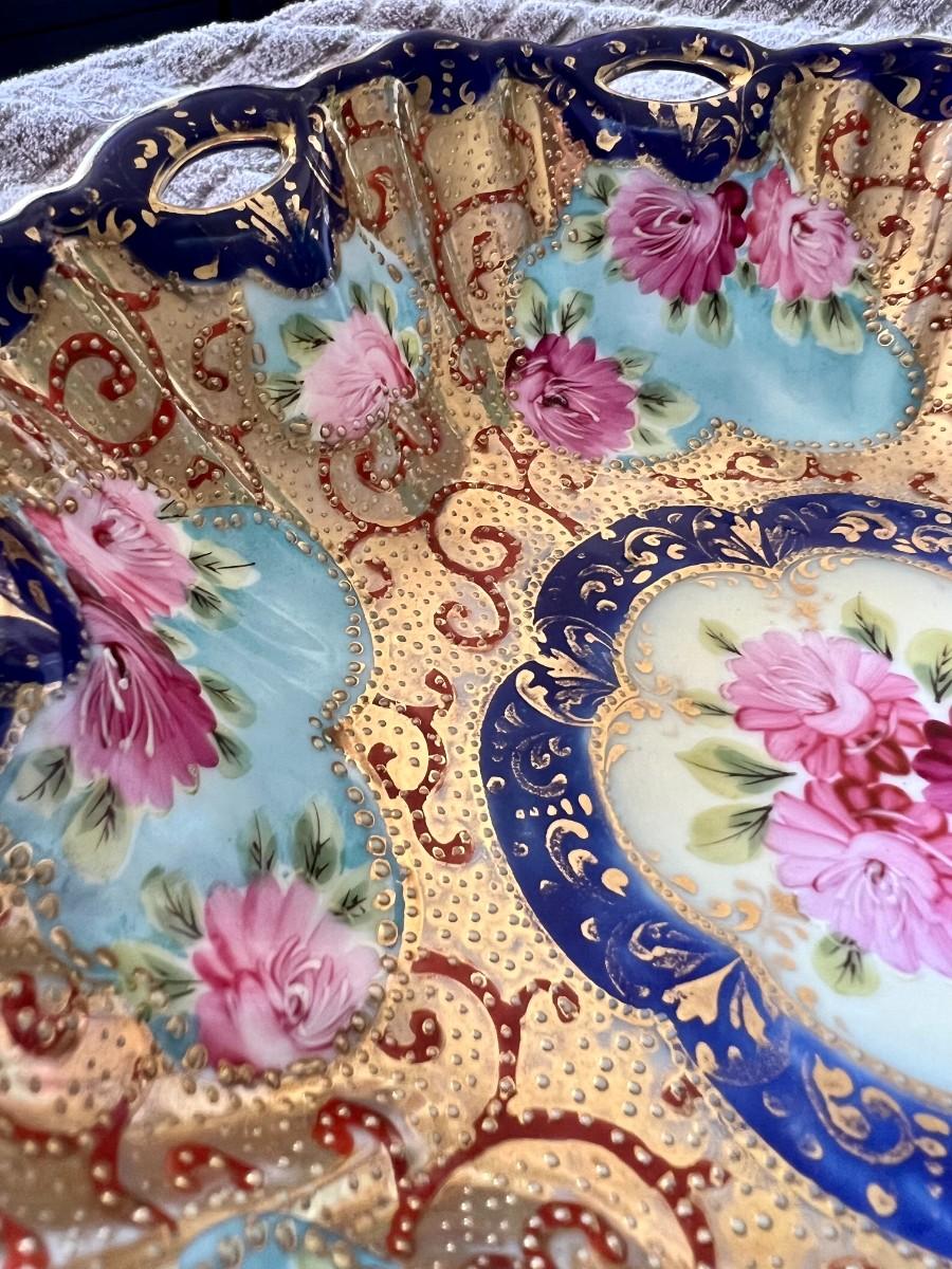 Antique Japanese Porcelain Chrysanthemum Gold Moriage Cobalt Blue Bowl 10" Inches