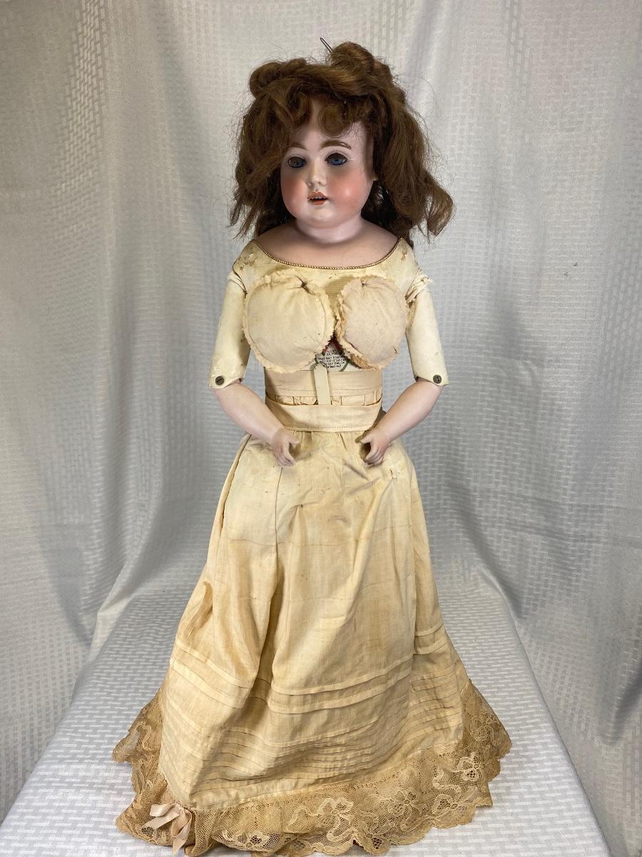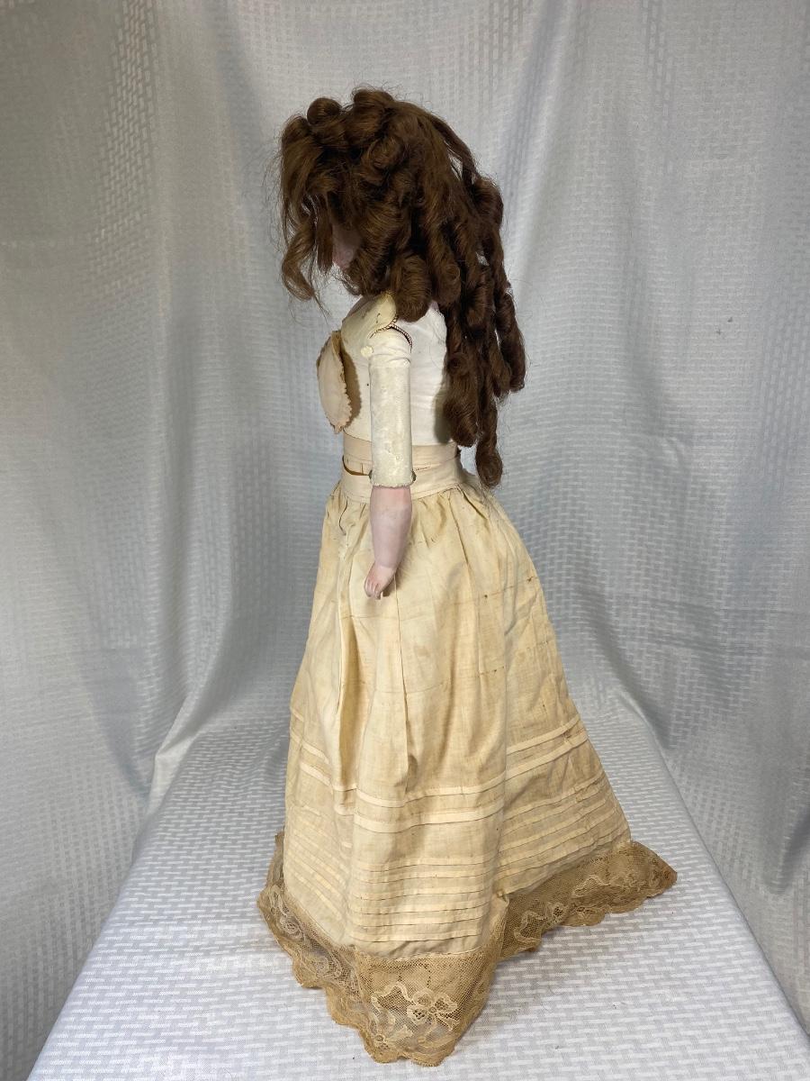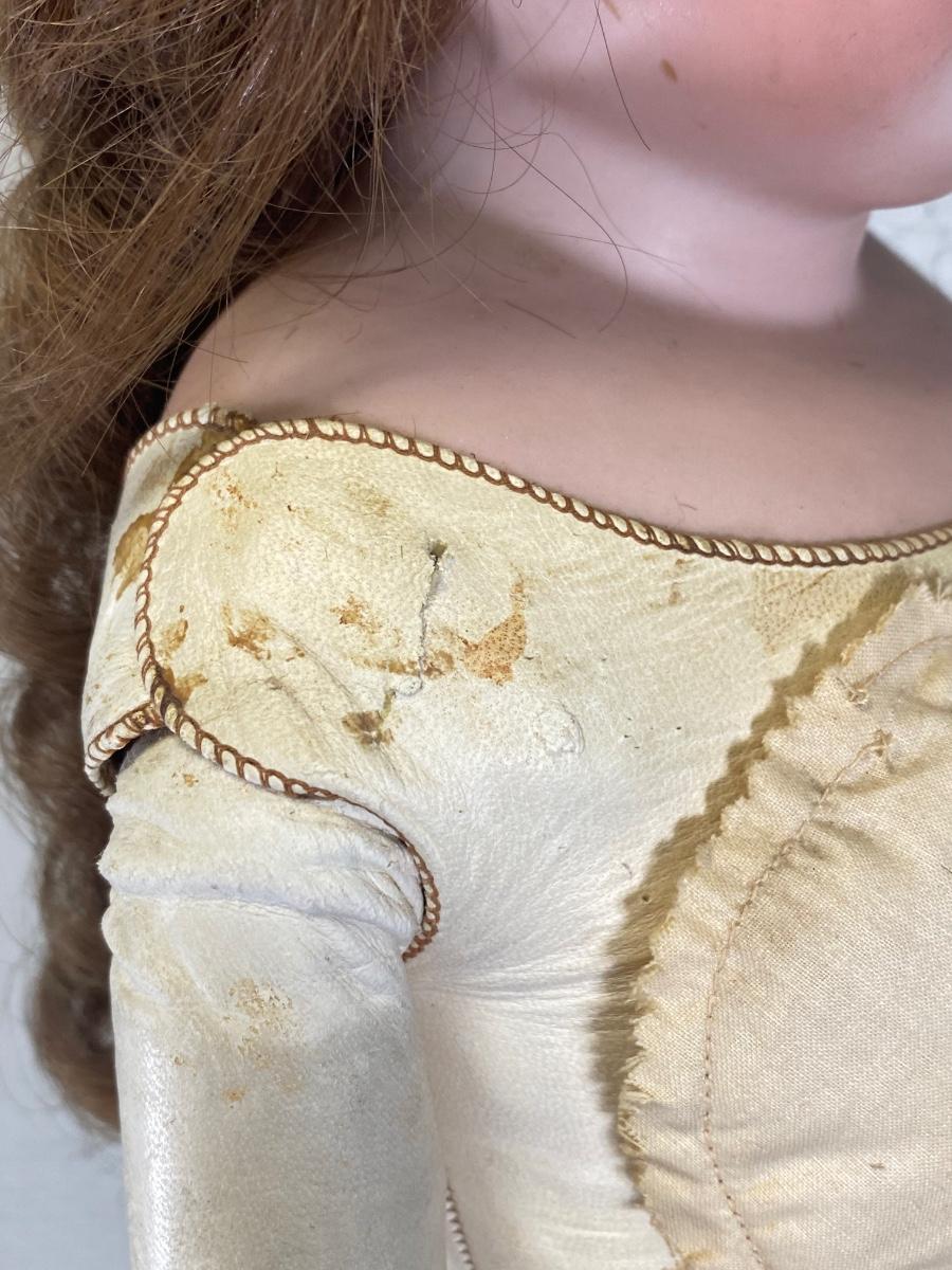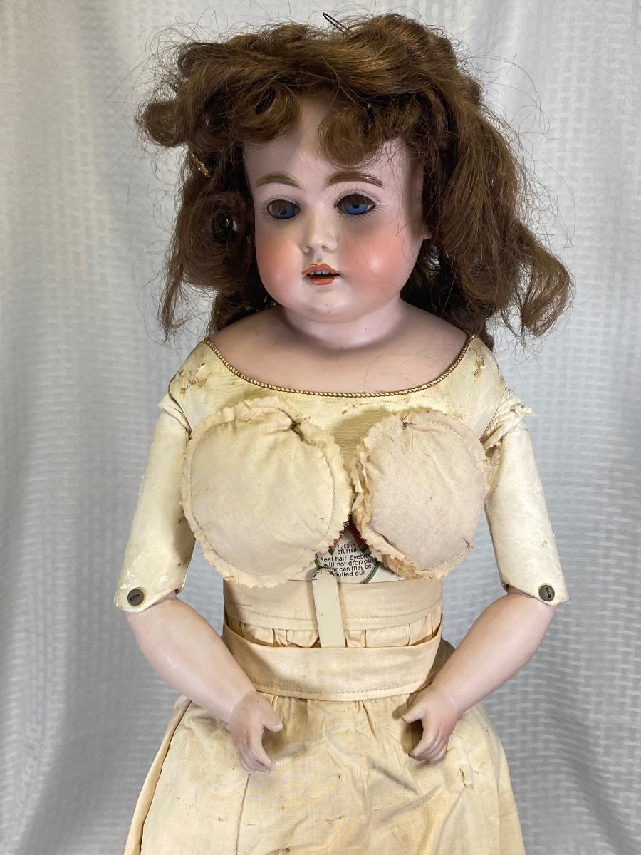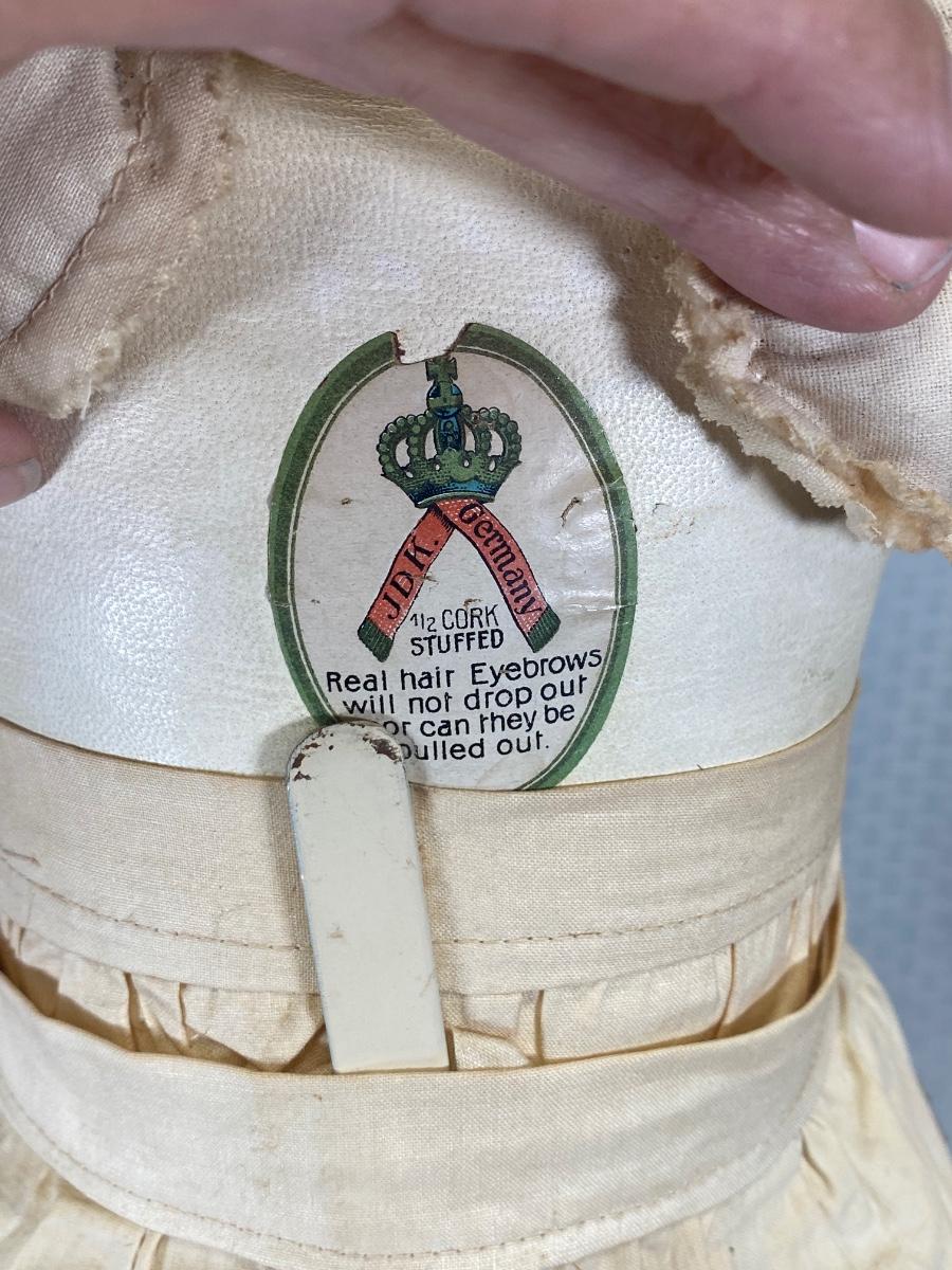 Antique JDK Germany Bisque & Leather Body Sleepy Eye Doll. Bisque shoulder head and limbs with a cork stuffed leather body. Doll is wearing undergarment skirt with pinned chest and butt pad. Hair and body have been glued in place cannot make out markings on back of head and neck. JDK stamp on torso. Stamp says real hair eyebrows, but her eyebrows do not have hair, her eyelashes are real hair though. She comes with stand. She is in overall good condition, no damage. She is a sleepy-eyed doll but her eyes do not shut properly. About 26" size without stand.