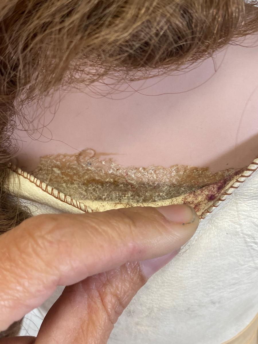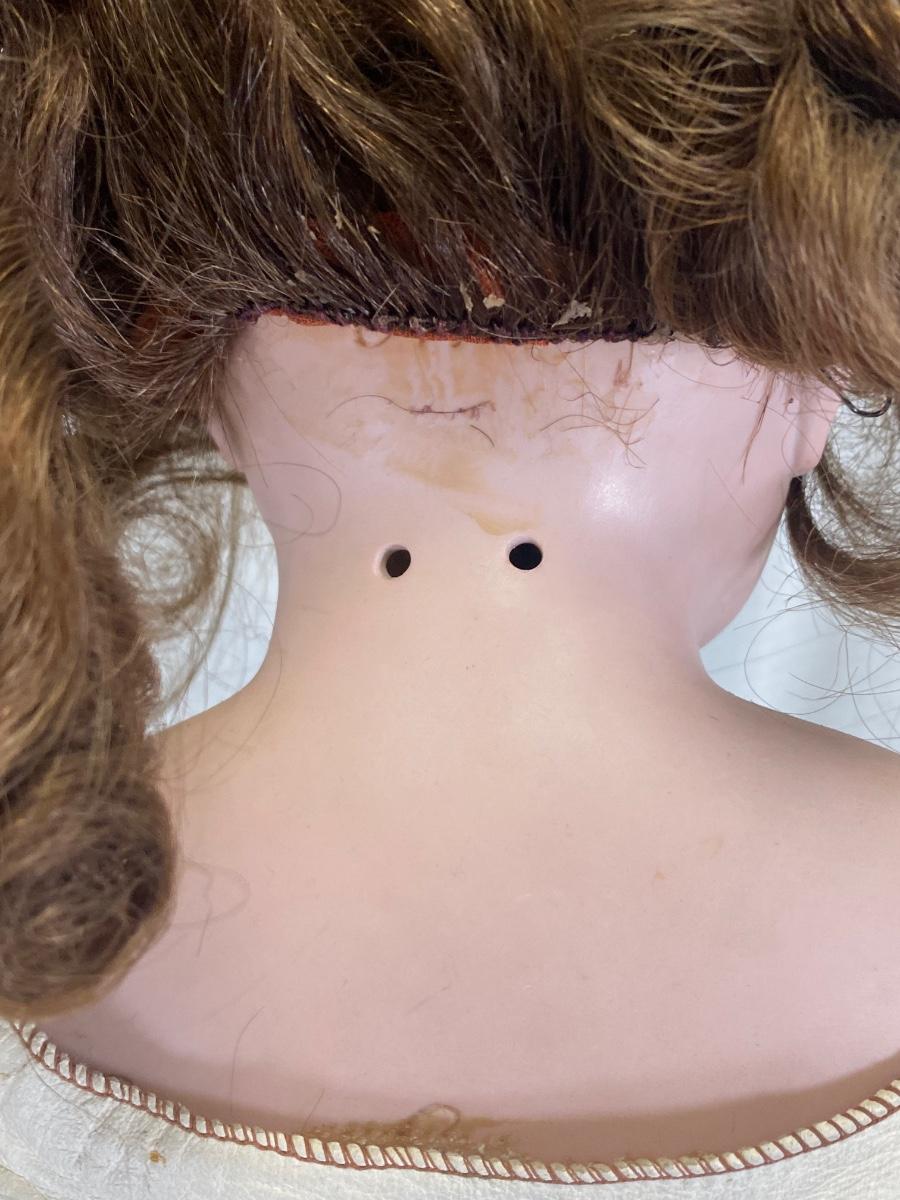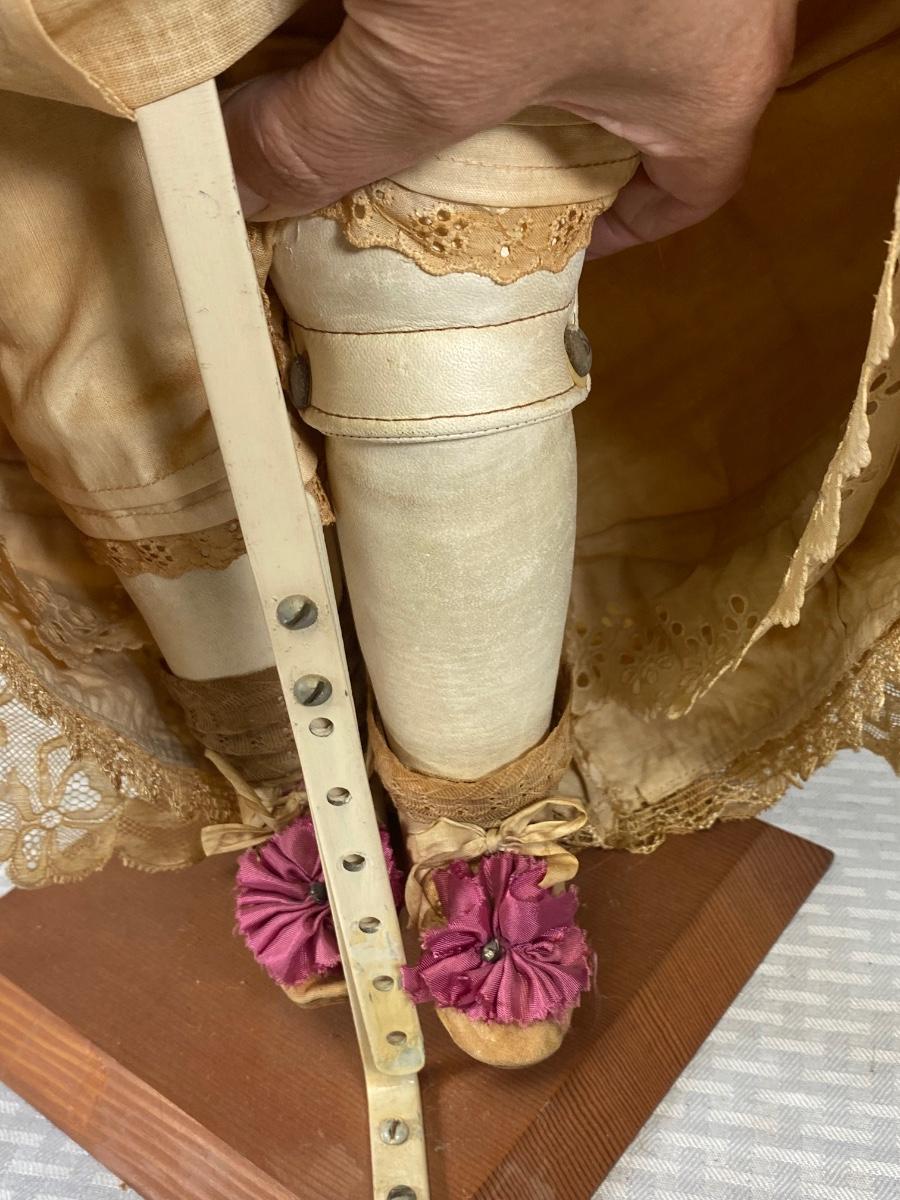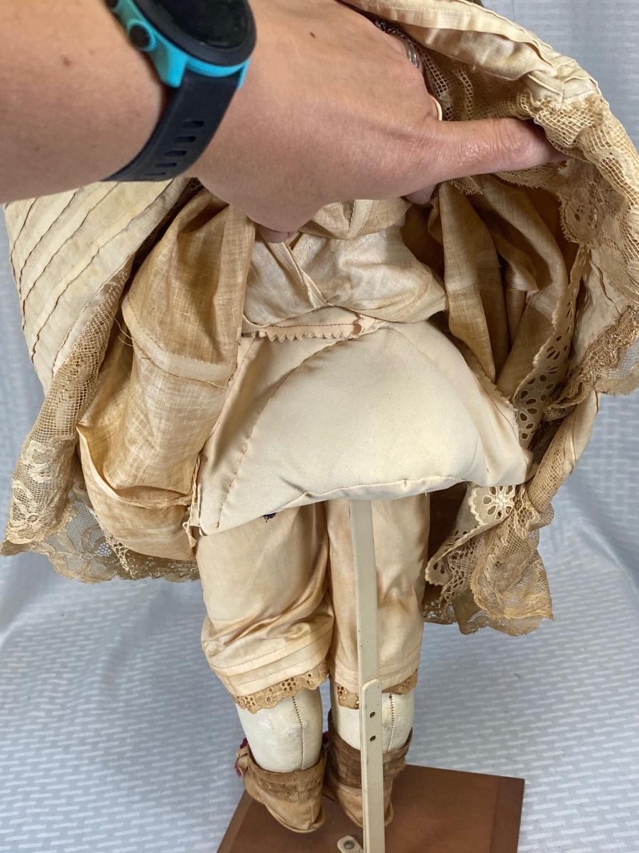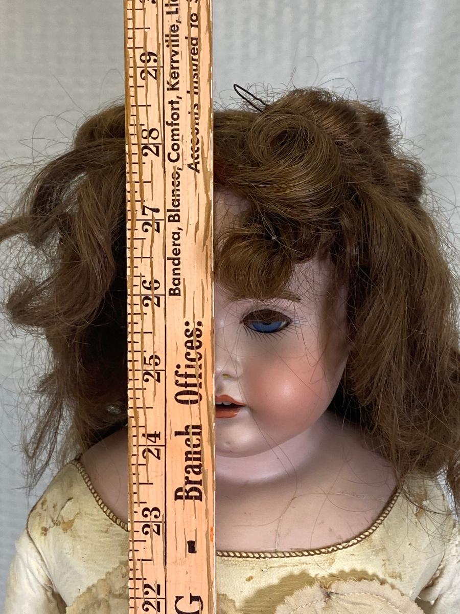 Antique JDK Germany Bisque & Leather Body Sleepy Eye Doll. Bisque shoulder head and limbs with a cork stuffed leather body. Doll is wearing undergarment skirt with pinned chest and butt pad. Hair and body have been glued in place cannot make out markings on back of head and neck. JDK stamp on torso. Stamp says real hair eyebrows, but her eyebrows do not have hair, her eyelashes are real hair though. She comes with stand. She is in overall good condition, no damage. She is a sleepy-eyed doll but her eyes do not shut properly. About 26" size without stand.