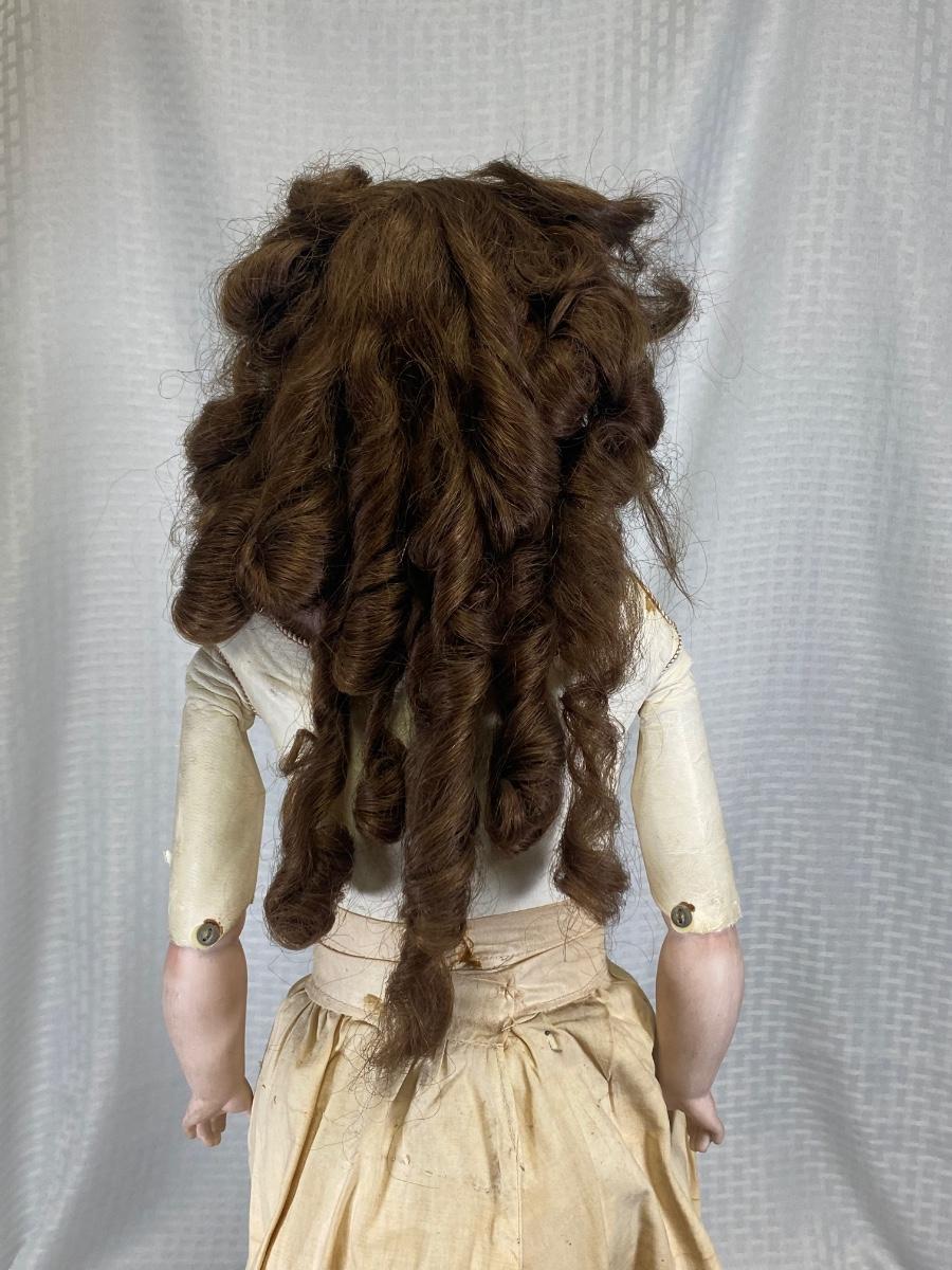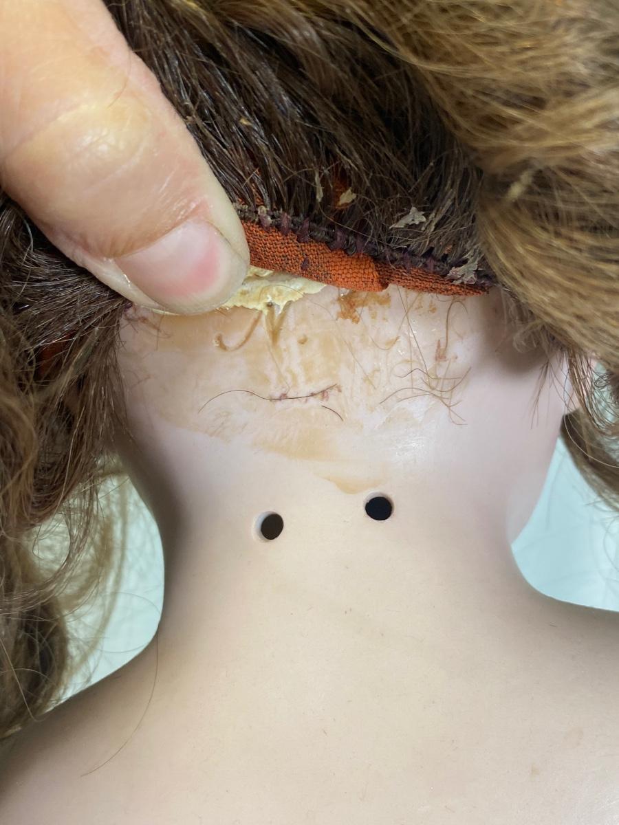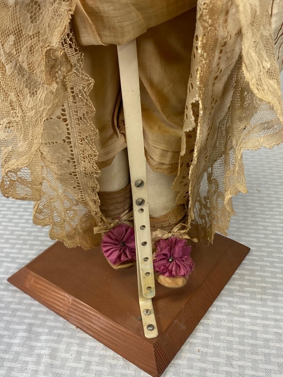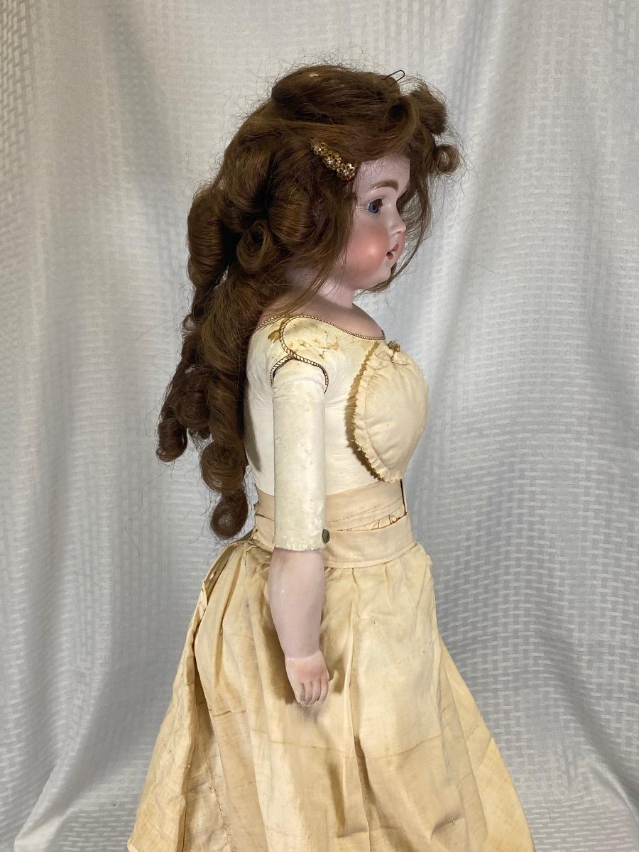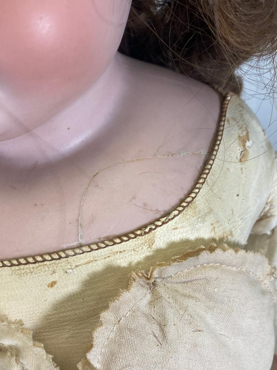 Antique JDK Germany Bisque & Leather Body Sleepy Eye Doll. Bisque shoulder head and limbs with a cork stuffed leather body. Doll is wearing undergarment skirt with pinned chest and butt pad. Hair and body have been glued in place cannot make out markings on back of head and neck. JDK stamp on torso. Stamp says real hair eyebrows, but her eyebrows do not have hair, her eyelashes are real hair though. She comes with stand. She is in overall good condition, no damage. She is a sleepy-eyed doll but her eyes do not shut properly. About 26" size without stand.