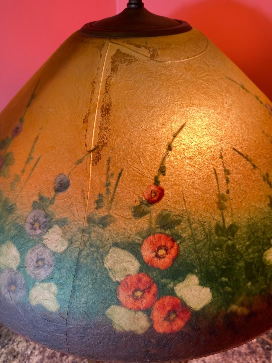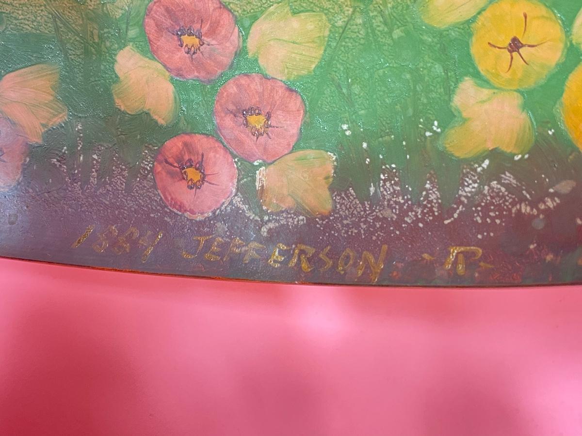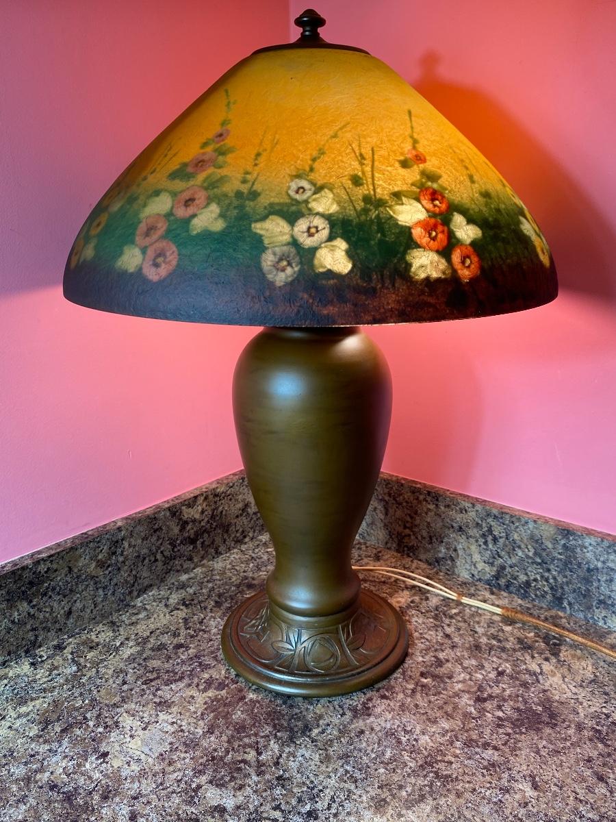 Antique Jefferson 1884 Jefferson Hollyhock Reverse Painted Shade & Lamp (damage)