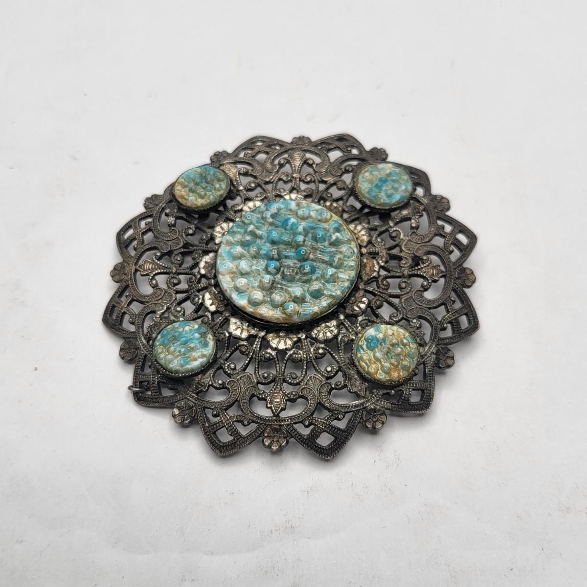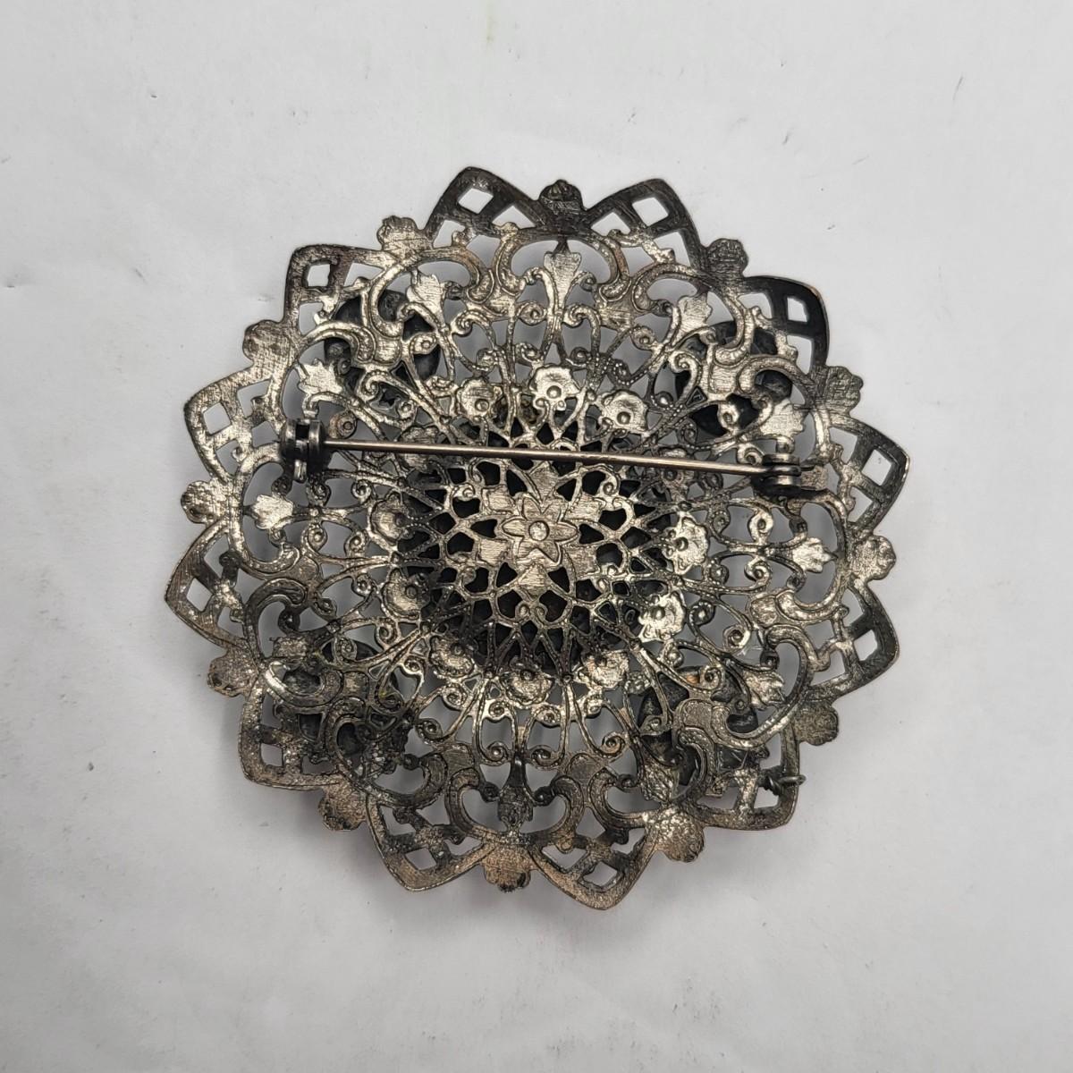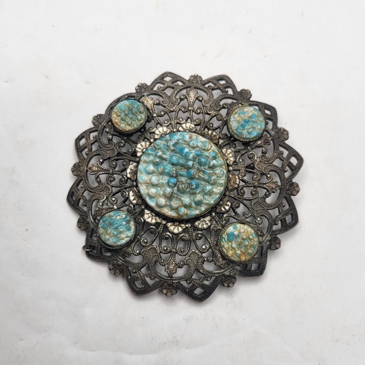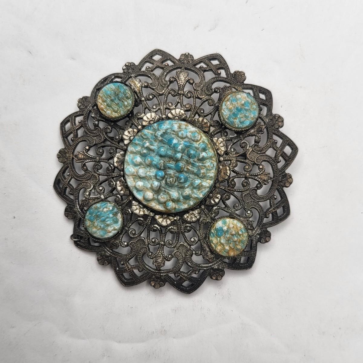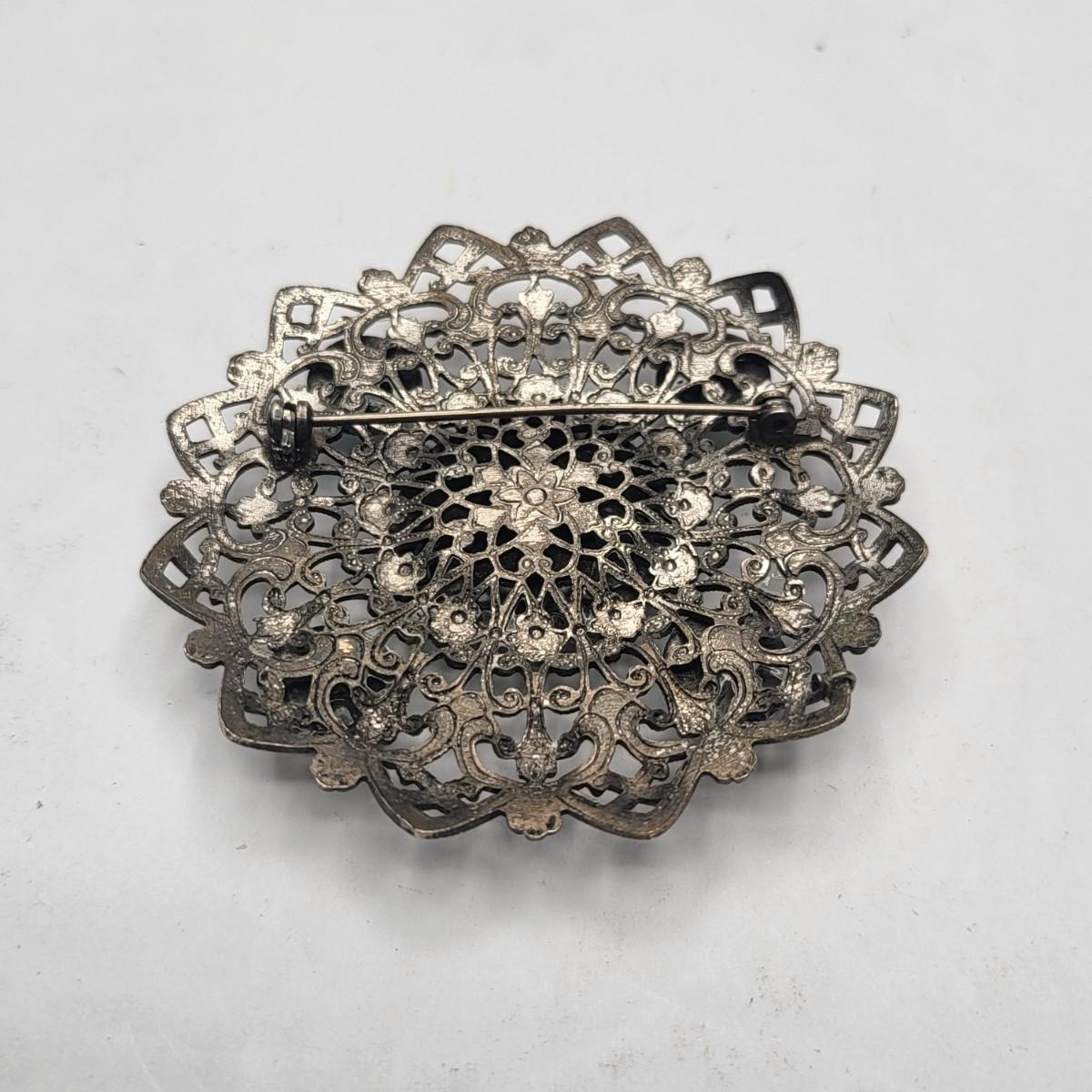 Antique/Art Nuevo open work brooch, 2.5" with glass insets.