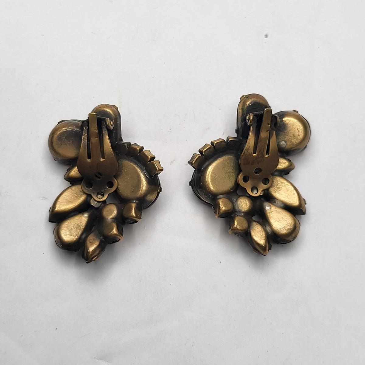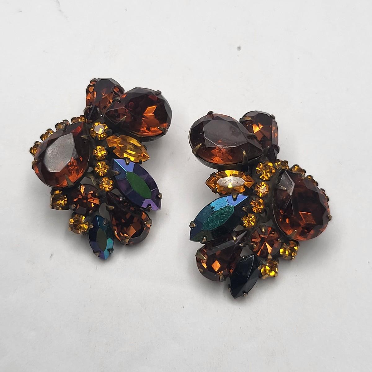 Juliana style vintage aurora and amber colored, prong set, rhinestone clip earrings, 1.5" x 1".