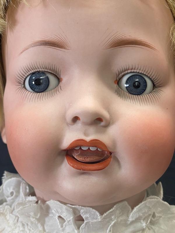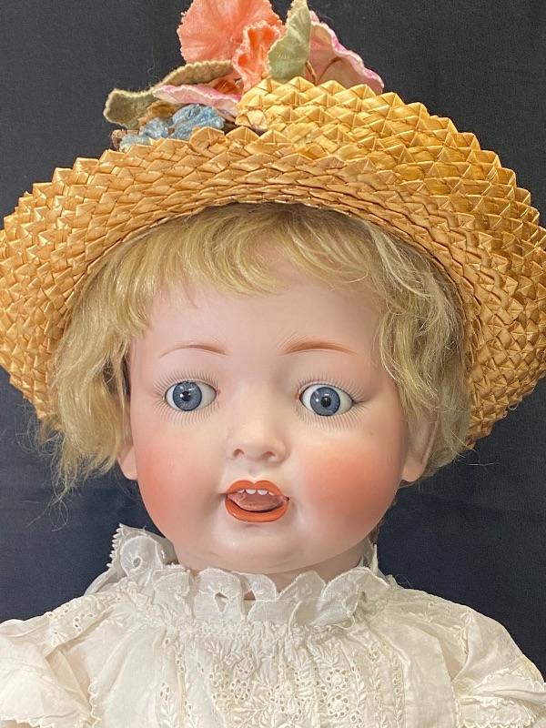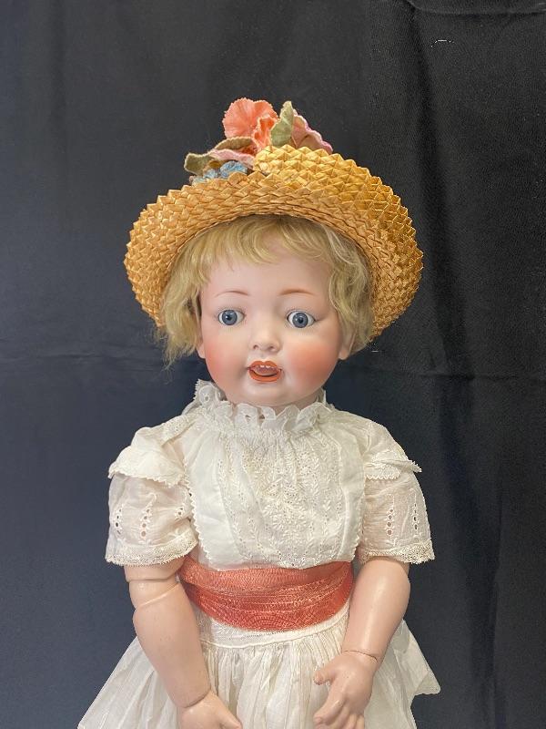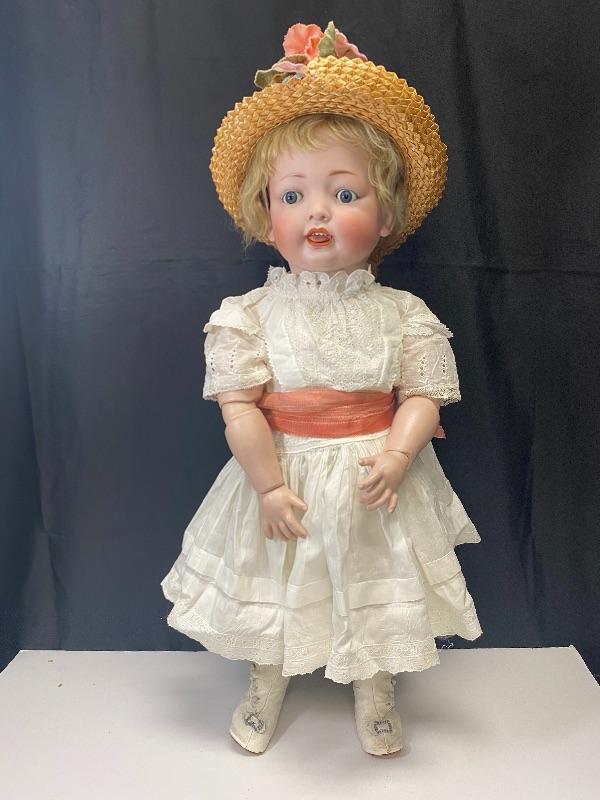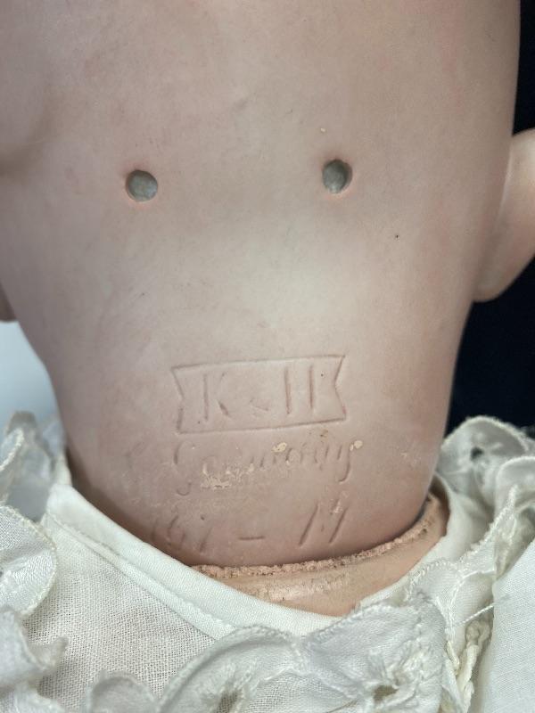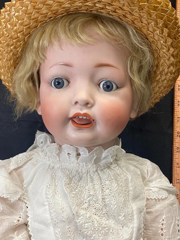 Antique 25" Kley & Hahn 167 doll. Bisque head with blue sleep eyes, open mouth, moving tongue and 4 teeth. Head is marked K&H Germany 167-17 it looks like. Composition body may have been repainted. Mohair wig. In overall good condition. There is a small crack behind one ear. Hat is falling apart along rim.