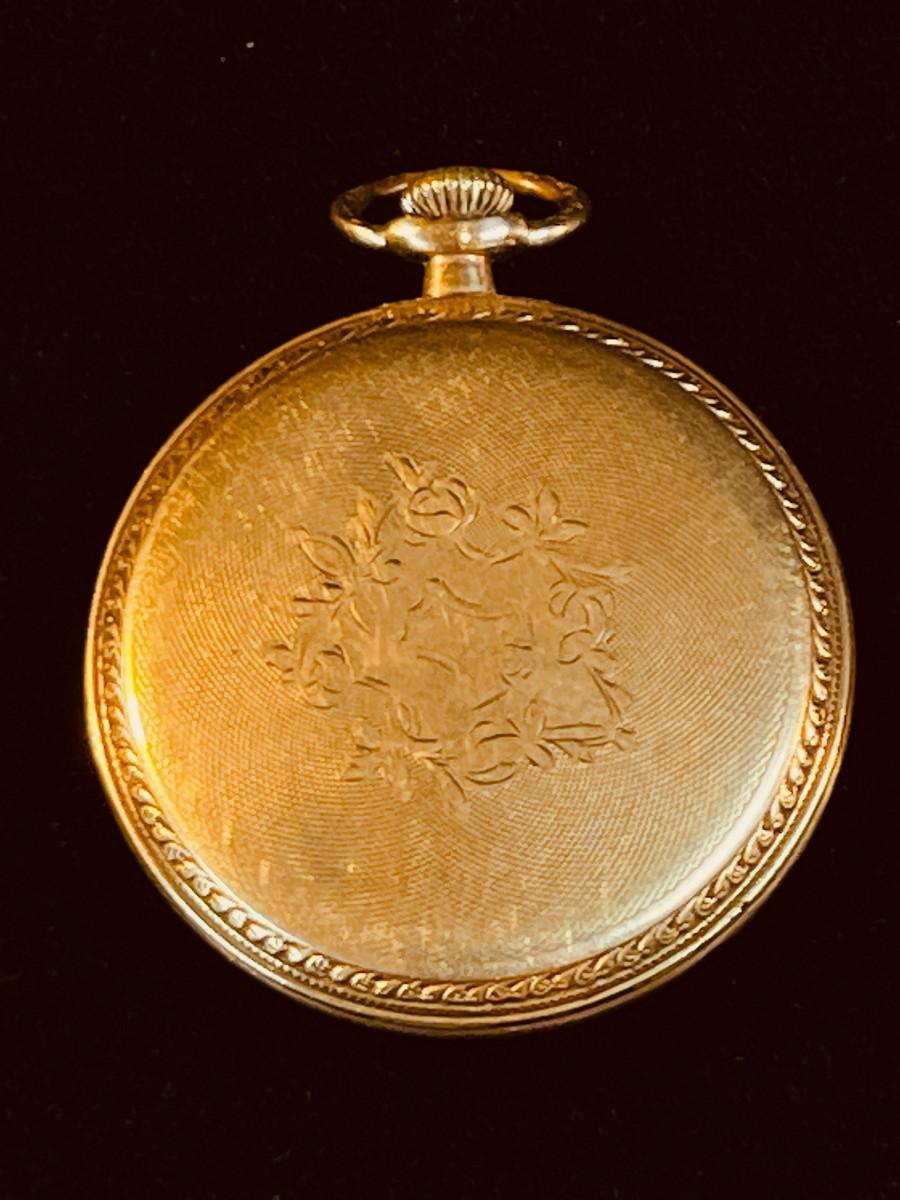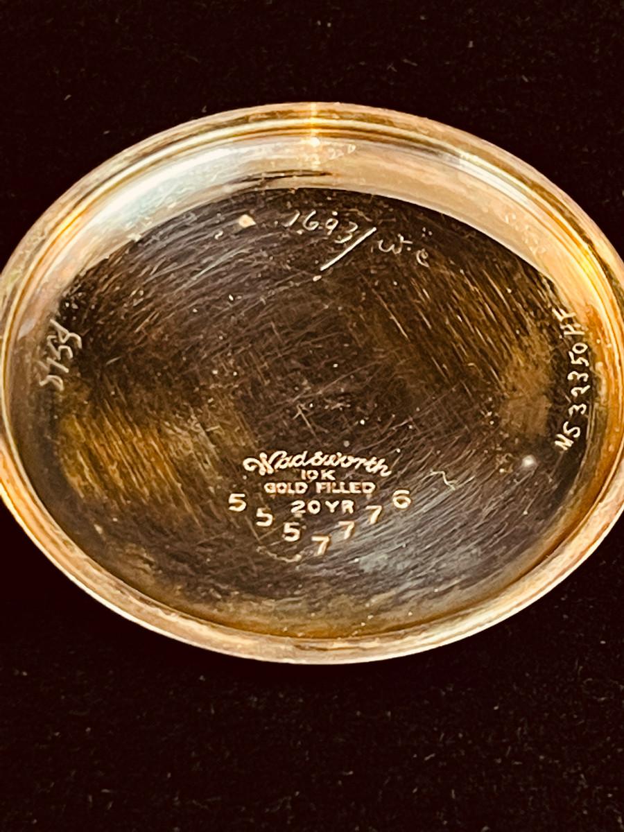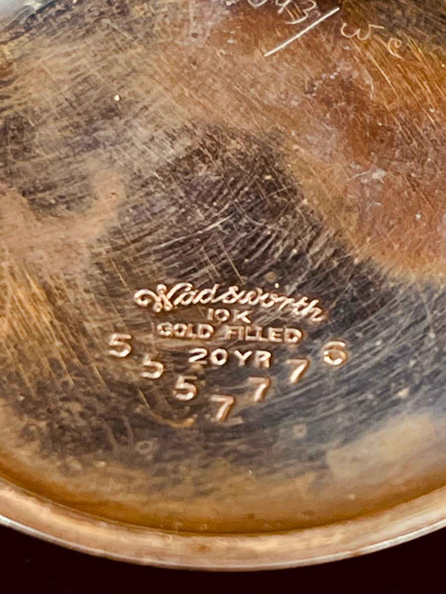 The subject items an antique “Kemnitz” pocket mens watch produced in Fond du Lac, Wisconsin, housed in a Wadsworth 20 yr. 10K yellow gold filled case. The case has been hand-engraved with an elaborate crest surrounded by fine cross-hatching. The watch winds and ticks.
