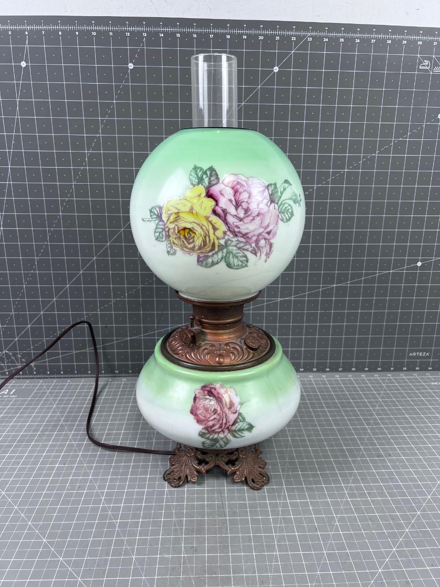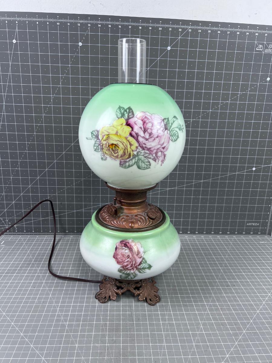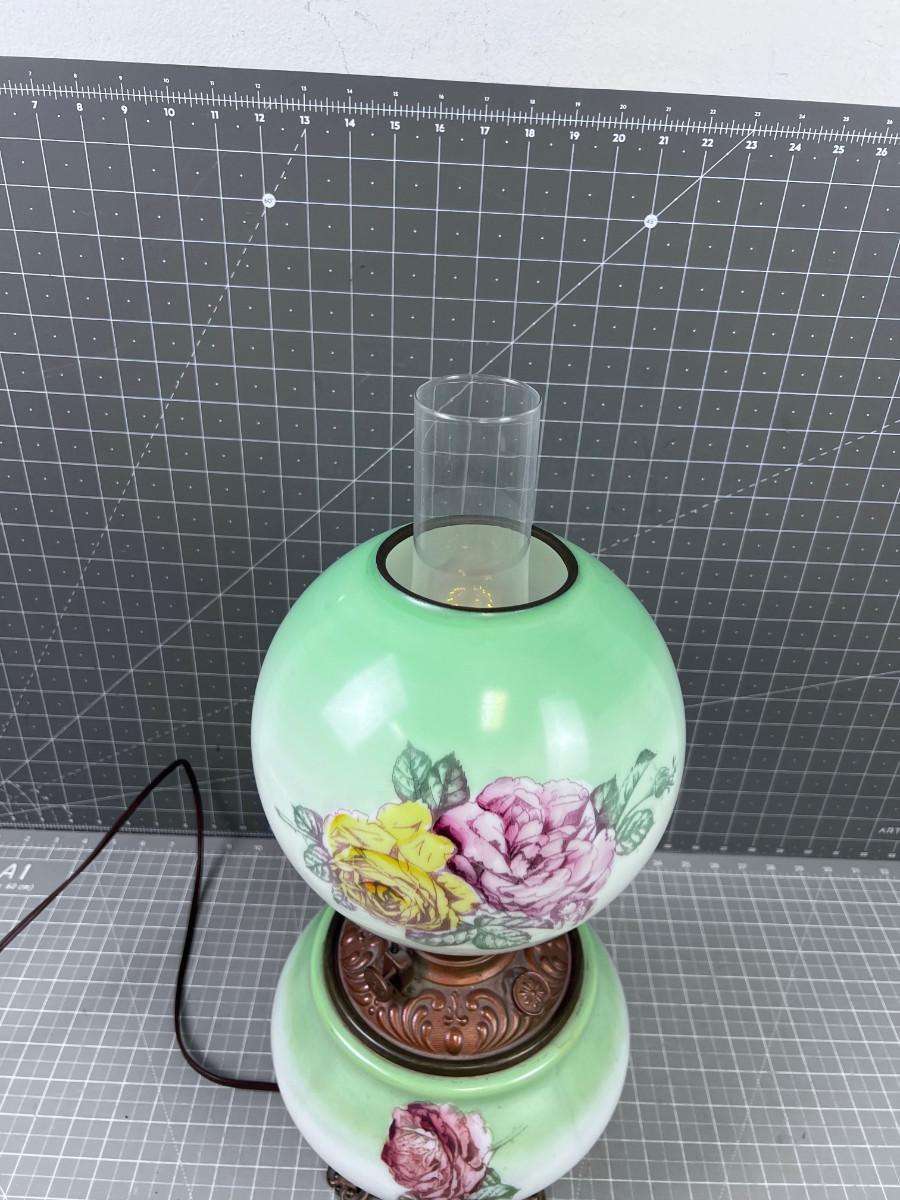 Antique Electrified Kerosene Lamp, Glass Green and Roses