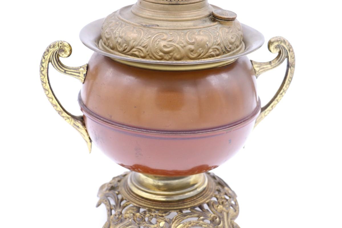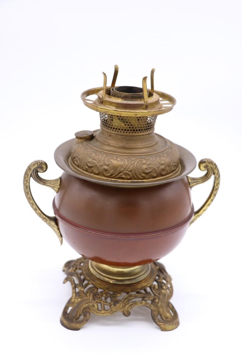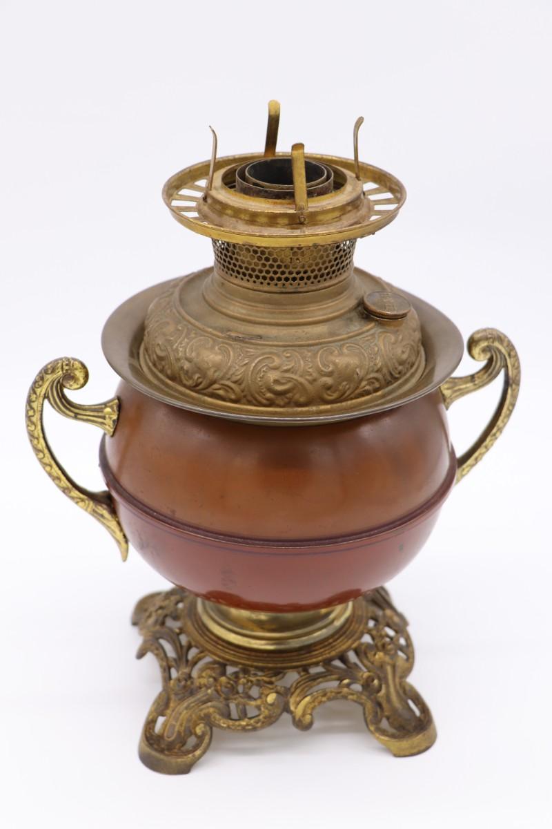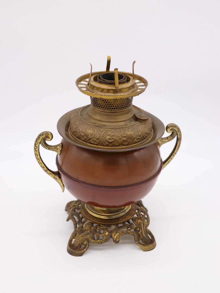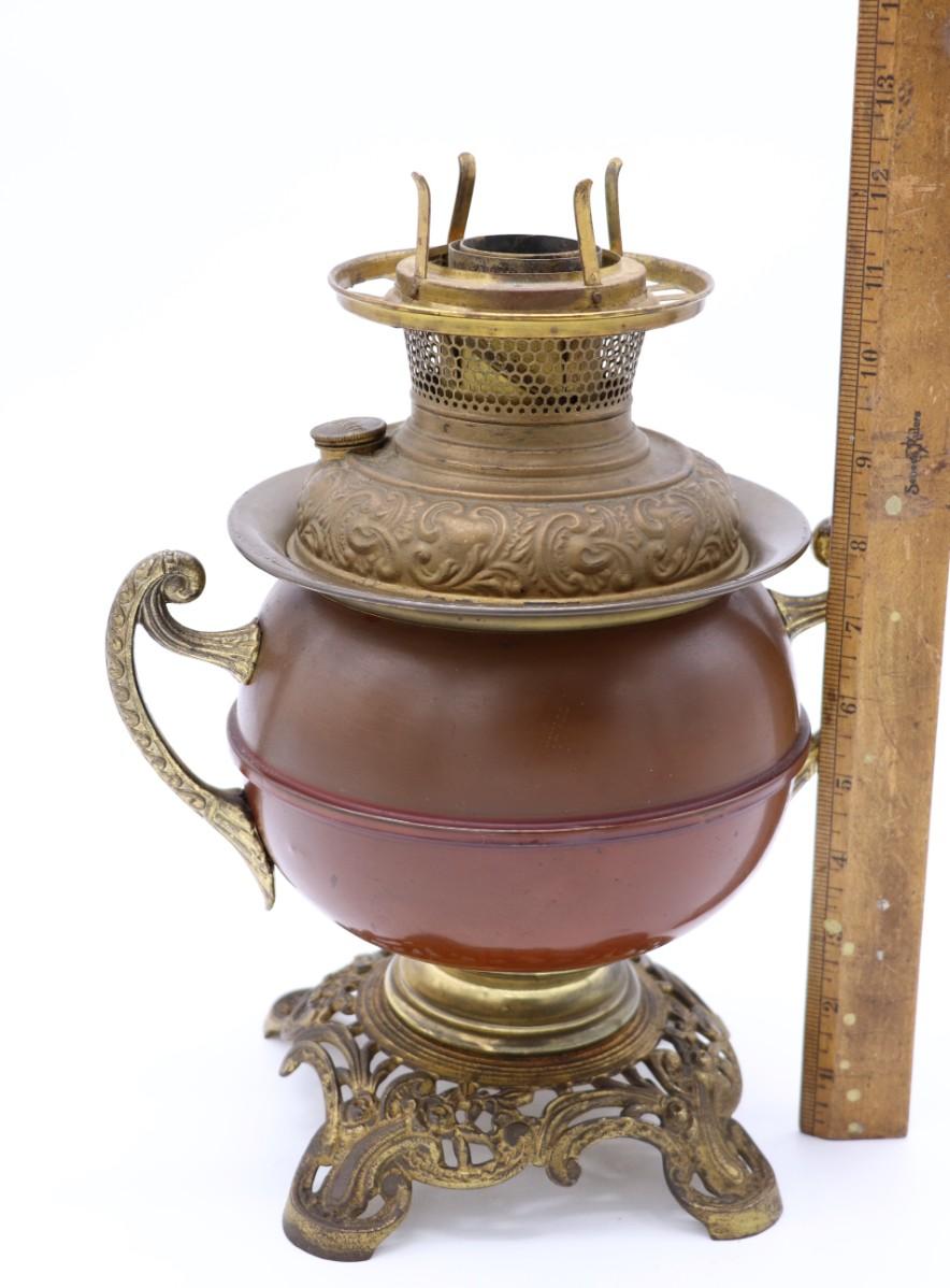 Antique kerosene lamp with beautiful ornate brass finishes and a red/orange center. Bradley and Hubbard burner. From the estate of an antique store owner and lamp enthusiast. Condition as shown.
