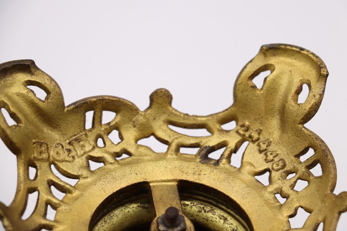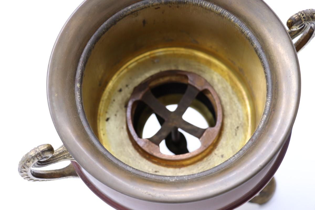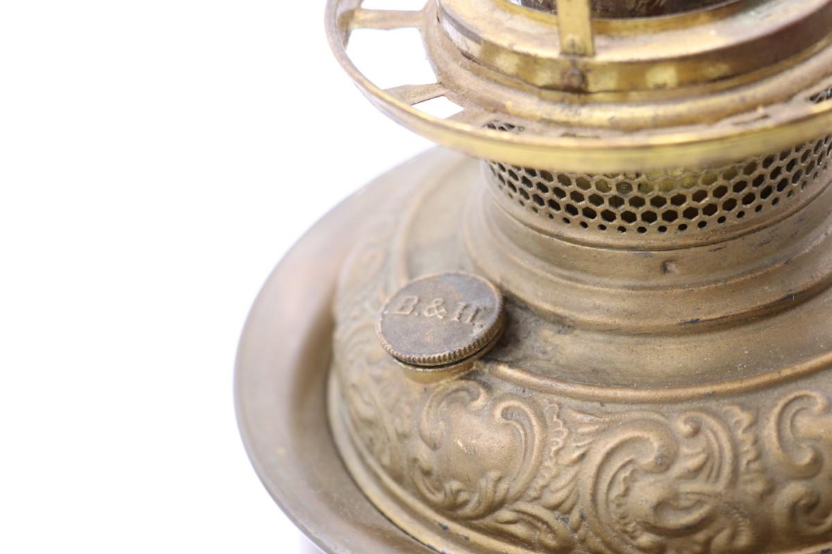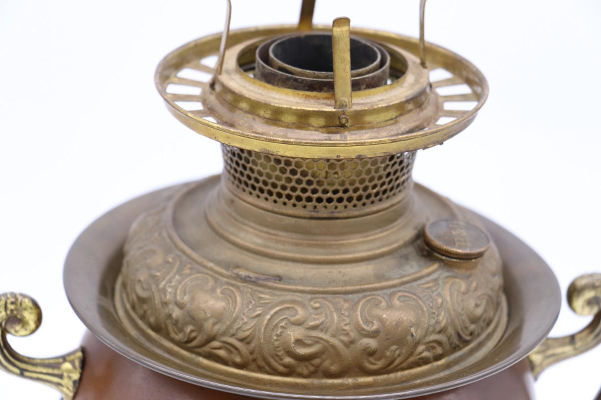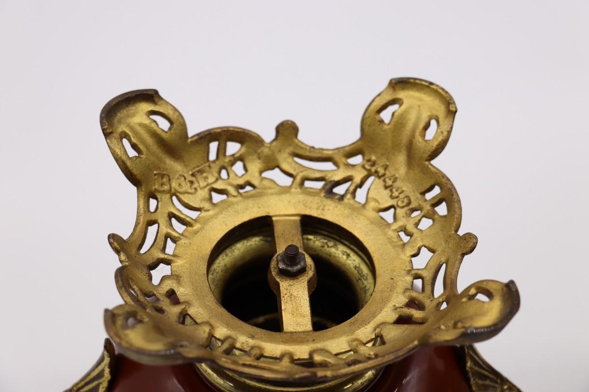 Antique kerosene lamp with beautiful ornate brass finishes and a red/orange center. Bradley and Hubbard burner. From the estate of an antique store owner and lamp enthusiast. Condition as shown.