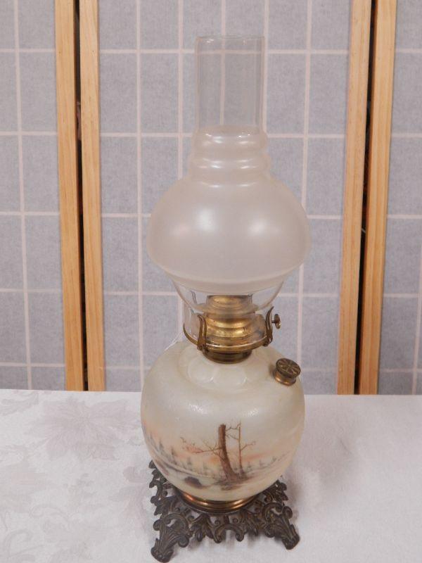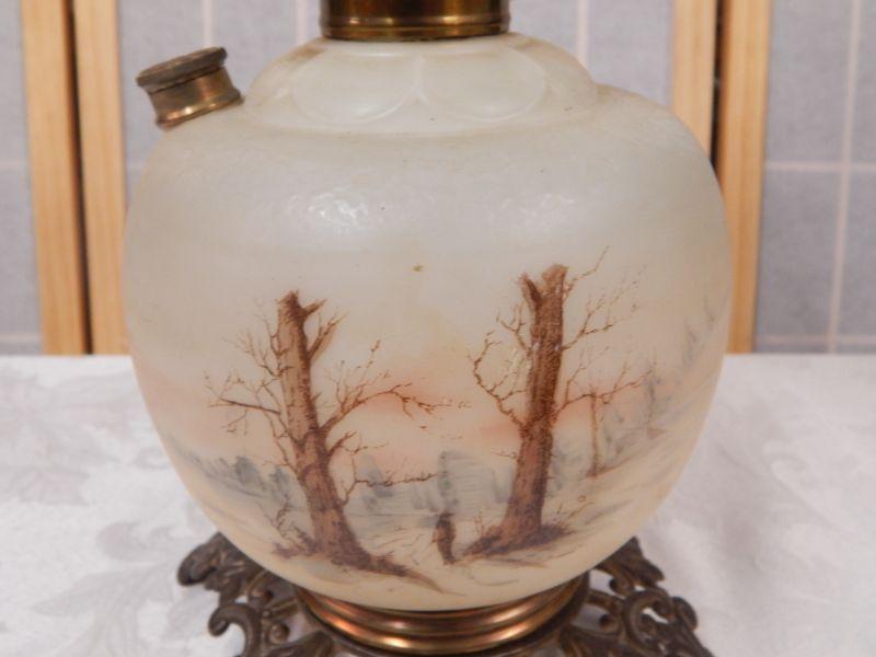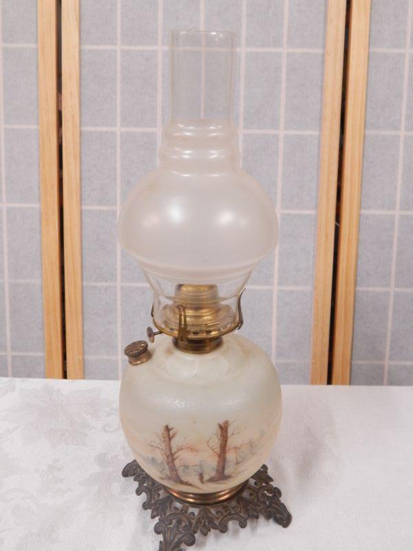 Antique Kerosene Oil Lamp - Cream Glass w/ Painted River Scene - Metal Base - 17-1/2" Tall (8-1/2" Base - 9" Partially Frosted Chimney)