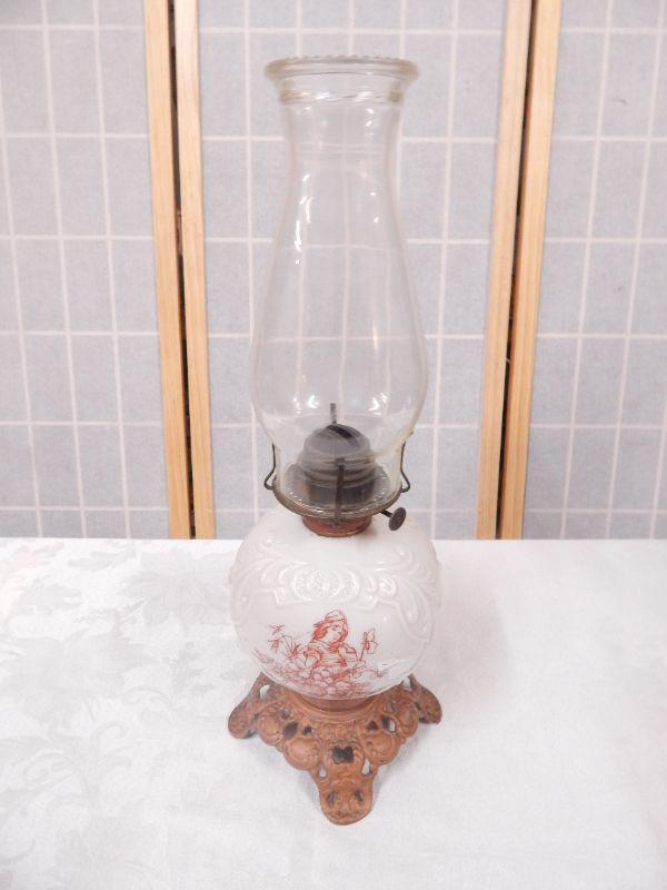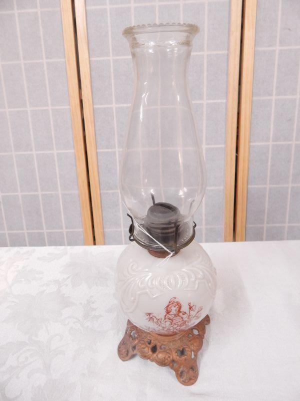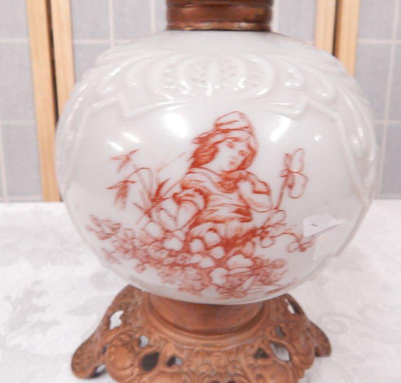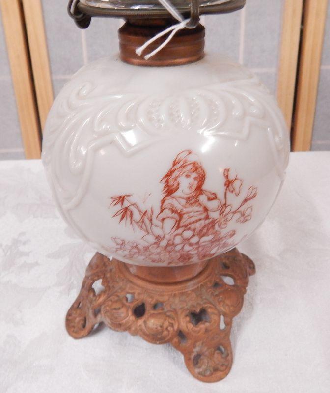 Antique Kerosene Oil Lamp - White Glass w/ Brown Painted Girl w/ Flowers