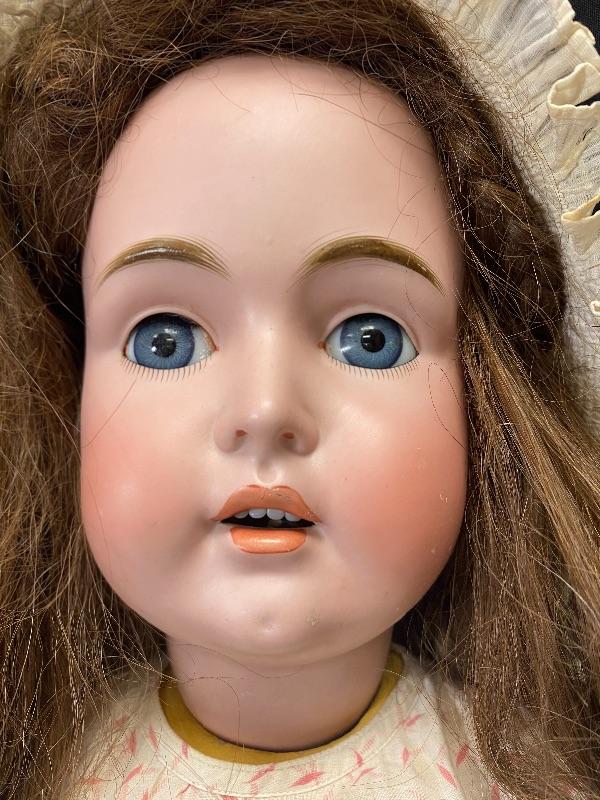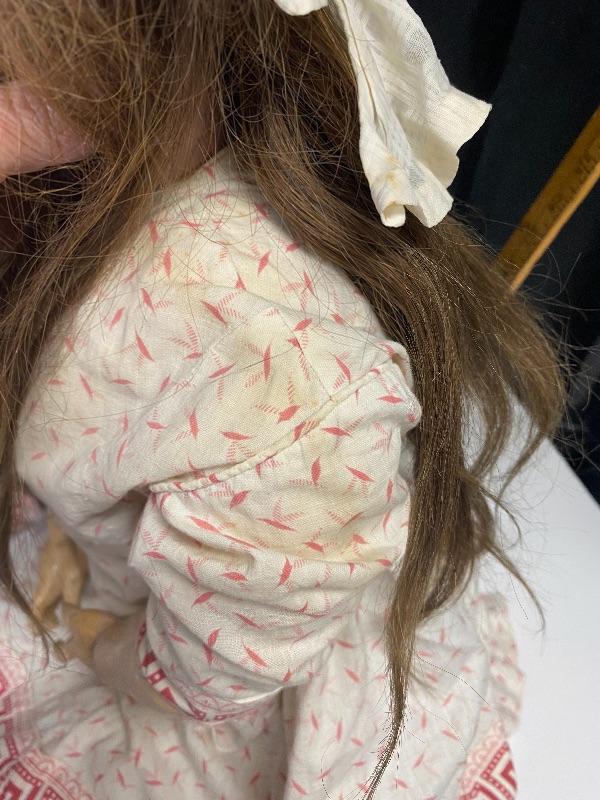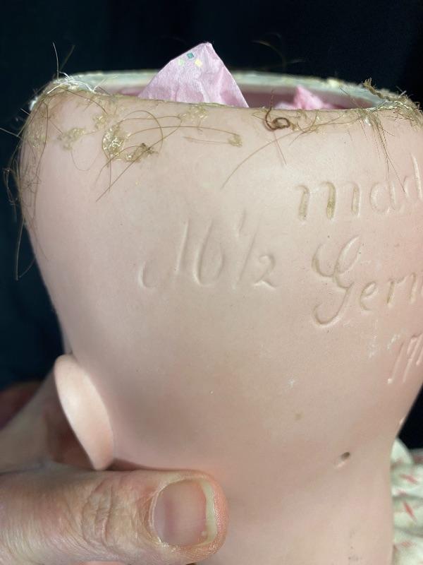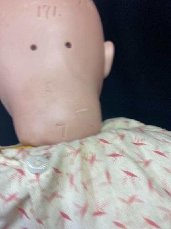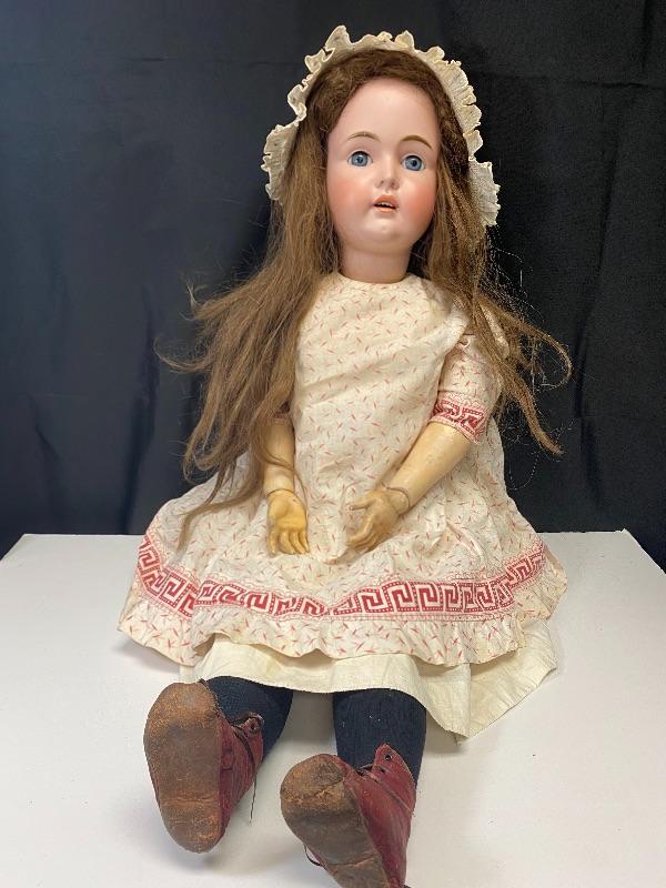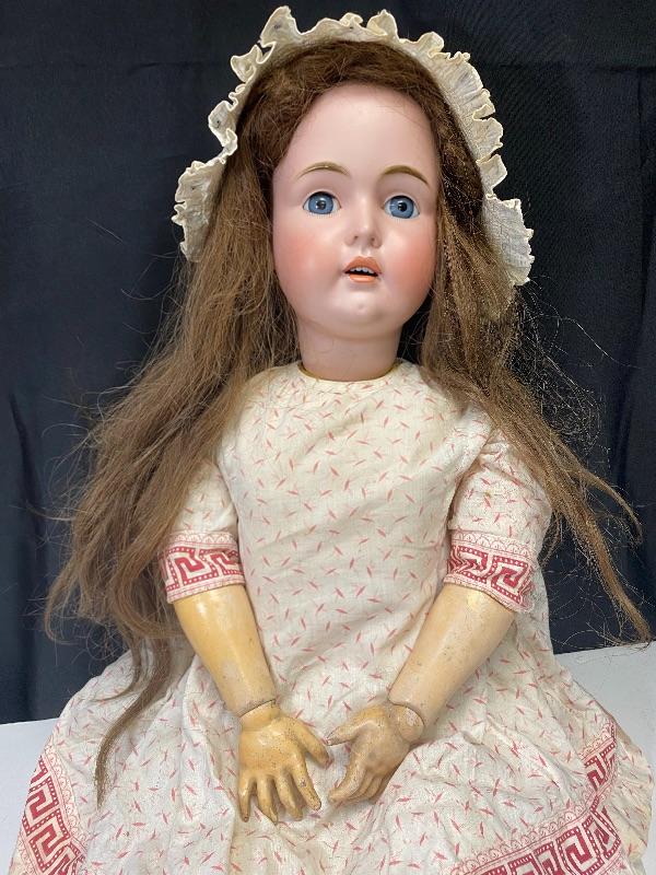 Antique 32" Kestner bisque & composite doll. Bisque head marked "M 1/2 Made in Germany 16 1/2 171 #7". Blue sleep eyes but head has paper in it to keep open, bad lashes. Open mouth with teeth. She may of had her face repainted. Her hair is a real human hair wig, messy, needs to be combed. Composite has wear, has not been redone. Dress has light discolor, shoes worn.