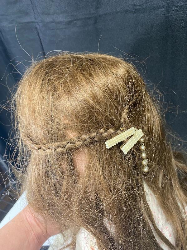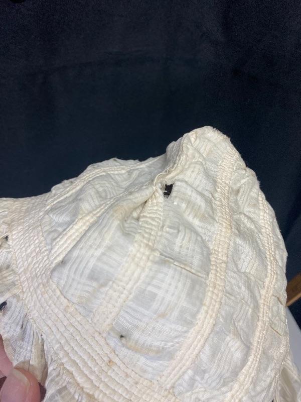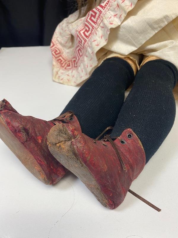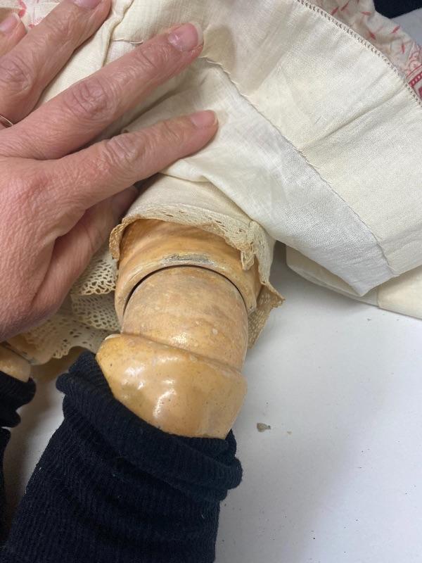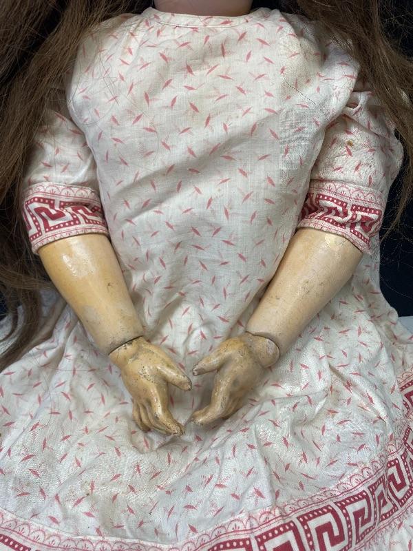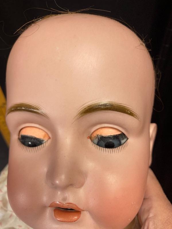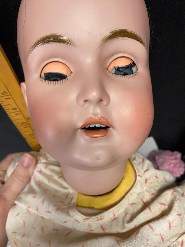 Antique 32" Kestner bisque & composite doll. Bisque head marked "M 1/2 Made in Germany 16 1/2 171 #7". Blue sleep eyes but head has paper in it to keep open, bad lashes. Open mouth with teeth. She may of had her face repainted. Her hair is a real human hair wig, messy, needs to be combed. Composite has wear, has not been redone. Dress has light discolor, shoes worn.