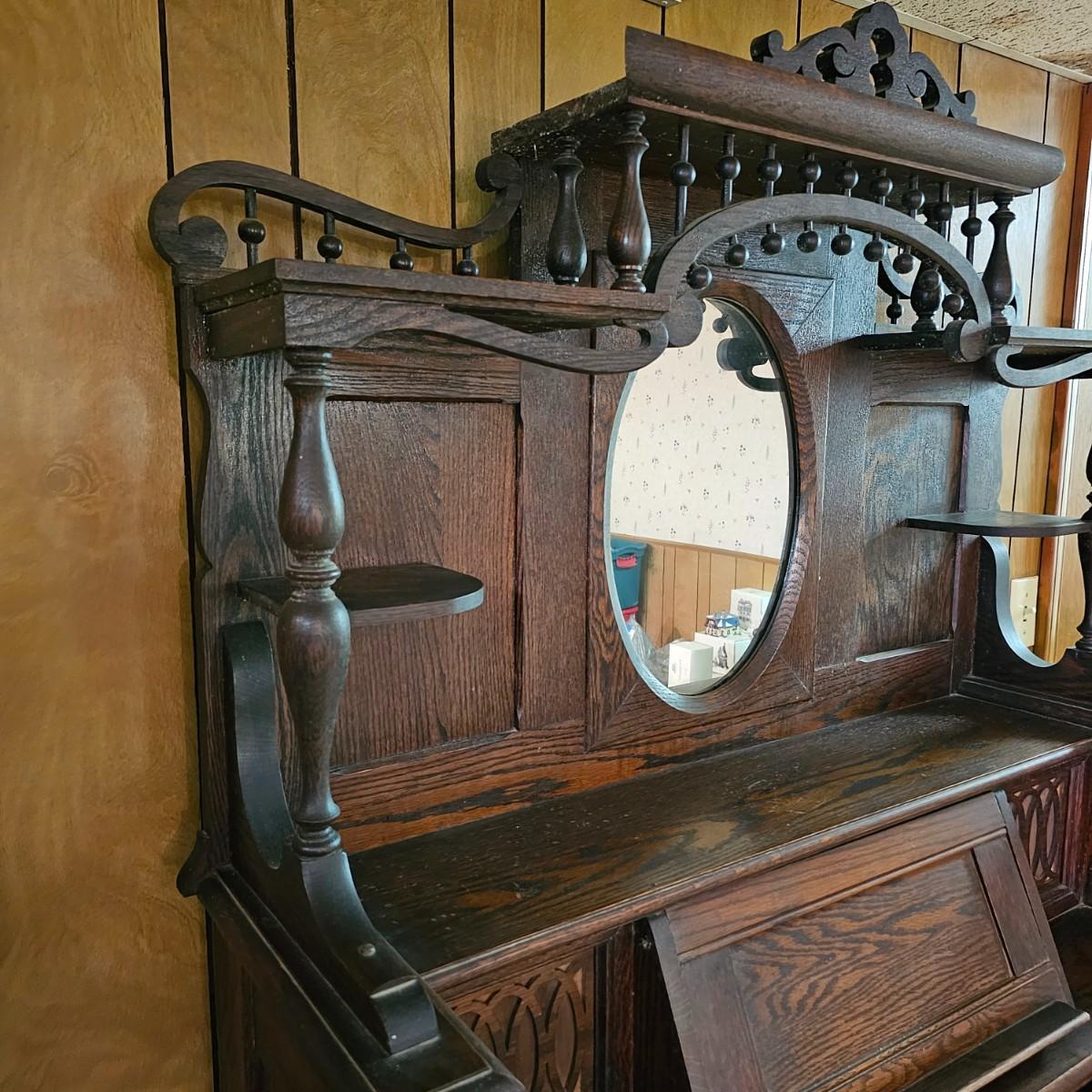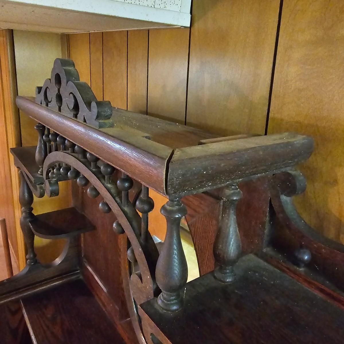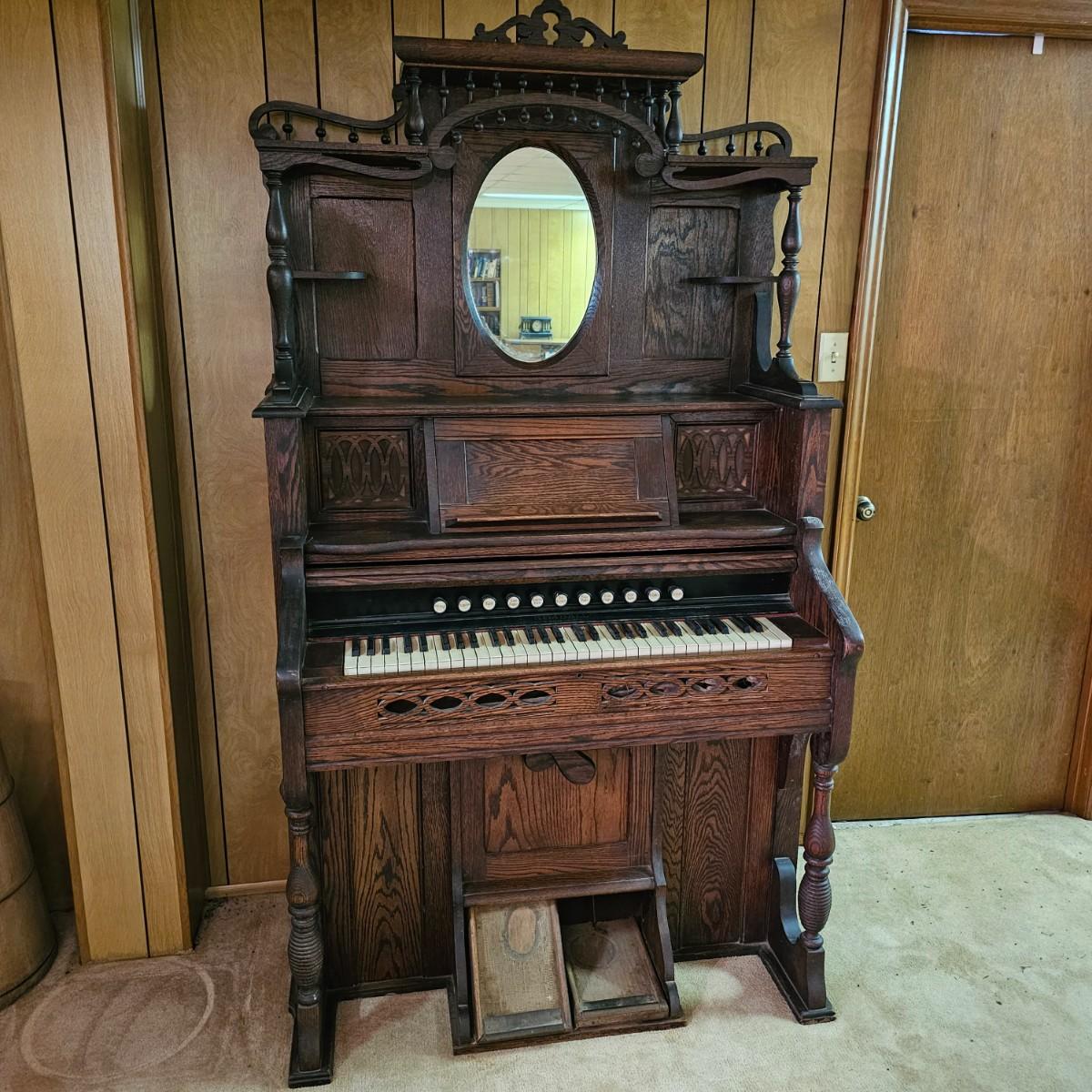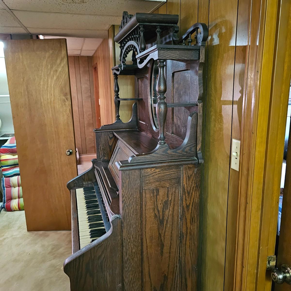 Made from solid oak, this Kimball organ is probably from the 1920's or earlier. Non- functioning at this time but still elegant in it's design and beauty. An oval mirror is surrounded by shelves and decorative finial elements. Keyboard door cover pieces are present but not connected. An original Kimball teaching book is also included, see photos for details. Local pickup only. Winning bidder must bring assistance to help move and load this item due to its weight and/or size.