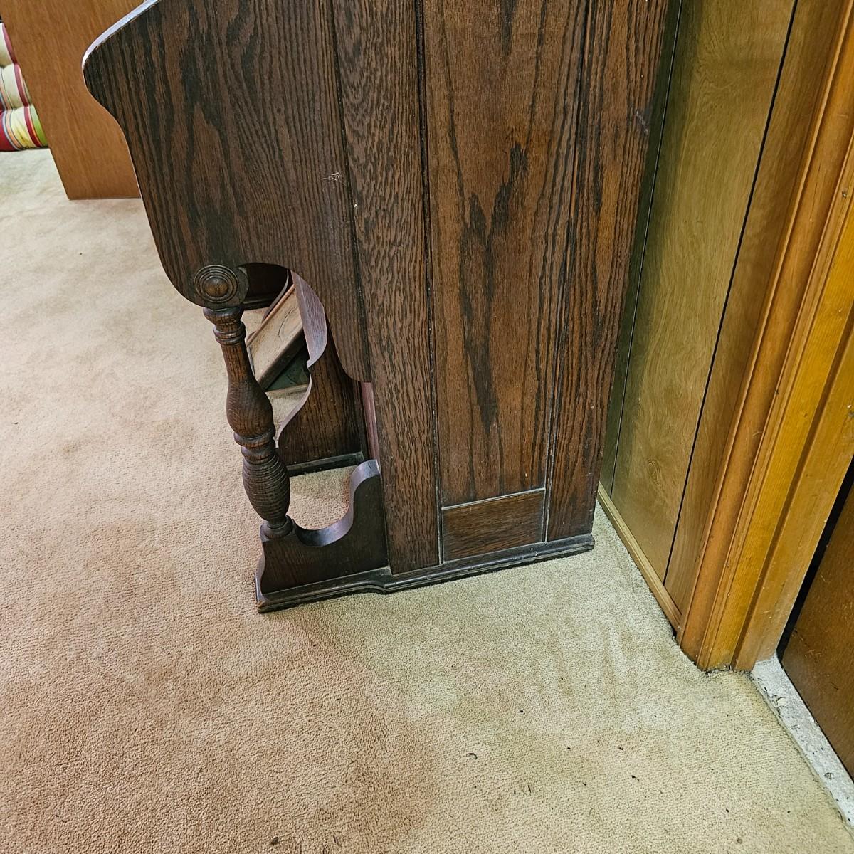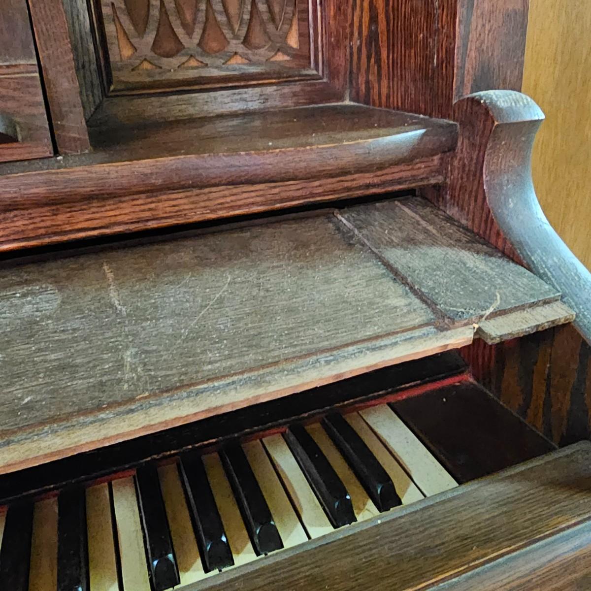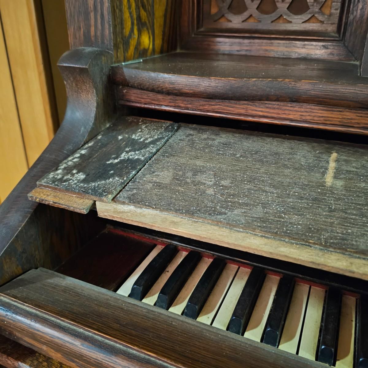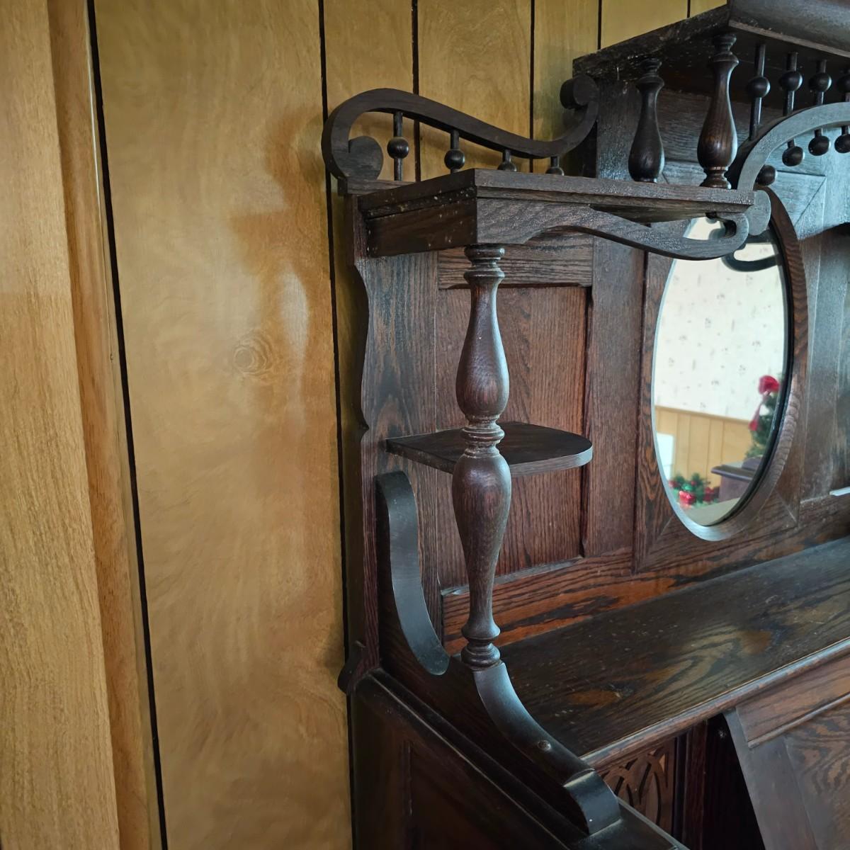 Made from solid oak, this Kimball organ is probably from the 1920's or earlier. Non- functioning at this time but still elegant in it's design and beauty. An oval mirror is surrounded by shelves and decorative finial elements. Keyboard door cover pieces are present but not connected. An original Kimball teaching book is also included, see photos for details. Local pickup only. Winning bidder must bring assistance to help move and load this item due to its weight and/or size.
