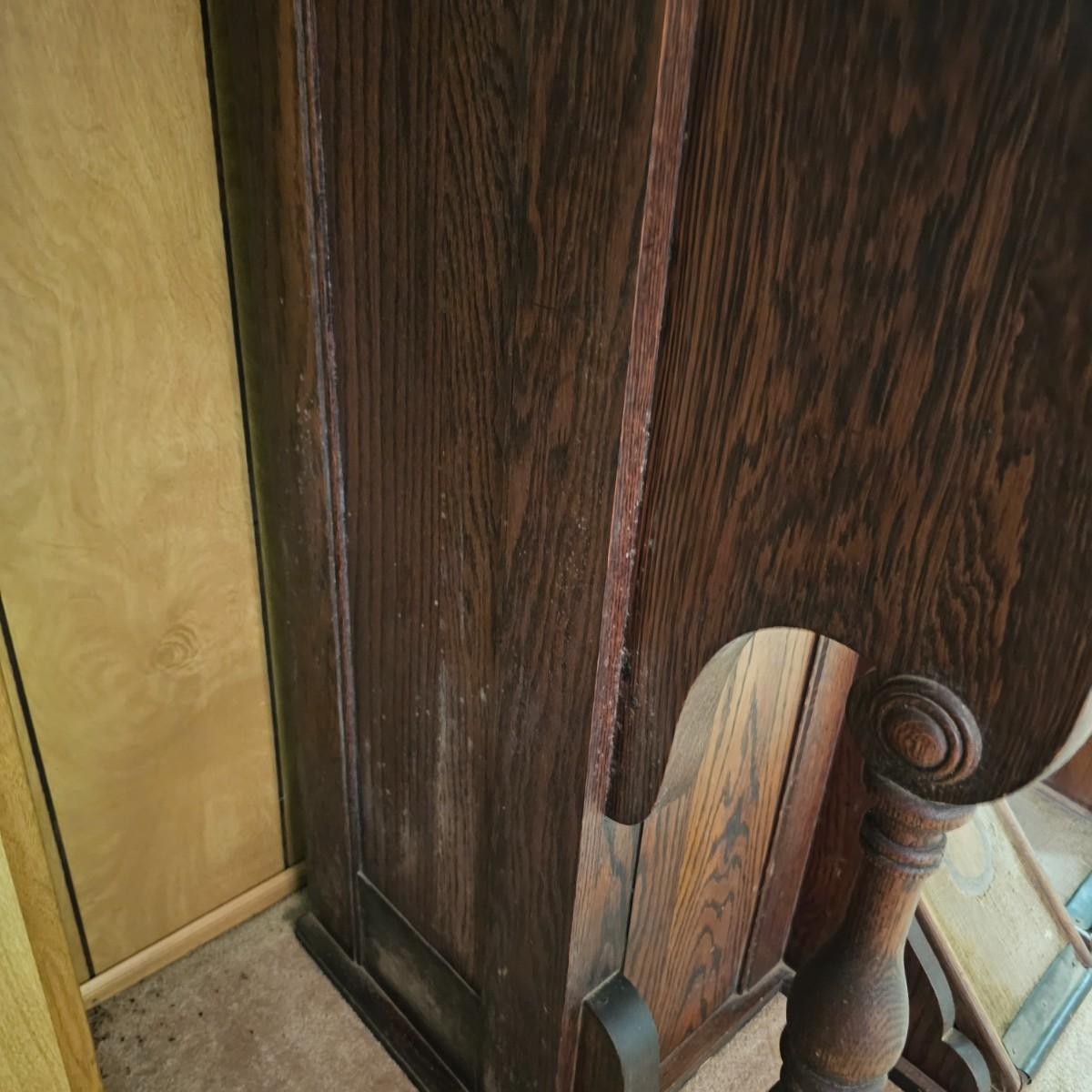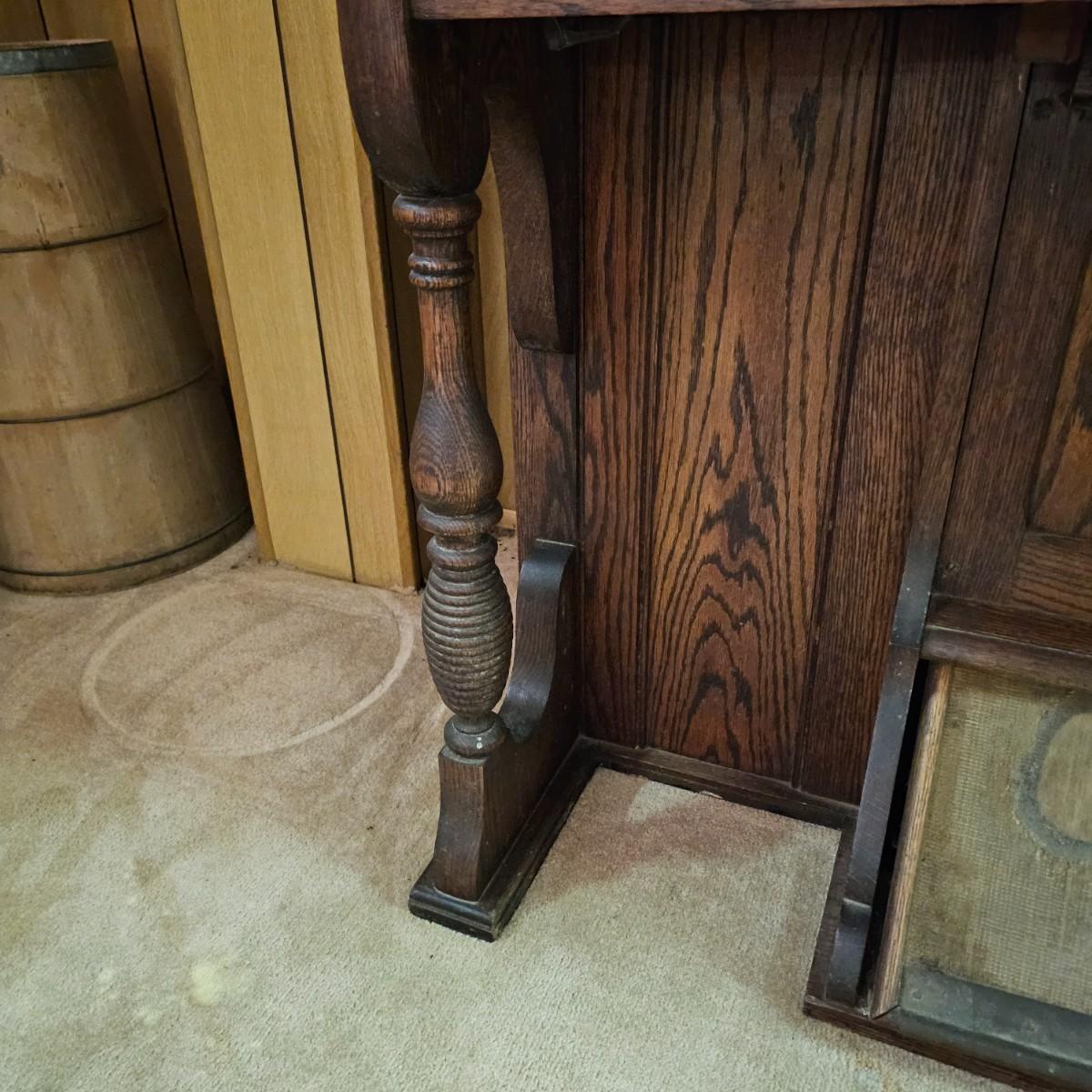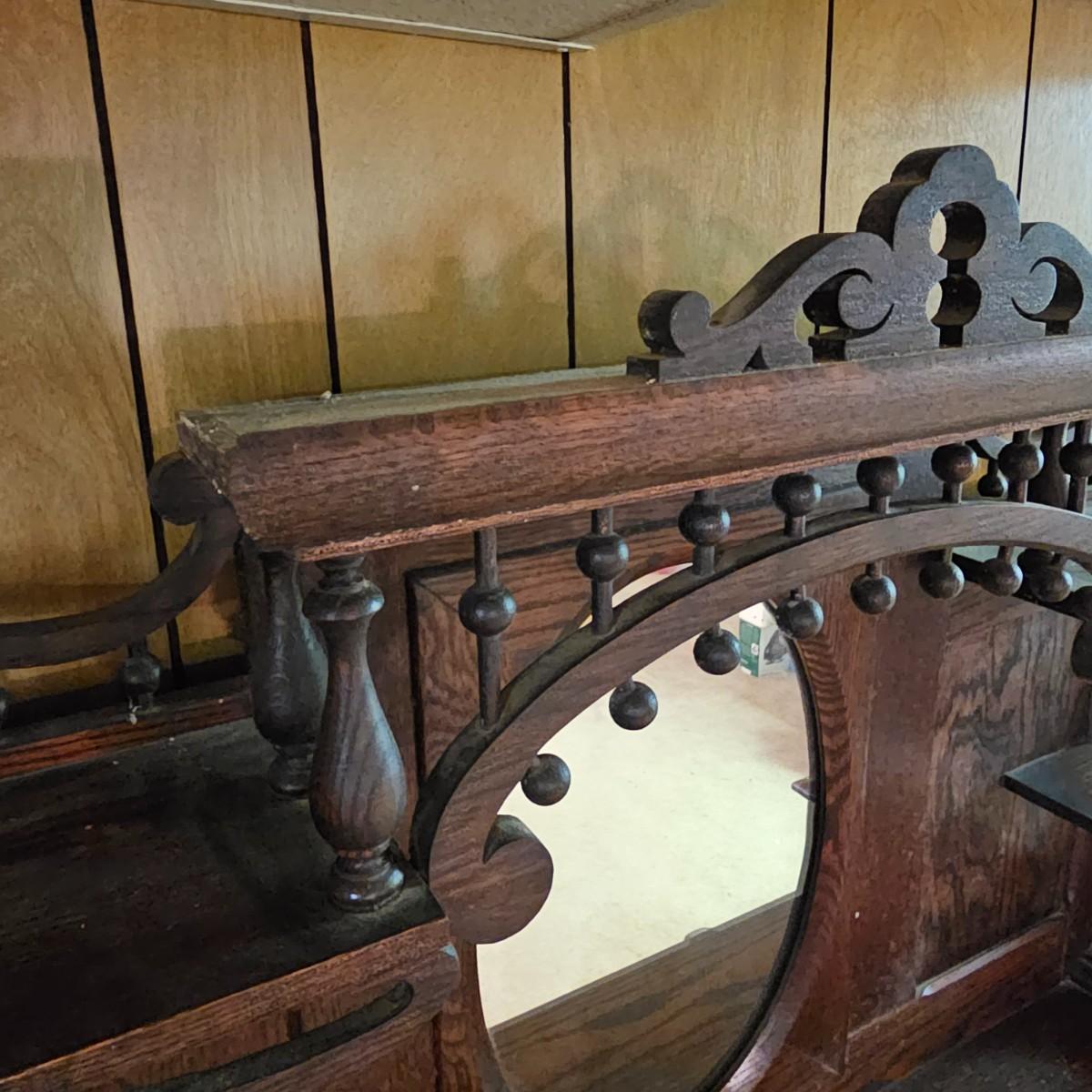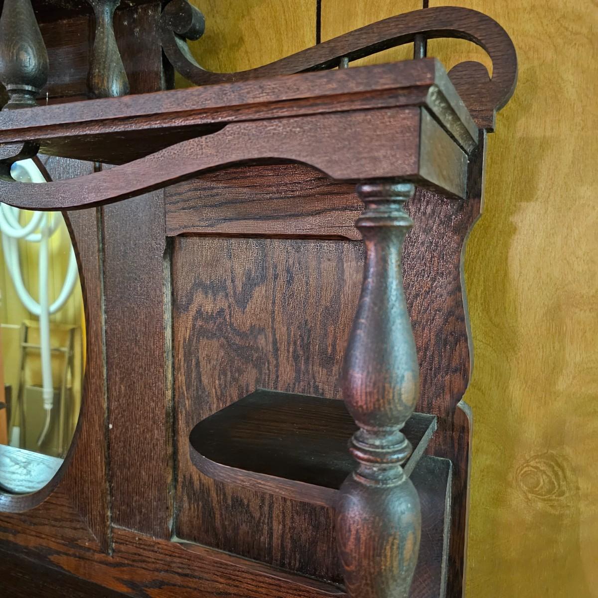 Made from solid oak, this Kimball organ is probably from the 1920's or earlier. Non- functioning at this time but still elegant in it's design and beauty. An oval mirror is surrounded by shelves and decorative finial elements. Keyboard door cover pieces are present but not connected. An original Kimball teaching book is also included, see photos for details. Local pickup only. Winning bidder must bring assistance to help move and load this item due to its weight and/or size.
