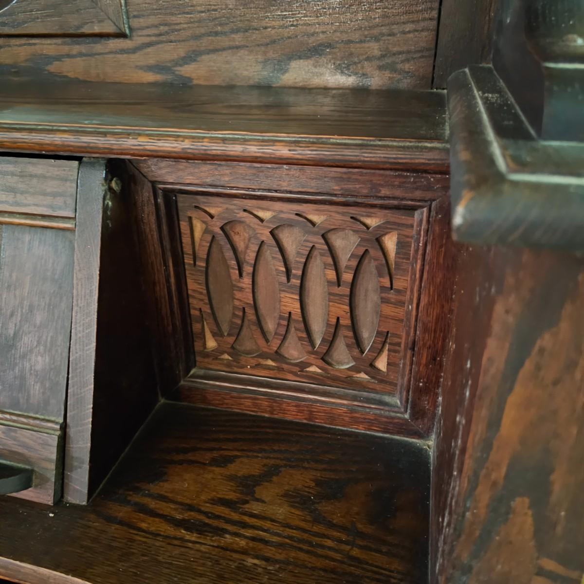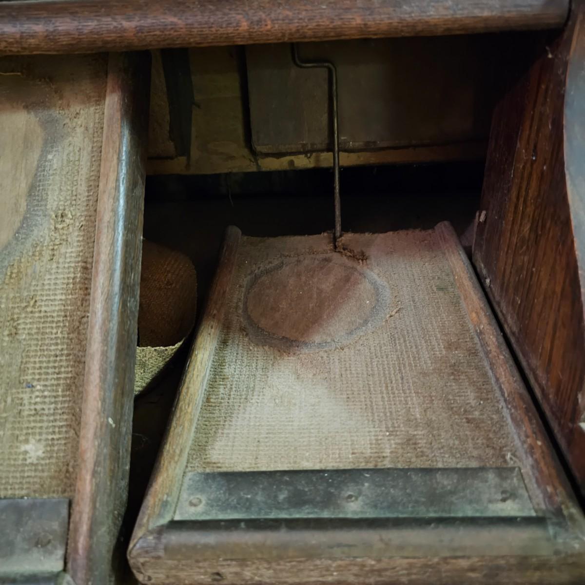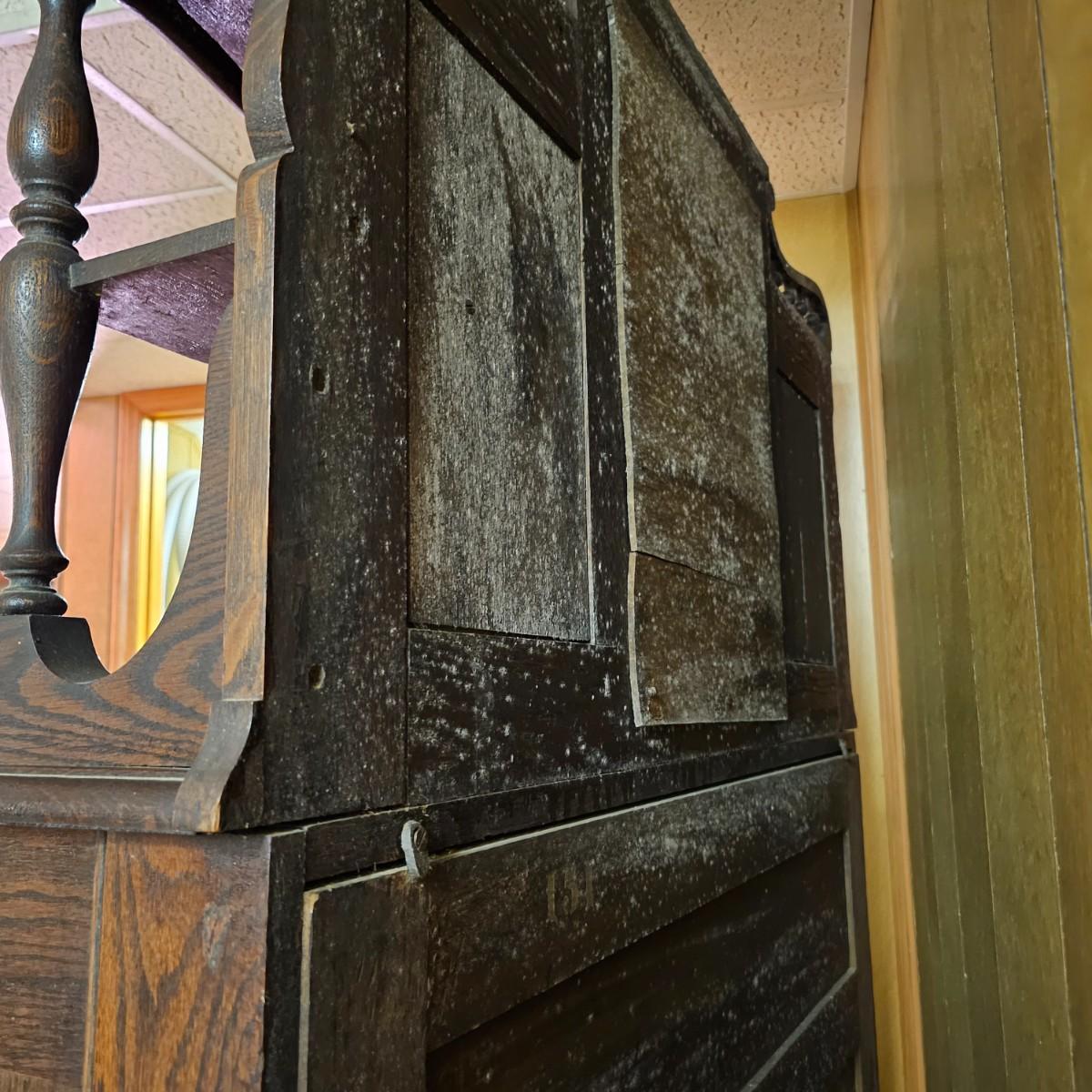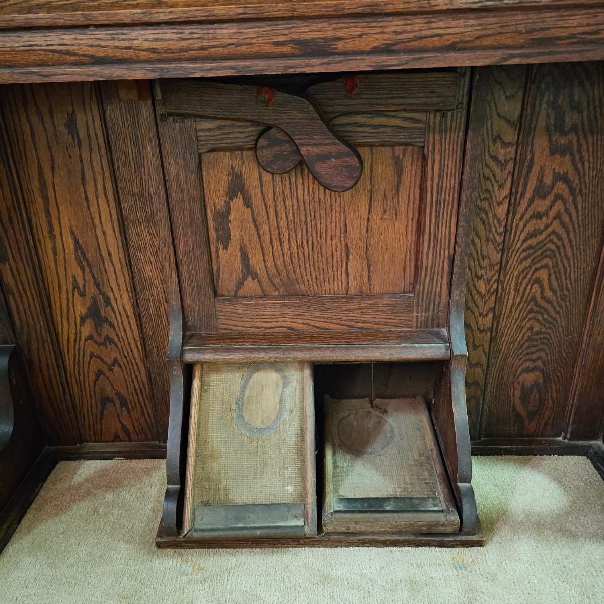 Made from solid oak, this Kimball organ is probably from the 1920's or earlier. Non- functioning at this time but still elegant in it's design and beauty. An oval mirror is surrounded by shelves and decorative finial elements. Keyboard door cover pieces are present but not connected. An original Kimball teaching book is also included, see photos for details. Local pickup only. Winning bidder must bring assistance to help move and load this item due to its weight and/or size.