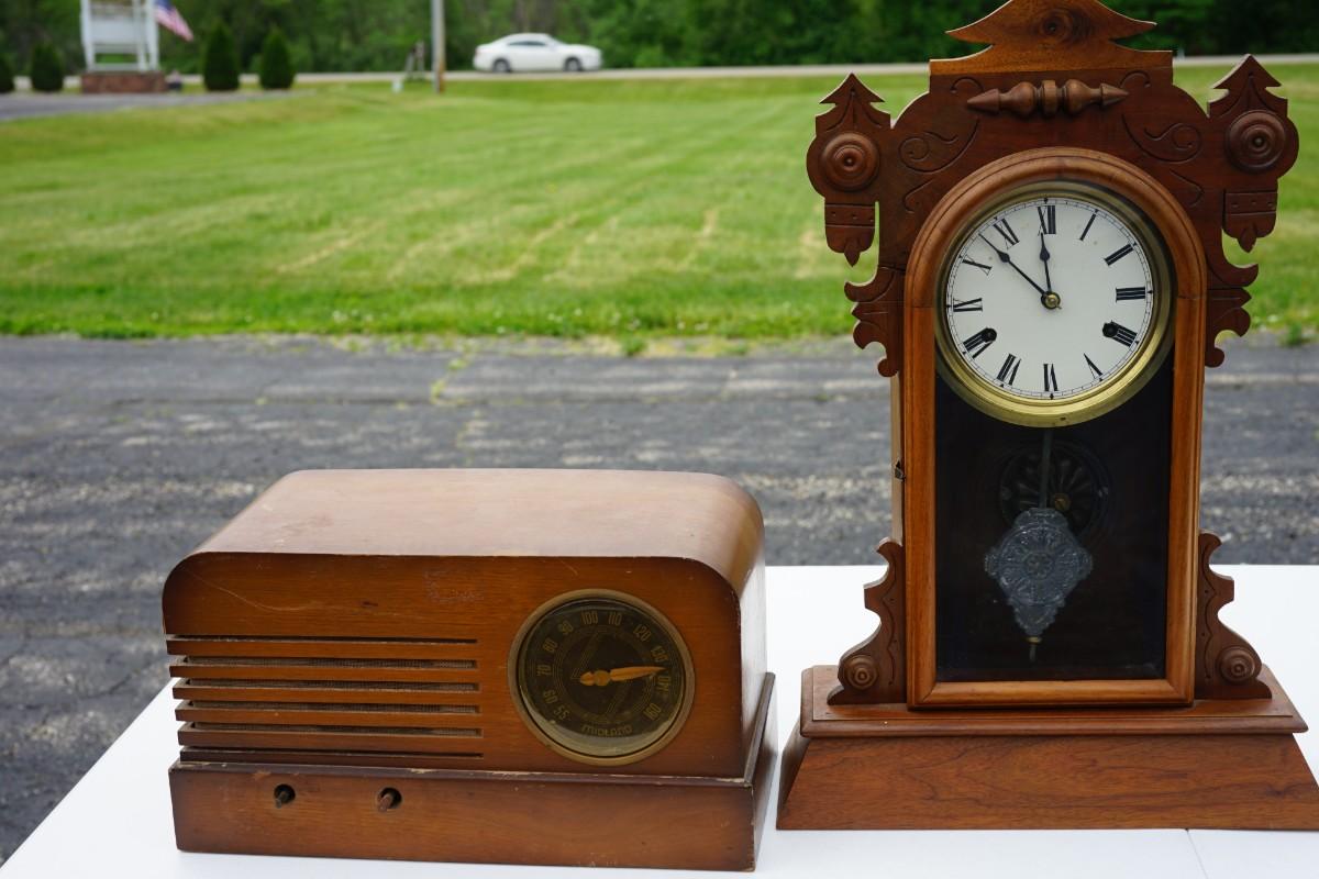 ANTIQUE KITCHEN MANTEL CLOCK/ 1940'S TABLE TOP RADIO ( AS IS )