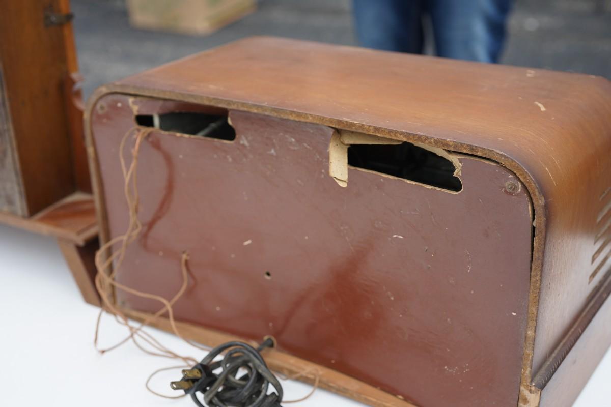 The table top radio is missing the knobs and the finish is poor. More for a project to restore or a shelf display.