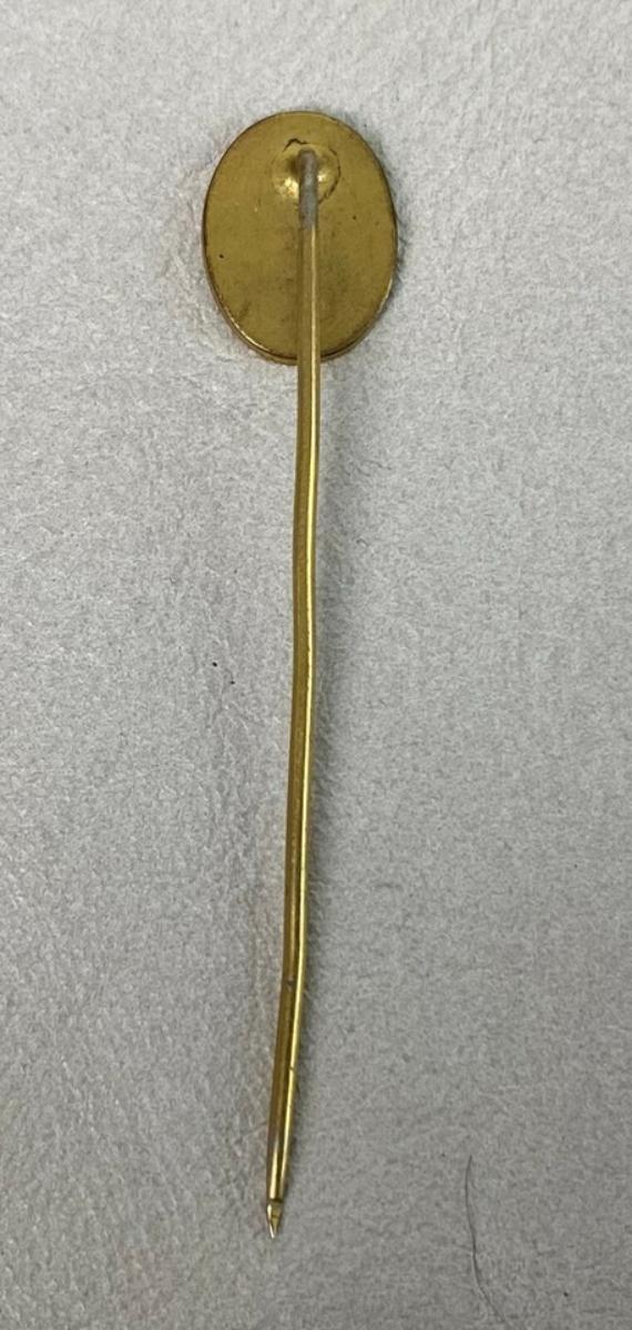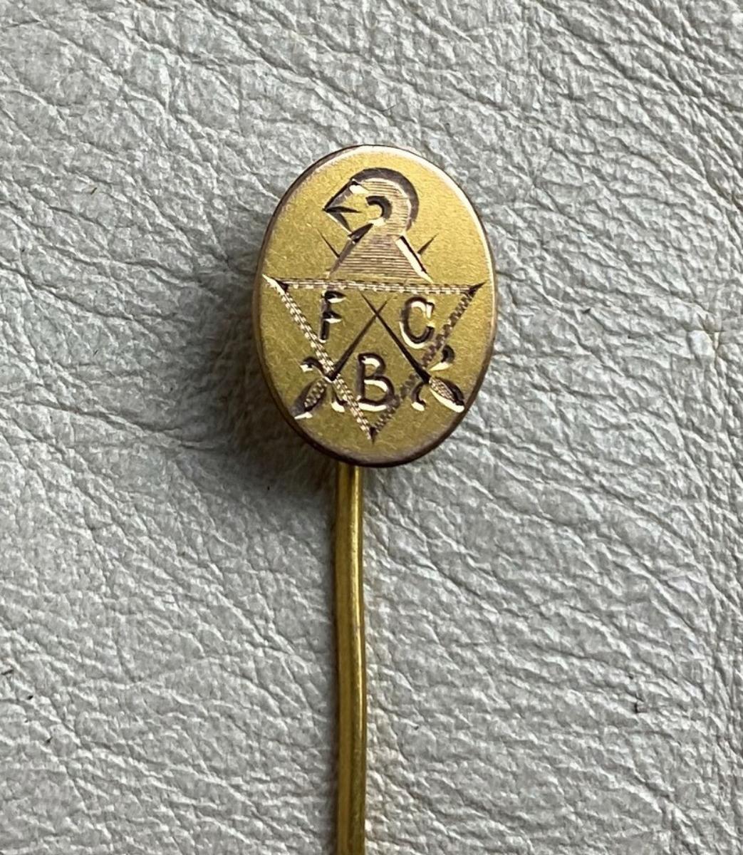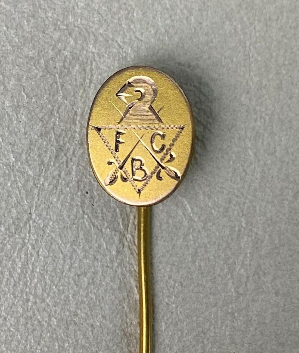 an antique gold plated stick pin from a member of the Knights of Pythias fraternal organization...Engraved with the letters FCB which stands for the Pythian motto, "Friendship, charity, and benevolence."...swords and the crest...2 3/8 inches long...as shown...Stamped HA & CO. which could be Hans Aigner of Austria?