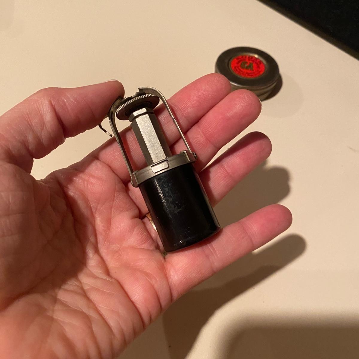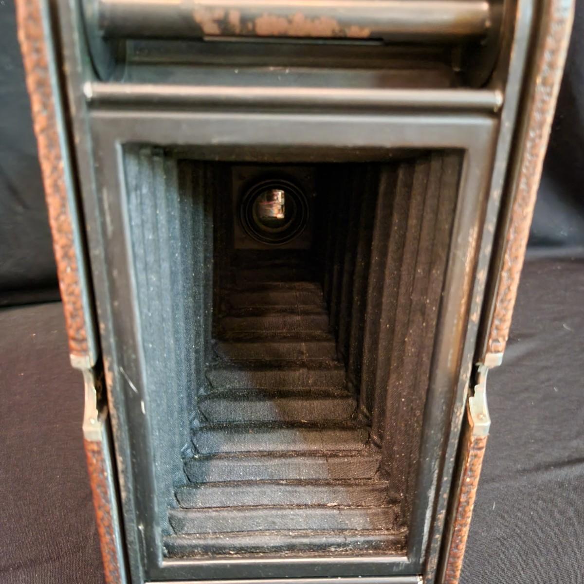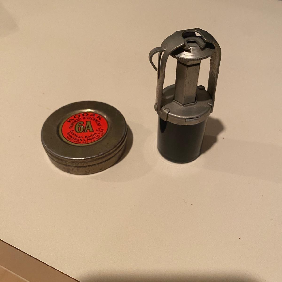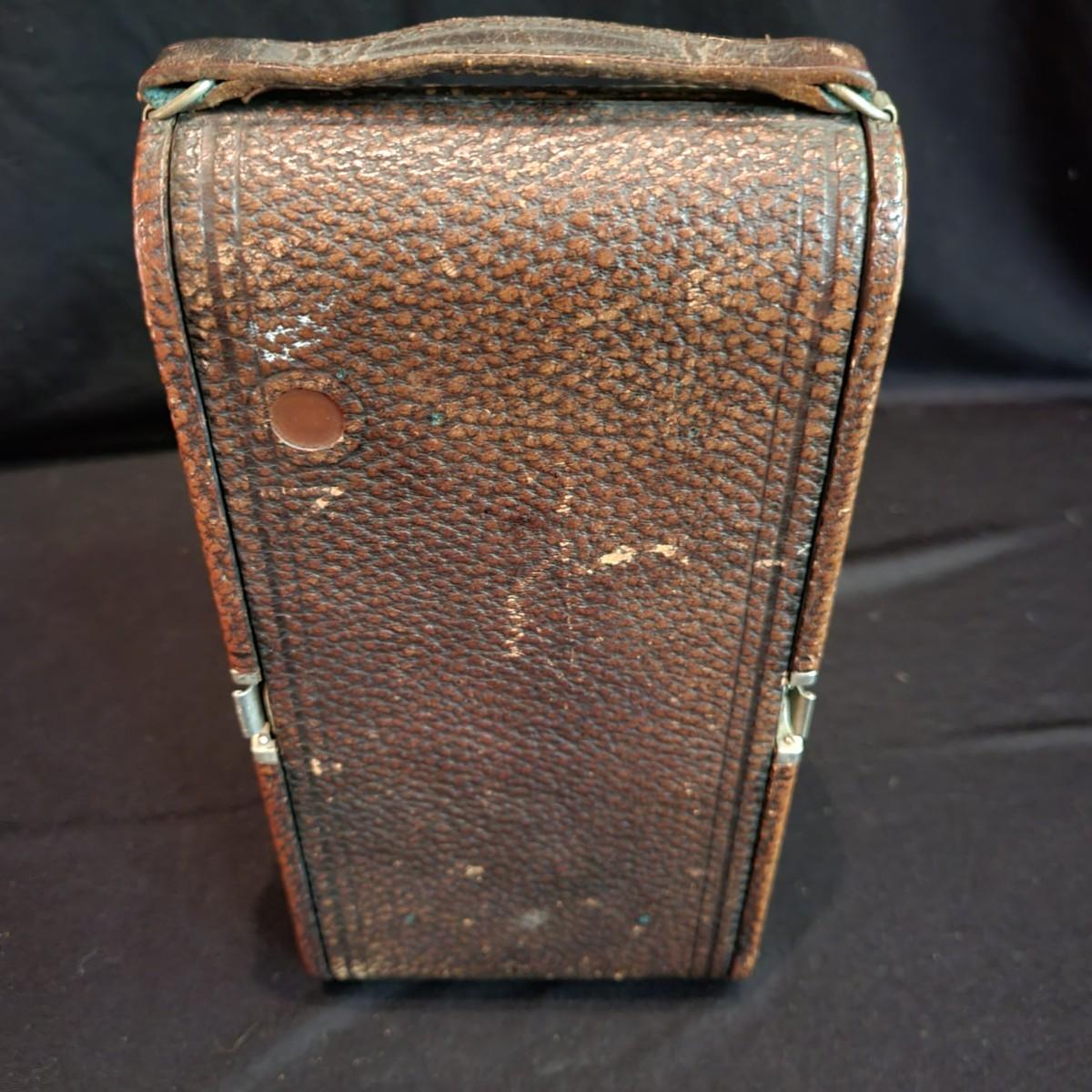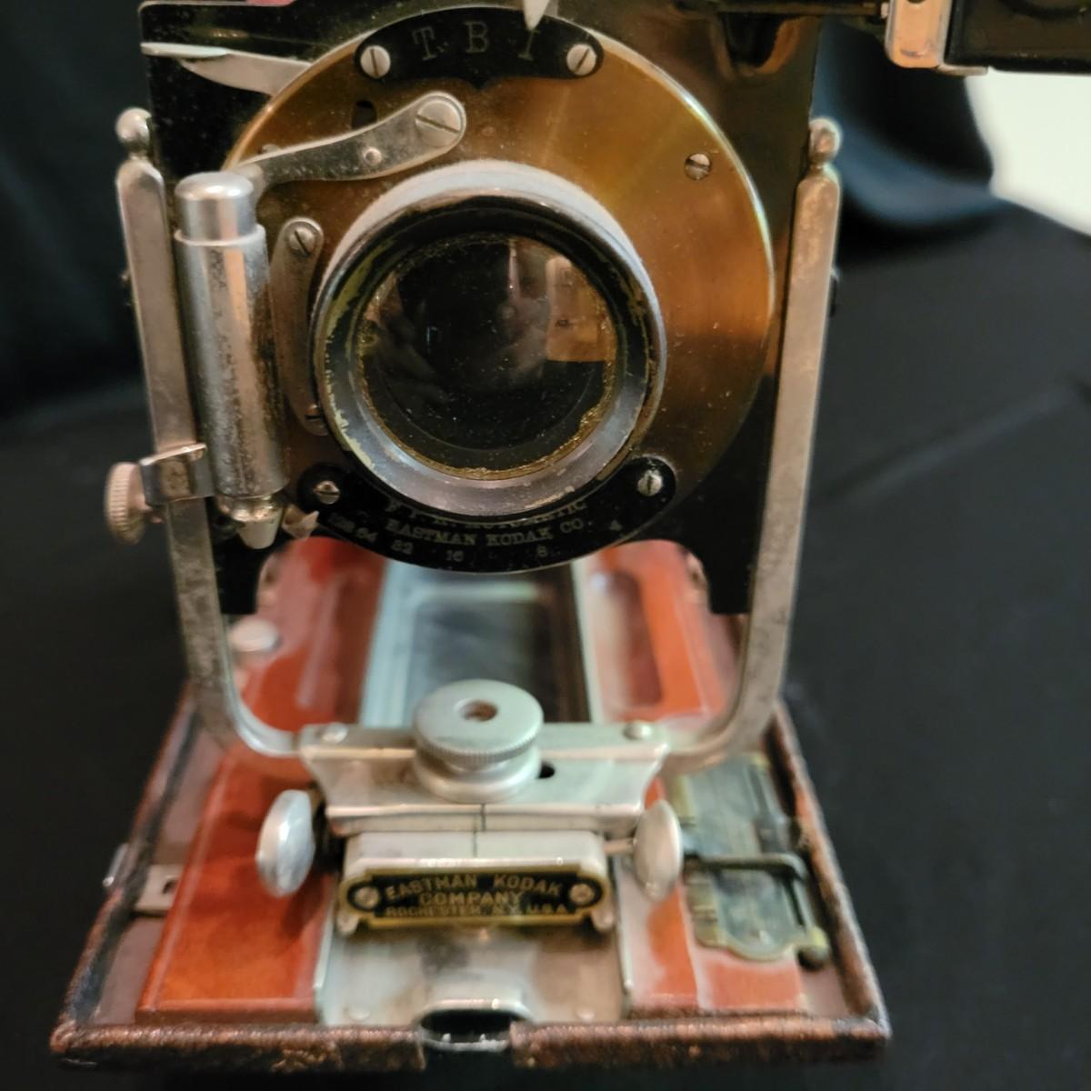 An antique No 3A folding picket camera manufactured by Kodak. The leather baffle is intact and the shutter mechanism still seems to function properly. Folded, this camera measures approximately 10" x 5" x 2"H. Lot also includes vintage Kodak Lens and Self Timer button. Shipping available