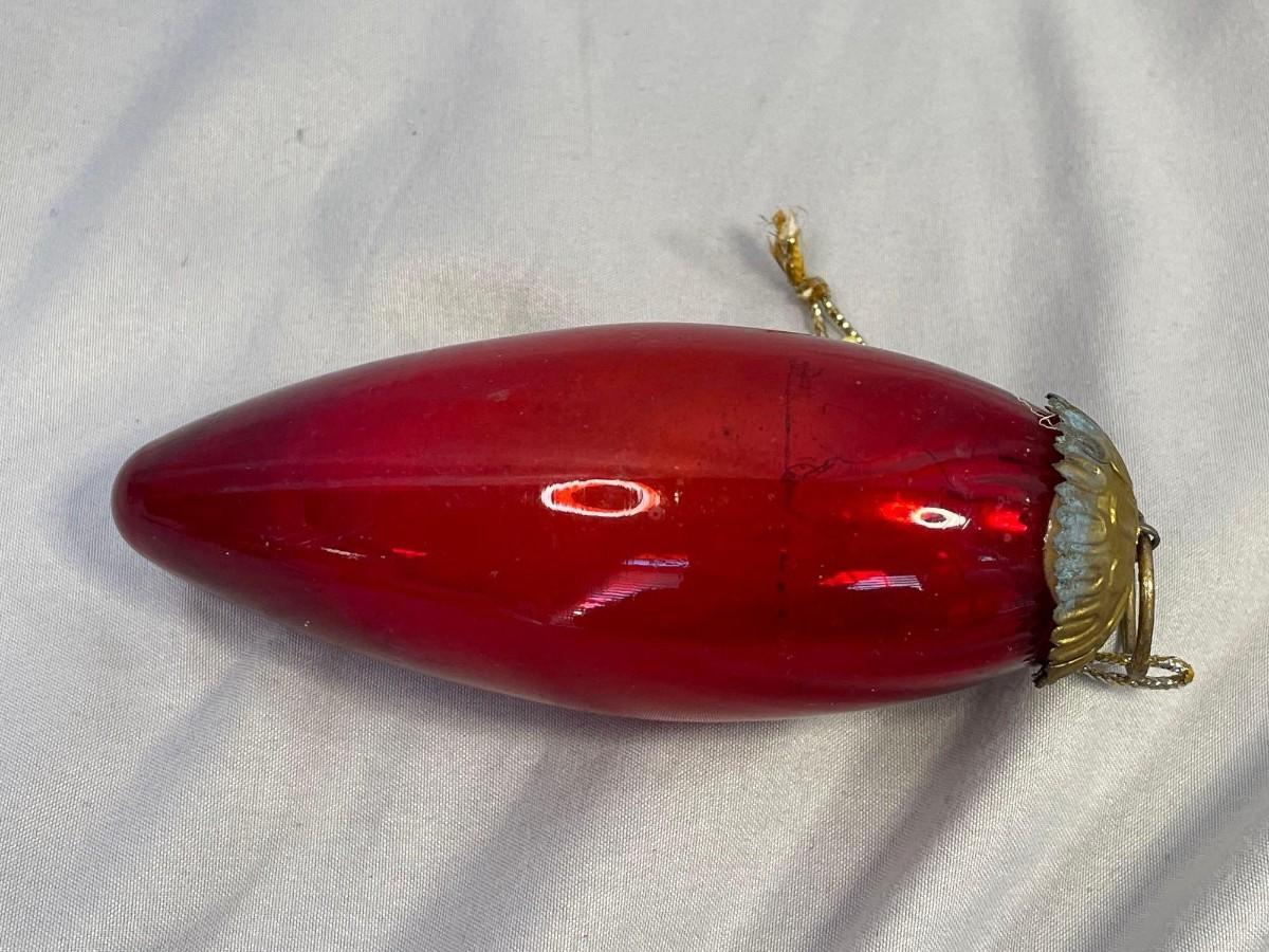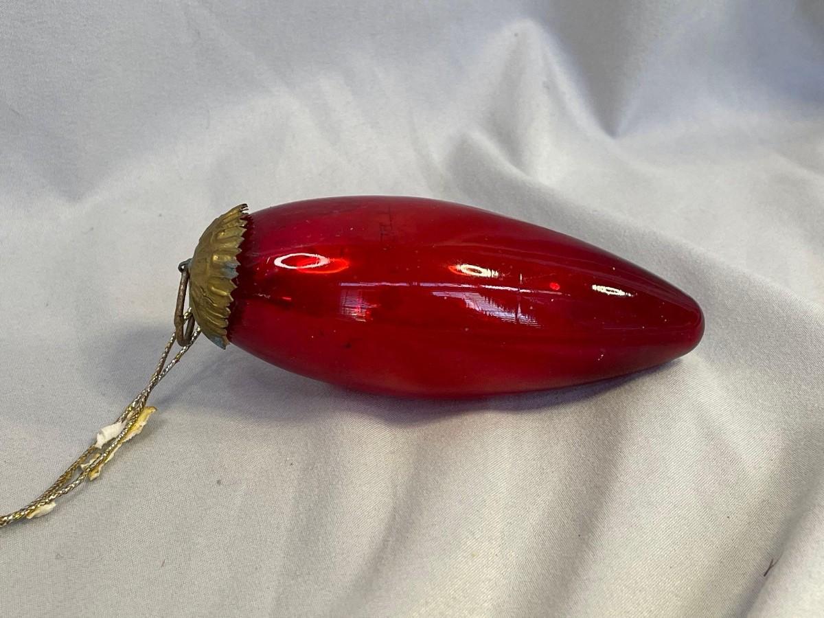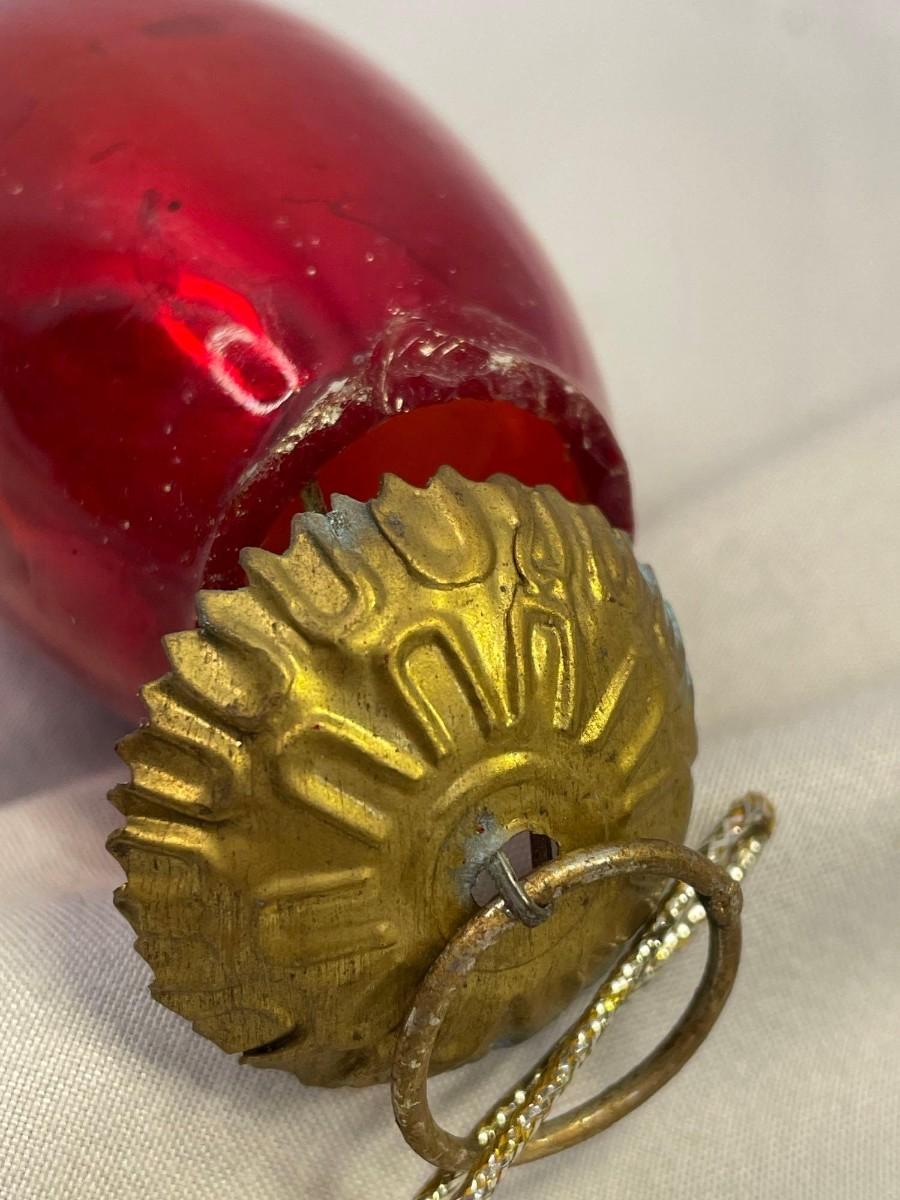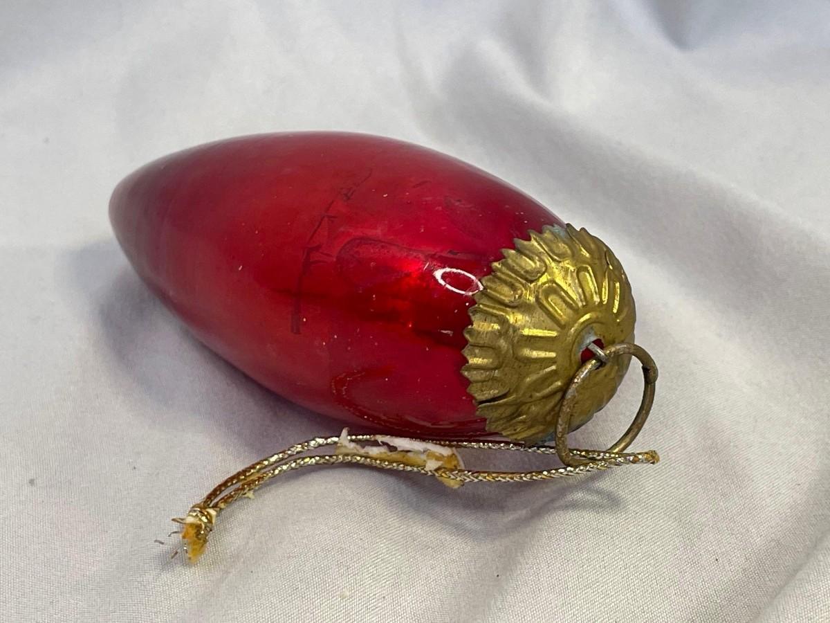 This ornament is in excellent condition with the only issue being that the brass cap is unattached (just needs to be re-glued). The ornament is about 4 inches long and made from a thicker glass with a silver paint inside and circa early 1900s. Kugel ornmanets were some of the first ornaments created in Germany and tended to be displayed separate of the tree due to size and weight.<br />