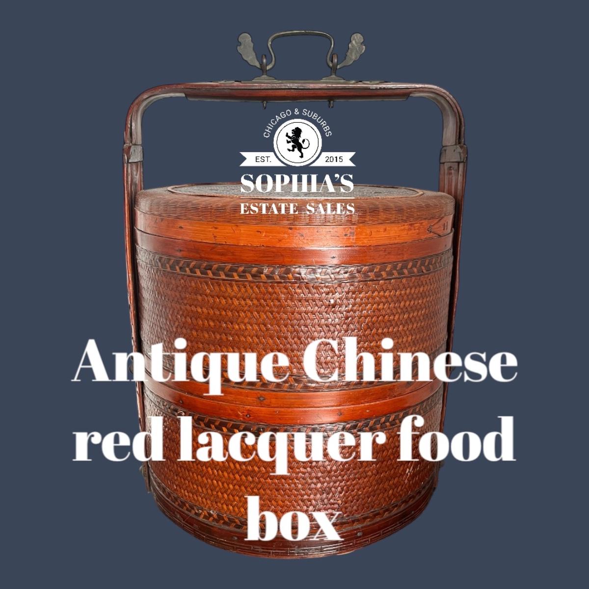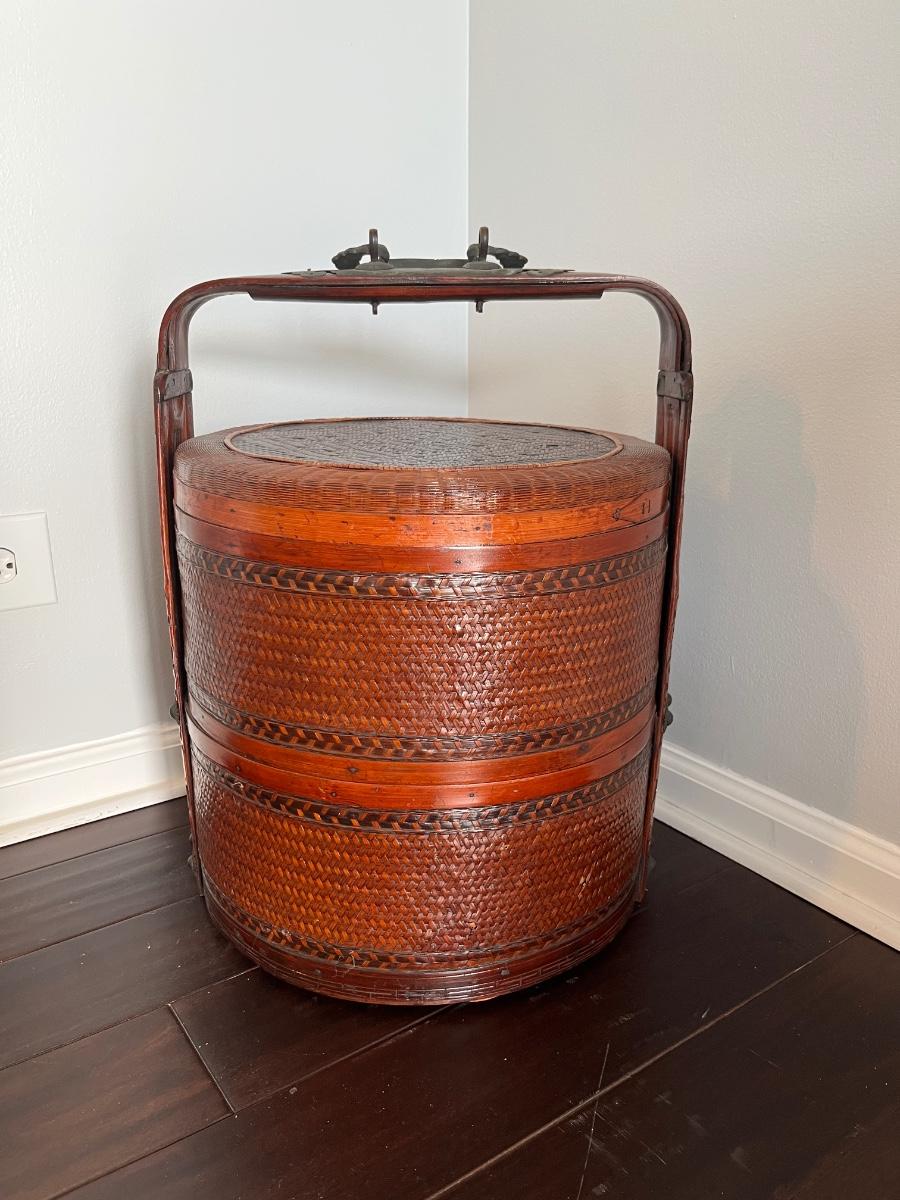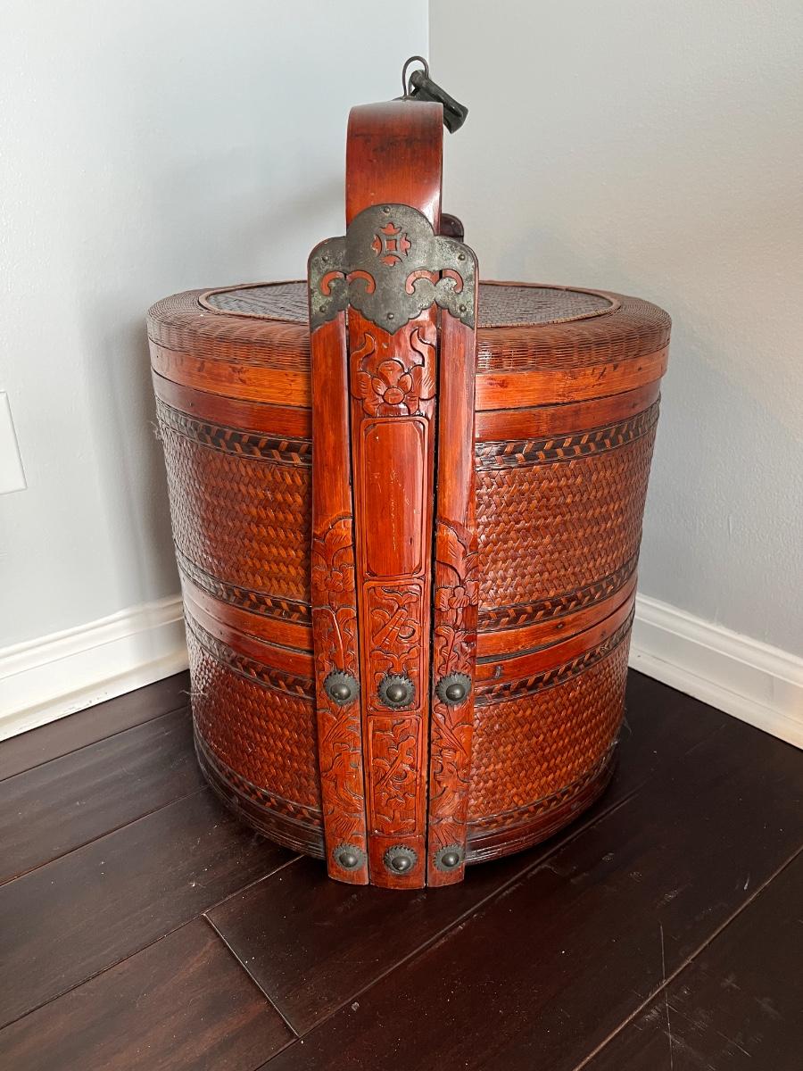 This antique Chinese food carrier is made of bamboo and lacquered a rich red with two compartments. It is marked with a Chinese customs stamp indicating that it is at least 100 years old. This item dates from the late 19th century. It is in excellent condition.