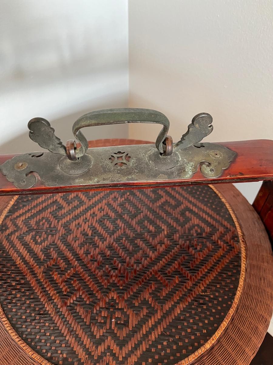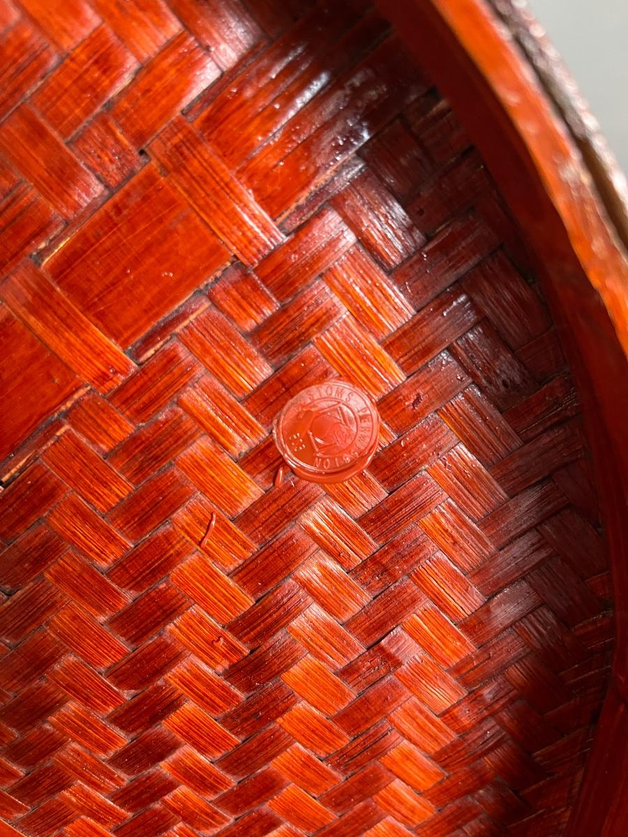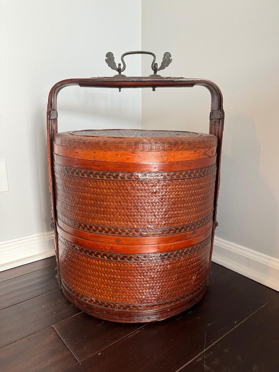 This antique Chinese food carrier is made of bamboo and lacquered a rich red with two compartments. It is marked with a Chinese customs stamp indicating that it is at least 100 years old. This item dates from the late 19th century. It is in excellent condition.