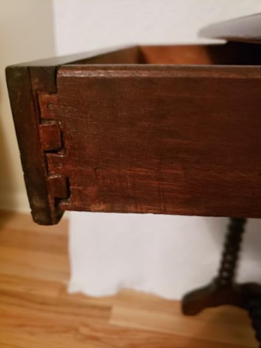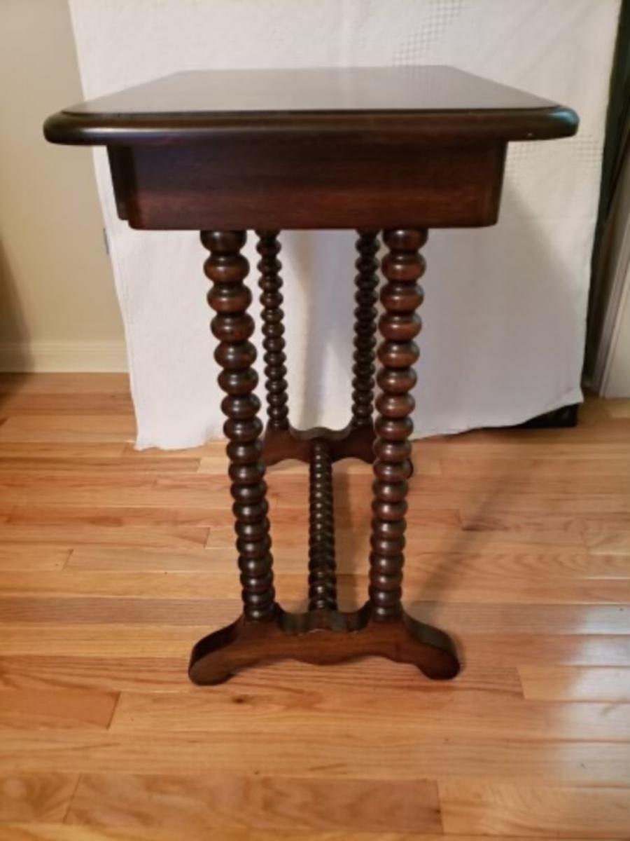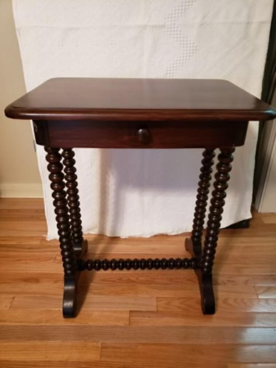 Antique ladies mahogany writing table. Spool turned legs and dove tail drawers. 24"W x 17"D x 29"H. Excellent condition.