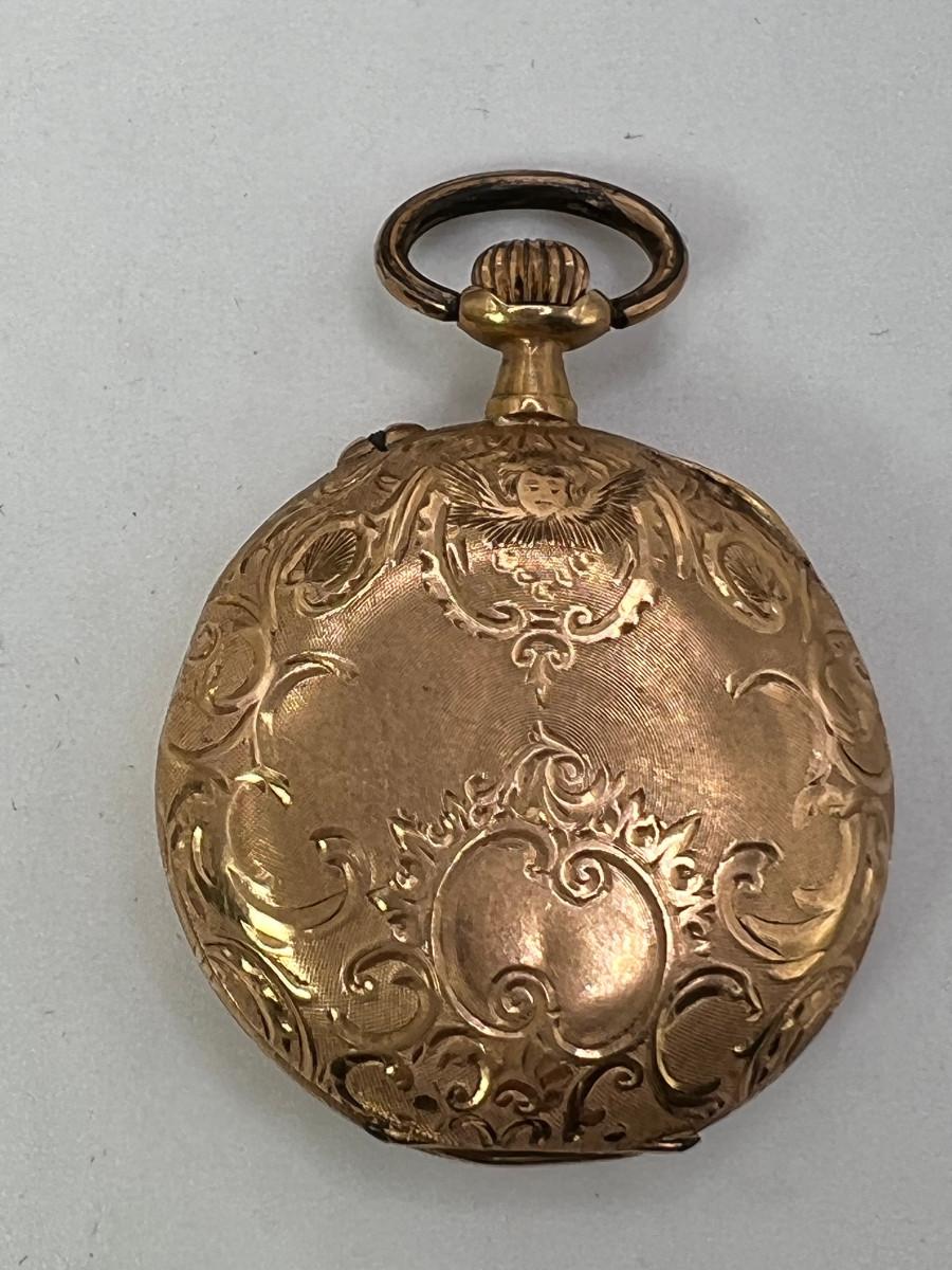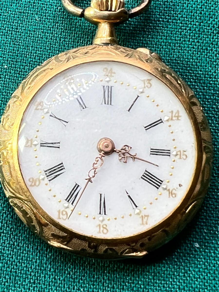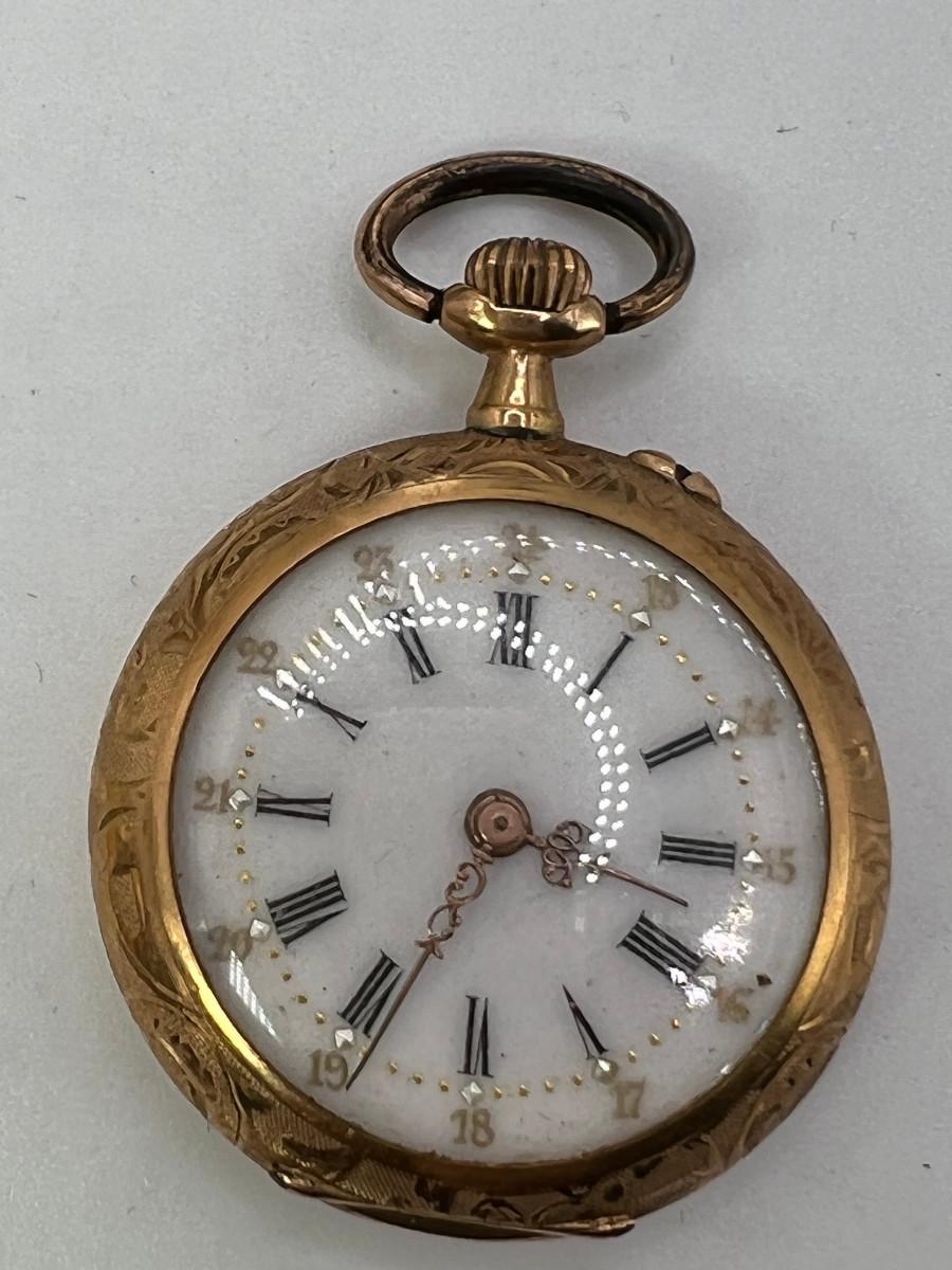 Engraved back and sides, Antique Ladies Pocket watch 18K Gold, tested working, 18.69 gross wt