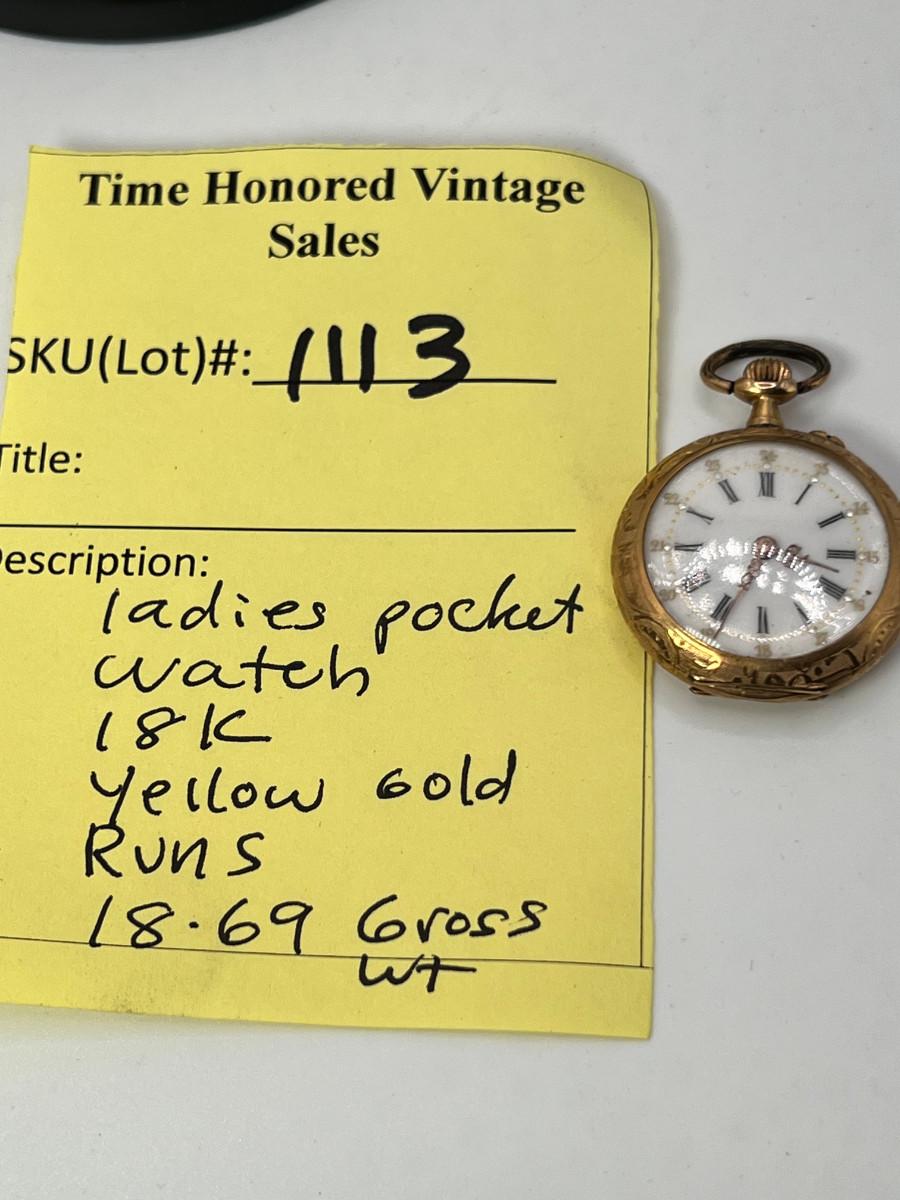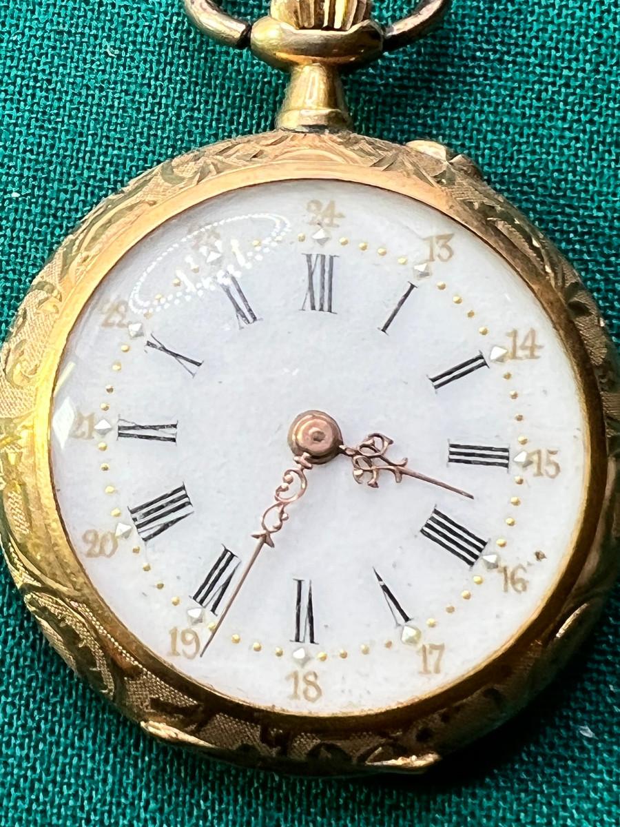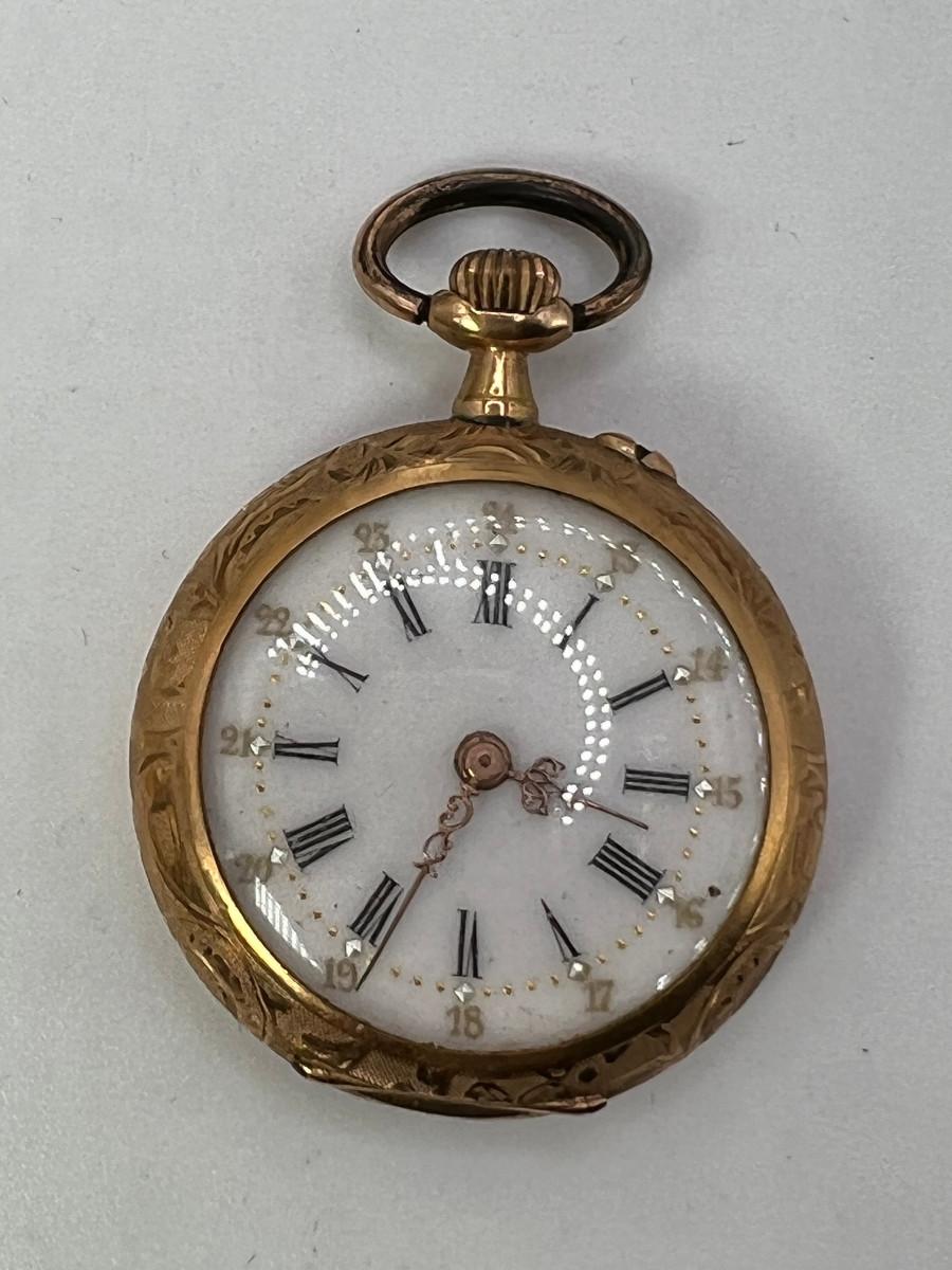Engraved back and sides, Antique Ladies Pocket watch 18K Gold, tested working, 18.69 gross wt