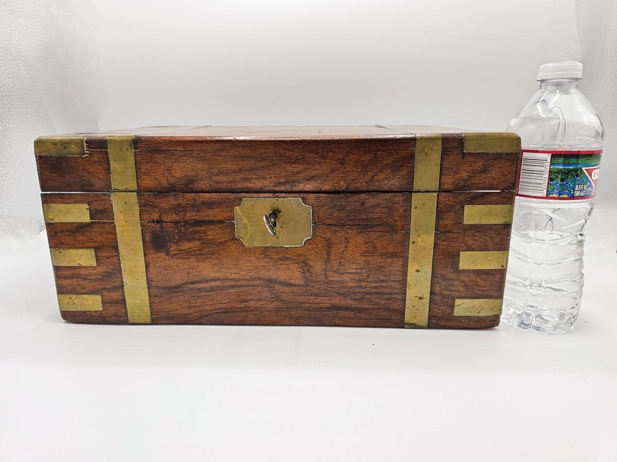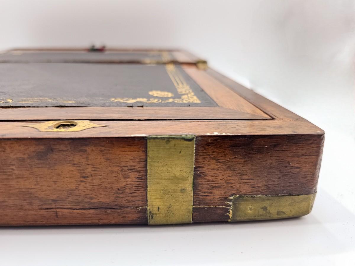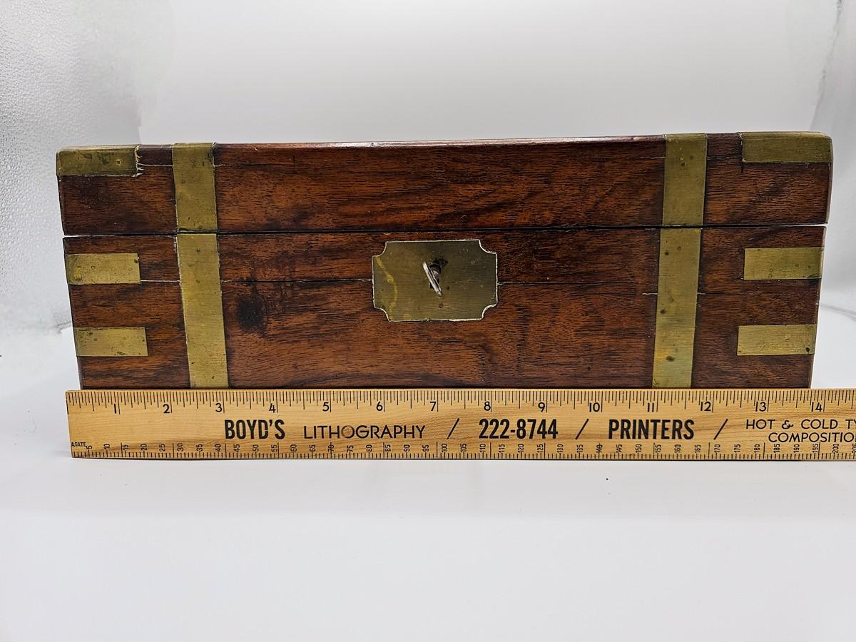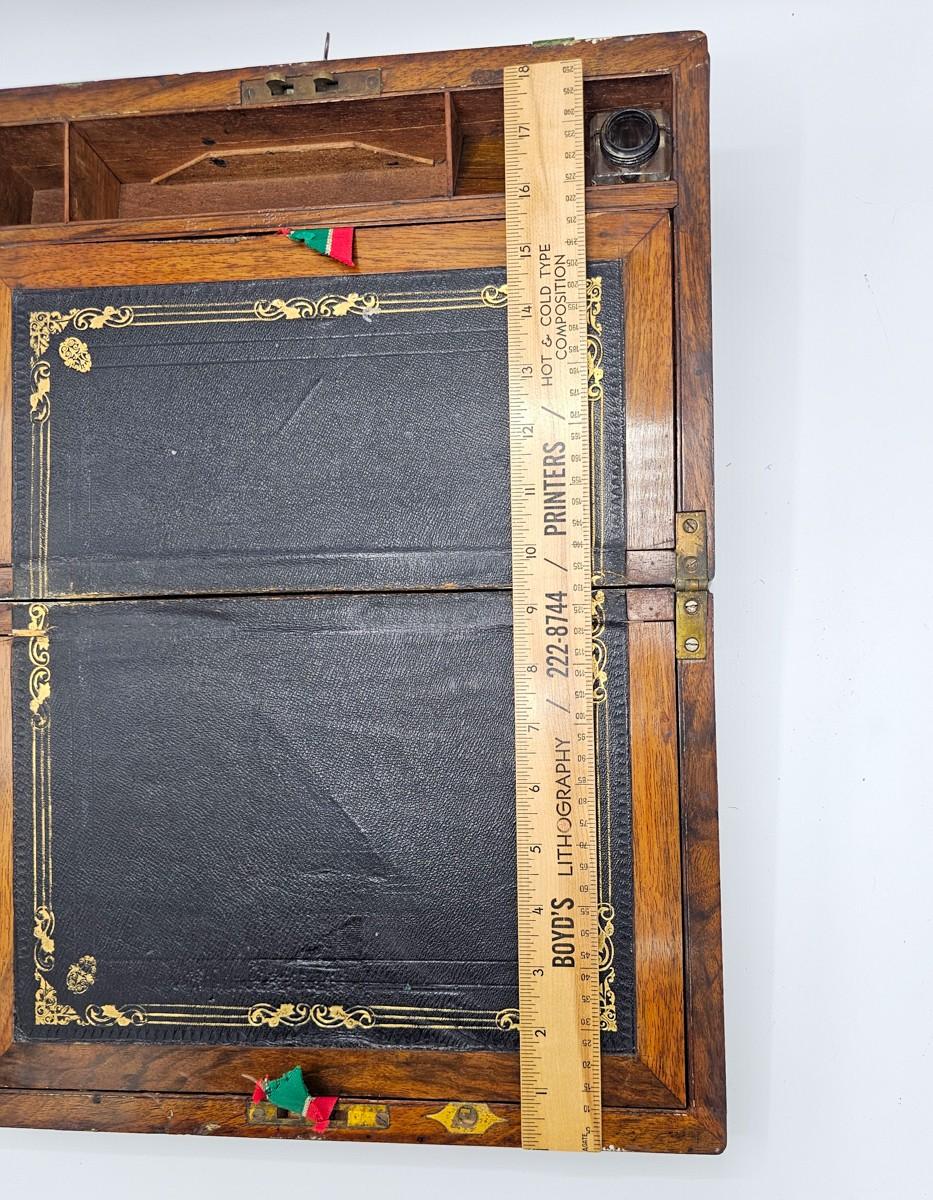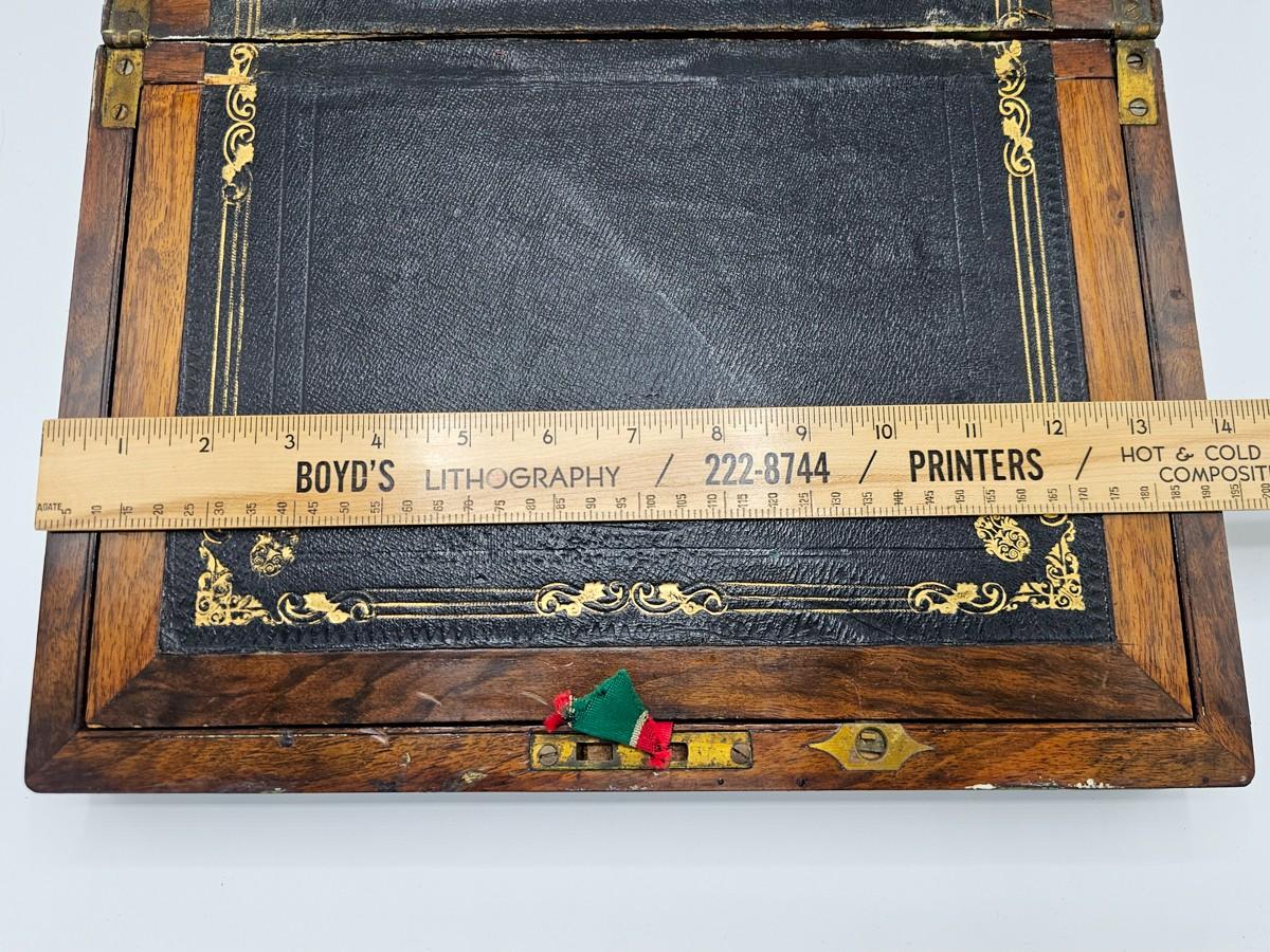 Beautiful antique lap desk with secret compartment. Condition is as shown in photos. Key is present, but lock needs repair. Please see photos for measurements.