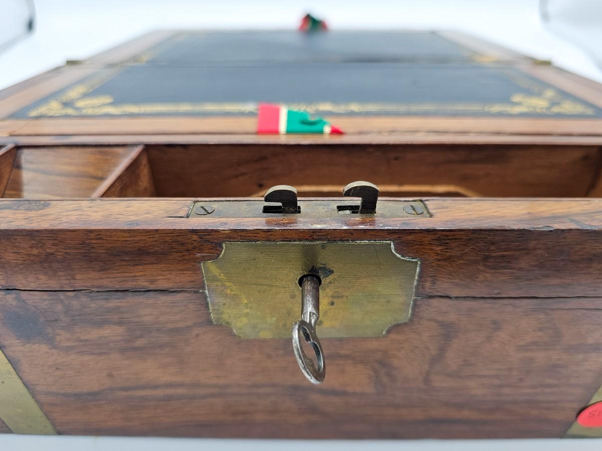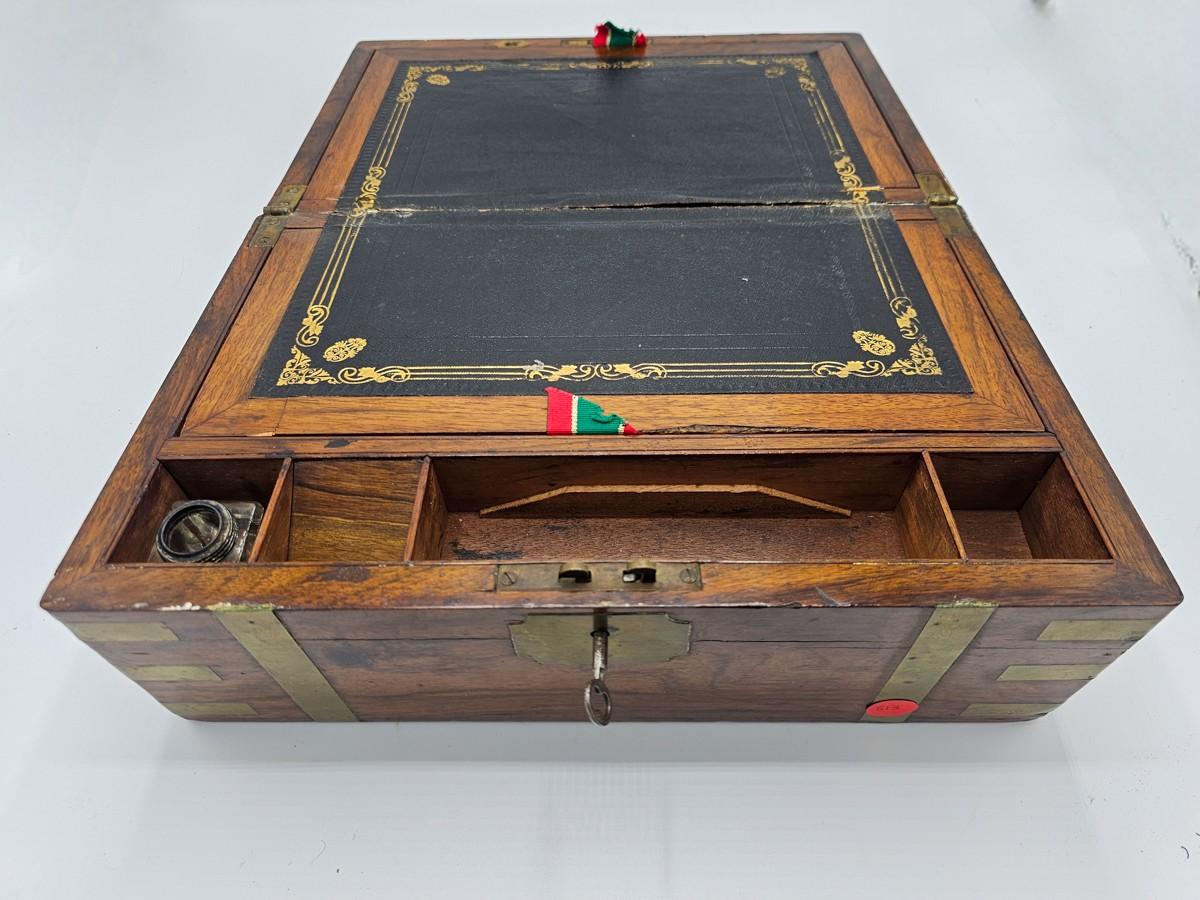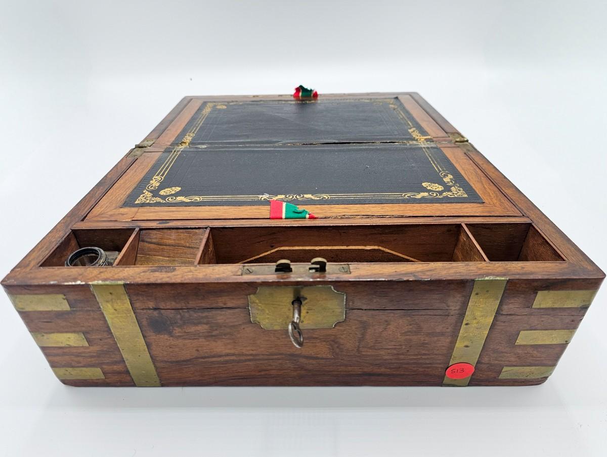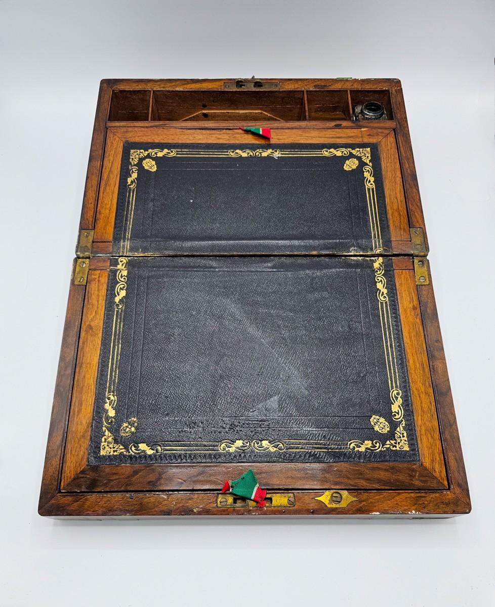 Beautiful antique lap desk with secret compartment. Condition is as shown in photos. Key is present, but lock needs repair. Please see photos for measurements.